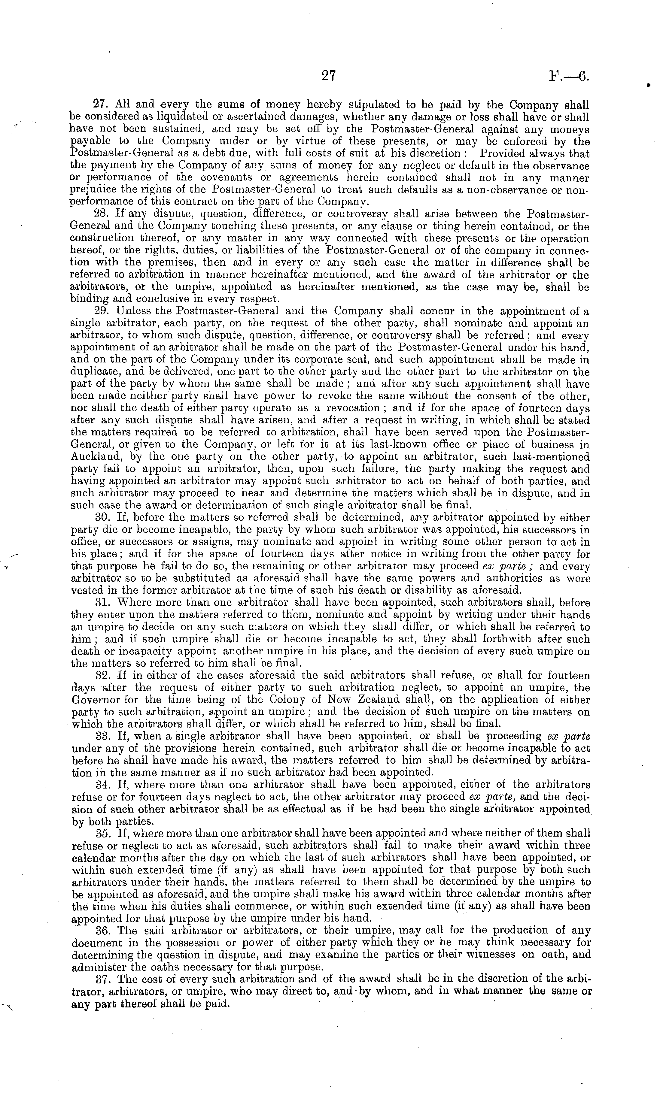 27. All and every the sums of money hereby stipulated to be paid by the Company shall be considered as liquidated or ascertained damages, whether any damage or loss shall have or shall have not been sustained, and may be set off" by the Postmaster-General against any moneys payable to the Company under or by virtue of these presents, or may be enforced by the Postmaster-General as a debt due, with full costs of suit at his discretion : Provided always that the payment by the Company of any sums of money for any neglect or default in the observance or performance of the covenants or agreements herein contained shall not in any manner prejudice the rights of the Postmaster-General to treat such defaults as a non-observance or nonperformance of this contract on the part of the Company. 28. If any dispute, question, difference, or controversy shall arise between the PostmasterGeneral and the Company touching these presents, or any clause or thing herein contained, or the construction thereof, or any matter in any way connected with these presents or the operation hereof, or the rights, duties, or liabilities of the Postmaster-General or of the company in connection with the premises, then and in every or any such case the matter in difference shall be referred to arbitration in manner hereinafter mentioned, and the award of the arbitrator or the arbitrators, or the umpire, appointed as hereinafter mentioned, as the case may be, shall be binding and conclusive in every respect. 29. Unless the Postmaster-General and the Company shall concur in the appointment of a single arbitrator, each party, on the request of the other party, shall nominate and appoint an arbitrator, to whom such dispute, question, difference, or controversy shall be referred; and every appointment of an arbitrator shall be made on the part of the Postmaster-General under his hand, and on the part of the Company under its corporate seal, and such appointment shall be made in duplicate, and be delivered, one part to the other party and the other part to the arbitrator on the part of the party by whom the same shall be made ; and after any such appointment shall have been made neither party shall have power to revoke the same without the consent of the other, nor shall the death of either party operate as a revocation ; and if for the space of fourteen days after any such dispute shall have arisen, and after a request in writing, in which shall be stated the matters required to be referred to arbitration, shall have been served upon the PostmasterGeneral, or given to the Company, or left for it at its last-known office or place of business in Auckland, by the one party on the other party, to appoint an arbitrator, such last-mentioned party fail to appoint an arbitrator, then, upon such failure, the party making the request and having appointed an arbitrator may appoint such arbitrator to act on behalf of both parties, and such arbitrator may proceed to hear and determine the matters which shall be in dispute, and in such case the award or determination of such single arbitrator shall be final. 30. If, before the matters so referred shall be determined, any arbitrator appointed by either party die or become incapable, the party by whom such arbitrator was appointed, his successors in office, or successors or assigns, may nominate and appoint in writing some other person to act in his place; and if for the space of fourteen days after notice in writing from the other party for that purpose he fail to do so, the remaining or other arbitrator may proceed ex parte ; and every arbitrator so to be substituted as aforesaid shall have the same powers and authorities as were vested in the former arbitrator at the time of such his death or disability as aforesaid. 31. Where more than one arbitrator shall have been appointed, such arbitrators shall, before they enter upon the matters referred to them, nominate and appoint by writing under their hands an umpire to decide on any such matters on which they shall differ, or which shall be referred to him ; and if such umpire shall die or become incapable to act, they shall forthwith after such death or incapacity appoint another umpire in his place, and the decision of every such umpire on the matters so referred to him shall be final. 32. If in either of the cases aforesaid the said arbitrators shall refuse, or shall for fourteen days after the request of either party to such arbitration neglect, to appoint an umpire, the Governor for the time being of the Colony of New Zealand shall, on the application of either party to such arbitration, appoint an umpire ; and the decision of such umpire on the matters on which the arbitrators shall differ, or which shall be referred to him, shall be final. 33. If, when a single arbitrator shall have been appointed, or shall be proceeding ex parte under any of the provisions herein contained, such arbitrator shall die or become incapable to act before he shall have made his award, the matters referred to him shall be determined by arbitration in the same manner as if no such arbitrator had been appointed. 34. If, where more than one arbitrator shall have been appointed, either of the arbitrators refuse or for fourteen days neglect to act, the other arbitrator may proceed ex parte, and the decision of such other arbitrator shall be as effectual as if he had been the single arbitrator appointed by both parties. 35. If, where more than one arbitrator shall have been appointed and where neither of them shall refuse or neglect to act as aforesaid, such arbitrators shall fail to make their award within three calendar months after the day on which the last of such arbitrators shall have been appointed, or within such extended time (if any) as shall have been appointed for that purpose by both such arbitrators under their hands, the matters referred to them shall be determined by the umpire to be appointed as aforesaid, and the umpire shall make his award within
