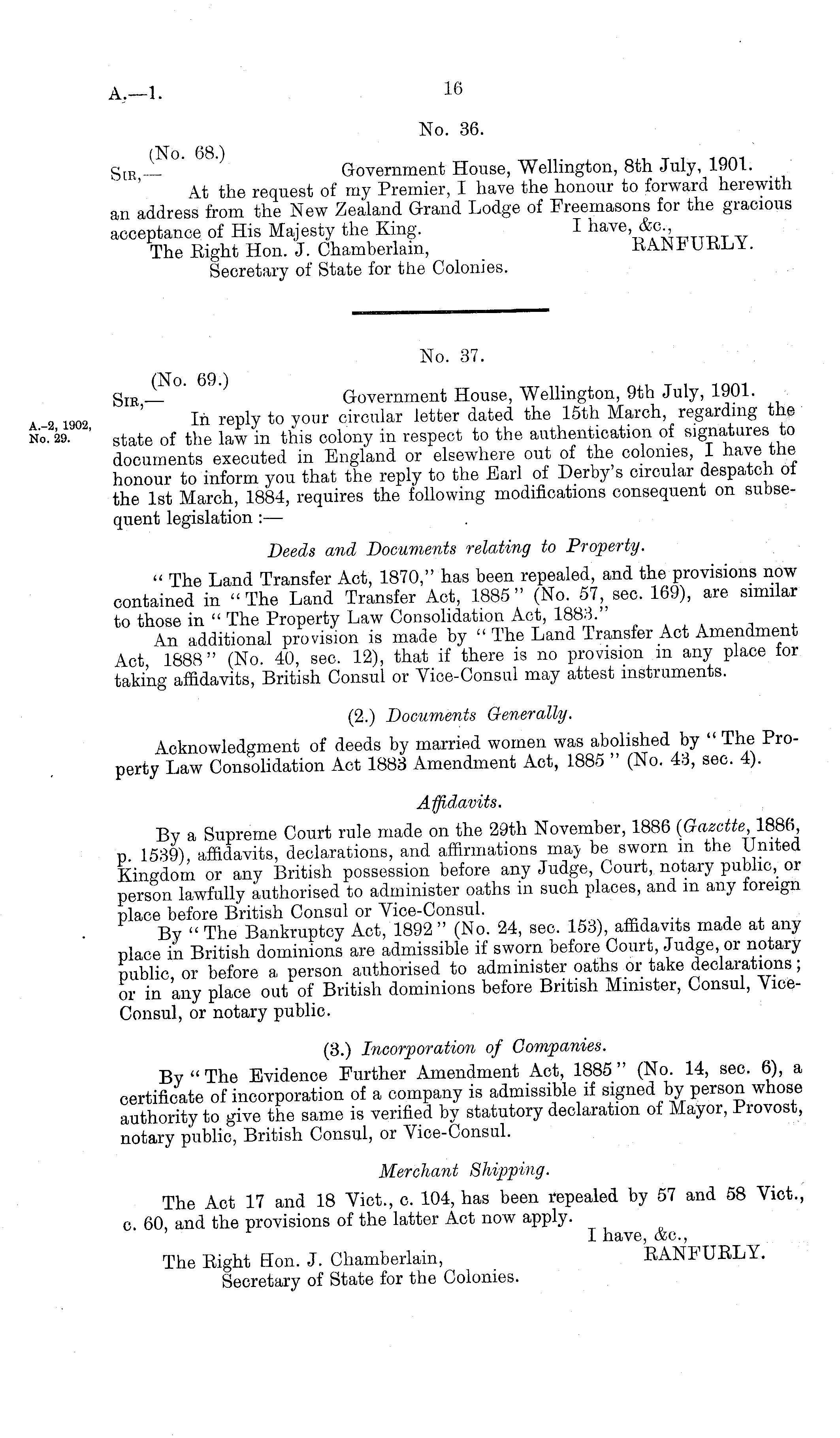 No. 37. Sir — ' Government House, Wellington, 9th July, 1901. In reply to your circular letter dated the 15th March, regarding the state of the law in this colony in respect to the authentication of signatures to documents executed in England or elsewhere out of the colonies, I have the honour to inform you that the reply to the Earl of Derby's circular despatch ot the Ist March, 1884, requires the following modifications consequent on subsequent legislation : — Deeds and Documents relating to Property. " The Land Transfer Act, 1870," has been repealed, and the provisions now contained in "The Land Transfer Act, 1885" (No. 57, sec. 169), are similar to those in " The Froperty Law Consolidation Act, 1883." An additional provision is made by " The Land Transfer Act Amendment Act 1888" (No. 40, sec. 12), that if there is no provision m any place tor taking affidavits, British Consul or Vice-Consul may attest instruments. (2.) Documents Generally. Acknowledgment of deeds by married women was abolished by " The Property Law Consolidation Act 1883 Amendment Act, 1885 " (No. 43, sec. 4). Affidavits. By a Supreme Court rule made on the 29th November, 1886 (Gazette 1886 n 1539), affidavits, declarations, and affirmations may be sworn in the United Kingdom or any British possession before any Judge, Court, notary public, or person lawfully authorised to administer oaths in such places, and in any foreign place before British Consul or Vice-Consul. By " The Bankruptcy Act, 1892 " (No. 24, sec. 153), affidavits made at any place in British dominions are admissible if sworn before Court, Judge, or notary nublic or before a person authorised to administer oaths or take declarations; or in 'any place out of British dominions before British Minister, Consul, ViceConsul, or notary public. (3.) Incorporation of Companies. By "The Evidence Further Amendment Act, 1885" (No. 14, sec. 6), a certificate of incorporation of a company is admissible if signed by person whose authority to give the same is verified by statutory declaration of Mayor, Provost, notary public, British Consul, or Vice-Consul. Merchant Shipping. The Act 17 and 18 Vict., c. 104, has been repealed by 57 and 58 Vict., c. 60, and the provisions of the latter Act now apply. I have, &c, The Eight Hon. J. Chamberlain, EANFUELY. Secretary of State for the Colonies.