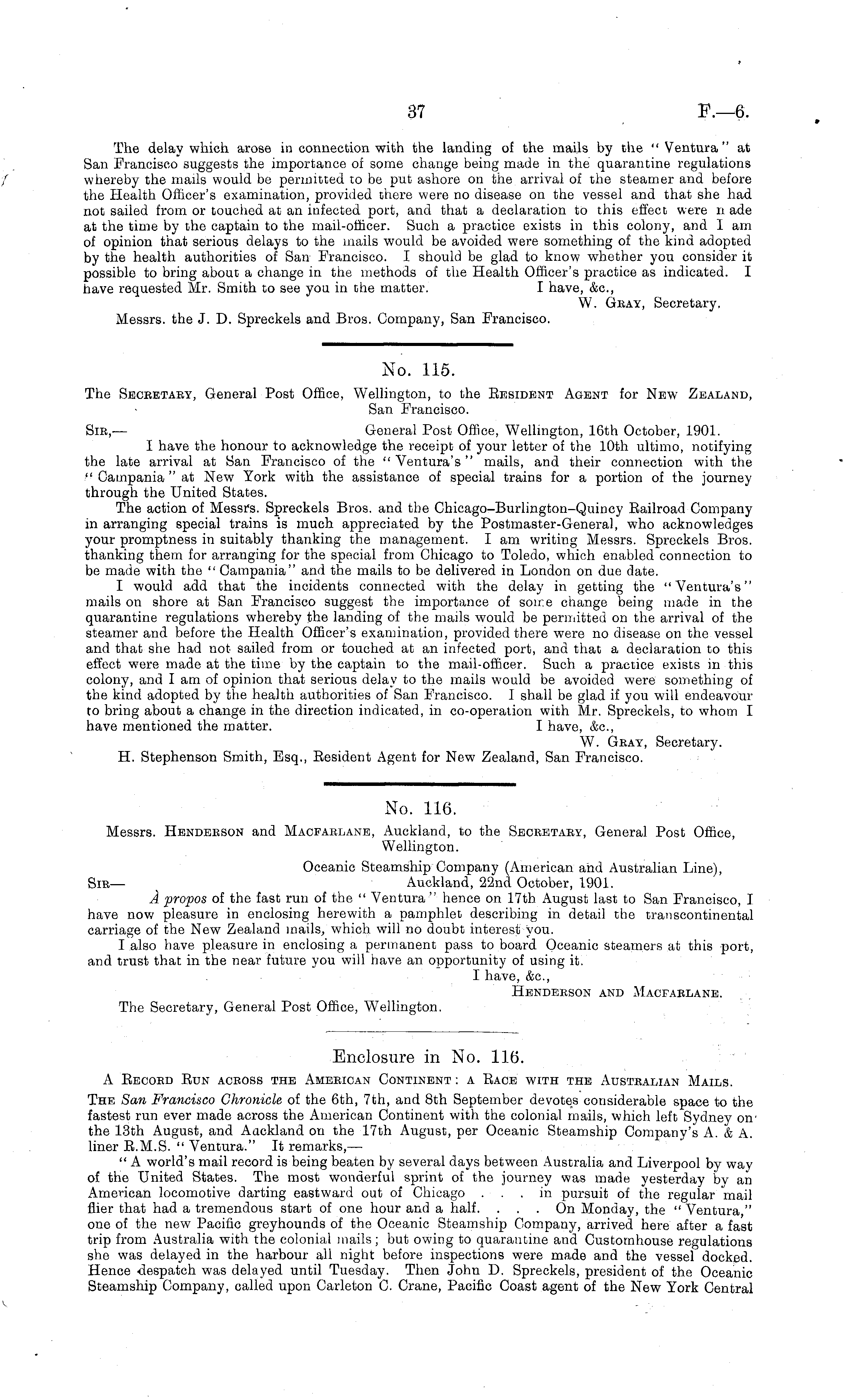 No. 115. The Secbetaey, General Post Office, Wellington, to the Eesidbnt Agent for New Zealand, San Francisco. Sib,— General Post Office, Wellington, 16th October, 1901. I have the honour to acknowledge the receipt of your letter of the 10th ultimo, notifying the late arrival at San Francisco of the " Ventura's" mails, and their connection with the " Campania " at New York with the assistance of special trains for a portion of the journey through the United States. The action of Messrs. Spreckels Bros, and the Chicago-Burlington-Quincy Eailroad Company in arranging special trains is much appreciated by the Postmaster-General, who acknowledges your promptness in suitably thanking the management. I am writing Messrs. Spreckels Bros, thanking them for arranging for the special from Chicago to Toledo, which enabled connection to be made with the " Campania" and the mails to be delivered in London on due date. I would add that the incidents connected with the delay in getting the "Ventura's" mails on shore at San Francisco suggest the importance of some change being made in the quarantine regulations whereby the landing of the mails would be permitted on the arrival of the steamer and before the Health Officer's examination, provided there were no disease on the vessel and that she had not sailed from or touched at an infected port, and that a declaration to this effect were made at the time by the captain to the mail-officer. Such a practice exists in this colony, and I am of opinion that serious delay to the mails would be avoided were something of the kind adopted by the health authorities of San Francisco. I shall be glad if you will endeavour to bring about a change in the direction indicated, in co-operation with Mr. Spreckels, to whom I have mentioned the matter. I have, &c, W. Gray, Secretary. H. Stephenson Smith, Esq., Eesident Agent for New Zealand, San Francisco.