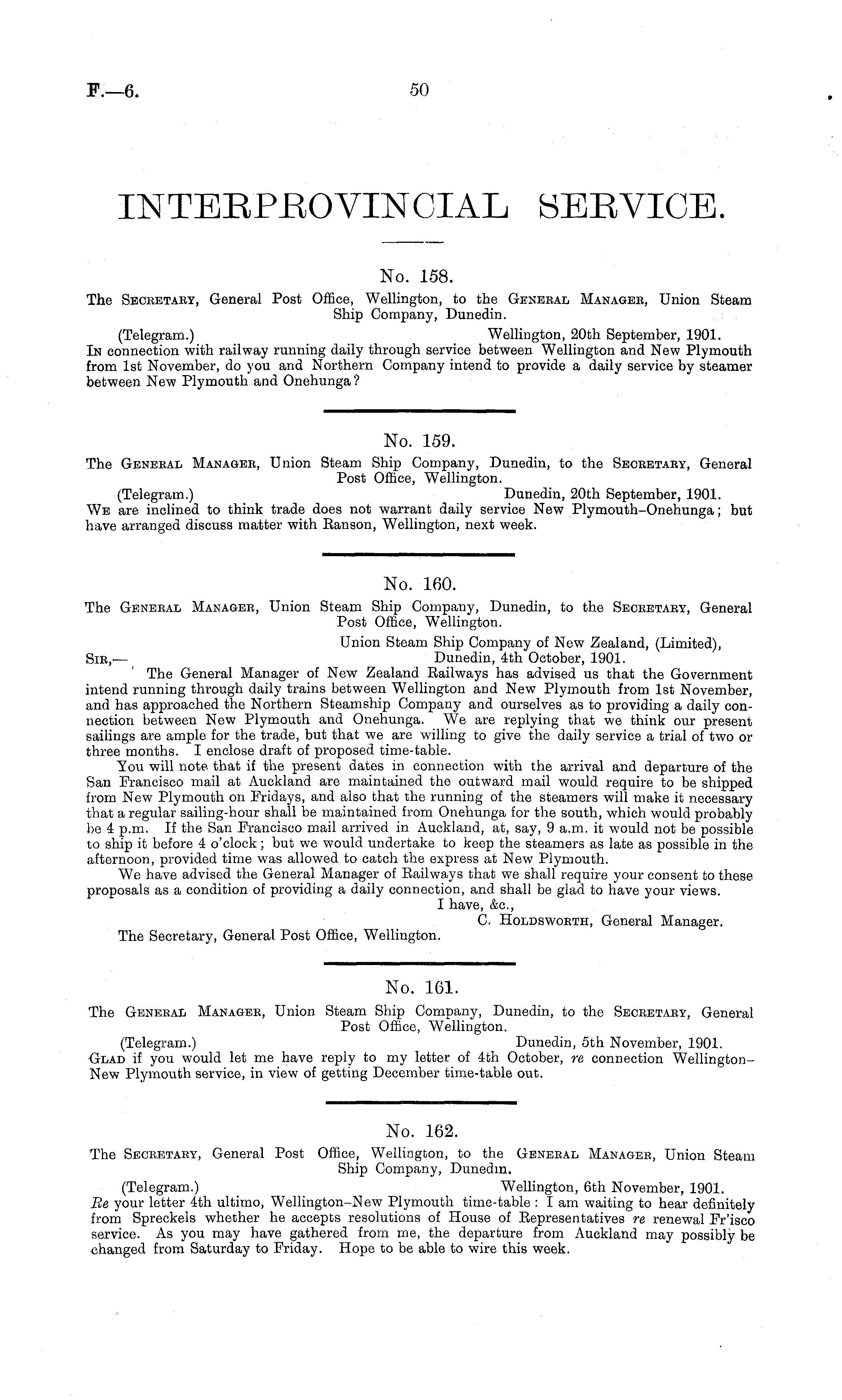 No. 158. The Secretary, General Post Office, Wellington, to the General Manager, Union Steam Ship Company, Dunedin. (Telegram.) Wellington, 20th September, 1901. In connection with railway running daily through service between Wellington and New Plymouth from Ist November, do you and Northern Company intend to provide a daily service by steamer between New Plymouth and Onehunga?
