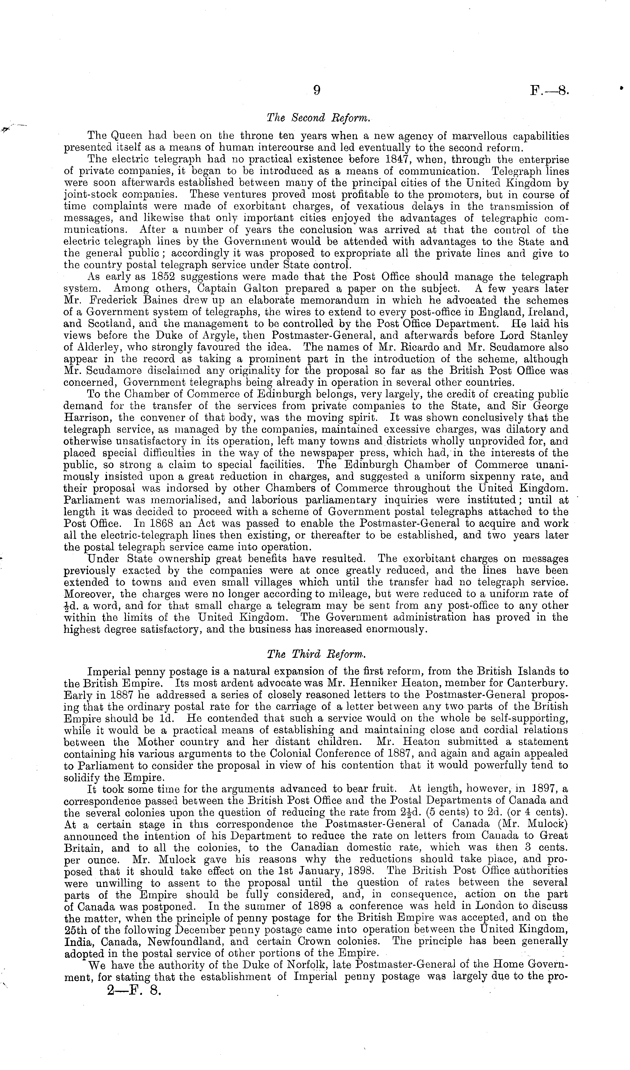 The Second Reform. The Queen had been on the throne ten years when a new agency of marvellous capabilities presented itself as a means of human intercourse and led eventually to the second reform. The electric telegraph had no practical existence before 1847, when, through the enterprise of private companies, it began to be introduced as a means of communication. Telegraph lines were soon afterwards established between many of the principal cities of the United Kingdom by joint-stock companies. These ventures proved most profitable to the promoters, but in course of time complaints were made of exorbitant charges, of vexatious delays in the transmission of messages, and likewise that only important cities enjoyed the advantages of telegraphic communications. After a number of years the conclusion was arrived at that the control of the electric telegraph lines by the Government would be attended with advantages to the State and the general public ; accordingly it was proposed to expropriate all the private lines and give to the country postal telegraph service under State control. As early as 1852 suggestions were made that the Post Office should manage the telegraph system. Among others, Captain Galton prepared a paper on the subject. A few years later Mr. Frederick Baines drew up an elaborate memorandum in which he advocated the schemes of a Government system of telegraphs, the wires to extend to every post-office in England, Ireland, and Scotland, and the management to be controlled by the Post Office Department. He laid his views before the Duke of Argyle, then Postmaster-General, and afterwards before Lord Stanley of Alderley, who strongly favoured the idea. The names of Mr. Bicardo and Mr. Scudamore also appear in the record as taking a prominent part in the introduction of the scheme, although Mr. Scudamore disclaimed any originality for the proposal so far as the British Post Office was concerned, Government telegraphs being already in operation in several other countries. To the Chamber of Commerce of Edinburgh belongs, very largely, the credit of creating public demand for the transfer of the services from private companies to the State, and Sir George Harrison, the convener of that body, was the moving spirit. It was shown conclusively that the telegraph service, as managed by the companies, maintained excessive charges, was dilatory and otherwise unsatisfactory in its operation, left many towns and districts wholly unprovided for, and placed special difficulties in the way of the newspaper press, which had, in the interests of the public, so strong a claim to special facilities. The Edinburgh Chamber of Commerce unanimously insisted upon a great reduction in charges, and suggested a uniform sixpenny rate, and their proposal was indorsed by other Chambers of Commerce throughout the United Kingdom. Parliament was memorialised, and laborious parliamentary inquiries were instituted; until at length it was decided to proceed with a scheme of Government postal telegraphs attached to the Post Office. In 1868 an Act was passed to enable the Postmaster-General to acquire and work all the electric-telegraph lines then existing, or thereafter to be established, and two years later the postal telegraph service came into operation. Under State ownership great benefits have resulted. The exorbitant charges on messages previously exacted by the companies were at once greatly reduced, and the lines have been extended to towns and even small villages which until the transfer had no telegraph service. Moreover, the charges were no longer according to mileage, but were reduced to a uniform rate of £d. a word, and for that small charge a telegram may be sent from any post-office to any other within the limits of the United Kingdom. The Government administration has proved in the highest degree satisfactory, and the business has increased enormously. The Third Reform.. Imperial penny postage is a natural expansion of the first reform, from the British Islands to the British Empire. Its most ardent advocate was Mr. Henniker Heaton, member for Canterbury. Early in 1887 he addressed a series of closely reasoned letters to the Postmaster-General proposing that the ordinary postal rate for the carriage of a letter between any two parts of the British Empire should be Id. He contended that such a service would on the whole be self-supporting, while it would be a practical means of establishing and maintaining close and cordial relations between the Mother country and her distant children. Mr. Heaton submitted a statement containing his various arguments to the Colonial Conference of 1887, and again and again appealed to Parliament to consider the proposal in view of his contention that it would powerfully tend to solidify the Empire. It took some time for the arguments advanced to bear fruit. At length, however, in 1897, a correspondence passed between the British Post Office and the Postal Departments of Canada and the several colonies upon the question of reducing the rate from 2-Jd. (5 cents) to 2d. (or 4 cents). At a certain stage in this correspondence the Postmaster-General of Canada (Mr. Mulock) announced the intention of his Department to reduce the rate on letters from Canada to Great Britain, and to all the colonies, to the Canadian domestic rate, which was then 3 cents, per ounce. Mr. Mulock gave his reasons why the reductions should take place, and proposed that it should take effect on the Ist January, 1898. The British Post Office authorities were unwilling to assent to the proposal until the question of rates between the several parts of the Empire should be fully considered, and, in consequence, action on the part of Canada was postponed. In the summer of 1898 a conference was held in London to discuss the matter, when the principle of penny postage for the British Empire was accepted, and on the 25th of the following December penny postage came into operation between the United Kingdom