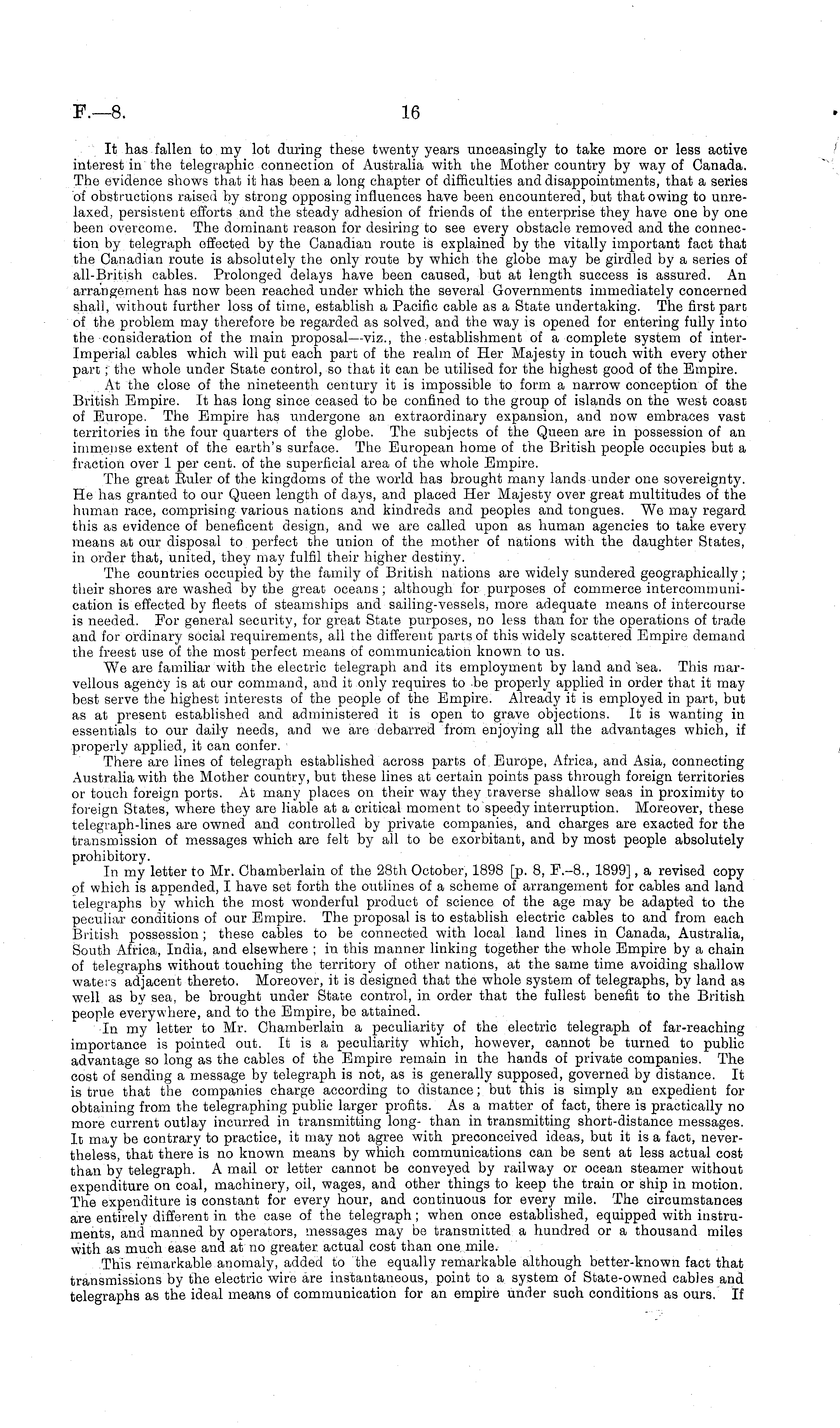 It has fallen to my lot during these twenty years unceasingly to take more or less active interest in the telegraphic connection of Australia with the Mother country by way of Canada. The evidence shows that it has been a long chapter of difficulties and disappointments, that a series of obstructions raised by strong opposing influences have been encountered, but that owing to unrelaxed, persistent efforts and the steady adhesion of friends of the enterprise they have one by one been overcome. The dominant reason for desiring to see every obstacle removed and the connection by telegraph effected by the Canadian route is explained by the vitally important fact that the Canadian route is absolutely the only route by which the globe may be girdled by a series of all-British cables. Prolonged delays have been caused, but at length success is assured. An arrangement has now been reached under which the several Governments immediately concerned shall, without further loss of time, establish a Pacific cable as a State undertaking. The first part of the problem may therefore be regarded as solved, and the way is opened for entering fully into the consideration of the main proposal—viz., the establishment of a complete system of interImperial cables which will put each part of the realm of Her Majesty in touch with every other part ; the whole under State control, so that it can be utilised for the highest good of the Empire. At the close of the nineteenth century it is impossible to form a narrow conception of the British Empire. It has long since ceased to be confined to the group of islands on the west coast of Europe. The Empire has undergone an extraordinary expansion, and now embraces vast territories in the four quarters of the globe. The subjects of the Queen are in possession of an immense extent of the earth's surface. The European home of the British people occupies but a fraction over 1 per cent, of the superficial area of the whole Empire. The great Buler of the kingdoms of the world has brought many lands under one sovereignty. He has granted to our Queen length of days, and placed Her Majesty over great multitudes of the human race, comprising various nations and kindreds and peoples and tongues. We may regard this as evidence of beneficent design, and we are called upon as human agencies to take every means at our disposal to perfect the union of the mother of nations with the daughter States, in order that, united, they may fulfil their higher destiny. The countries occupied by the family of British nations are widely sundered geographically; their shores are washed by the great oceans; although for purposes of commerce intercommunication is effected by fleets of steamships and sailing-vessels, more adequate means of intercourse is needed. For general security, for great State purposes, no less than for the operations of trade and for ordinary social requirements, all the different parts of this widely scattered Empire demand the freest use of the most perfect means of communication known to us. We are familiar with the electric telegraph and its employment by land and sea. This marvellous agency is at our command, and it only requires to be properly applied in order that it may best serve the highest interests of the people of the Empire. Already it is employed in part, but as at present established and. administered it is open to grave objections. It is wanting in essentials to our daily needs, and we are debarred from enjoying all the advantages which, if properly applied, it can confer. There are lines of telegraph established across parts of Europe, Africa, and Asia, connecting Australia with the Mother country, but these lines at certain points pass through foreign territories or touch foreign ports. At many places on their way they traverse shallow seas in proximity to foreign States, where they are liable at a critical moment to speedy interruption. Moreover, these telegraph-lines are owned and controlled by private companies, and charges are exacted for the transmission of messages which are felt by all to be exorbitant, and by most people absolutely prohibitory. In my letter to Mr. Chamberlain of the 28th October, 1898 [p. 8, F.-8., 1899], a revised copy of which is appended, I have set forth the outlines of a scheme of arrangement for cables and land telegraphs by which the most wonderful product of science of the age may be adapted to the peculiar conditions of our Empire. The proposal is to establish electric cables to and from each British possession ; these cables to be connected with local land lines in Canada, Australia, South Africa, India, and elsewhere ; in this manner linking together the whole Empire by a chain of telegraphs without touching the territory of other nations, at the same time avoiding shallow waters adjacent thereto. Moreover, it is designed that the whole system of telegraphs, by land as well as by sea, be brought under State control, in order that the fullest benefit to the British people everywhere, and to the Empire, be attained. In my letter to Mr. Chamberlain a peculiarity of the electric telegraph of far-reaching importance is pointed out. It is a peculiarity which, however, cannot be turned to public advantage so long as the cables of the Empire remain in the hands of private companies. The cost of sending a message by telegraph is not, as is generally supposed, governed by distance. It is true that the companies charge according to distance; but this is simply an expedient for obtaining from the telegraphing public larger profits. As a matter of fact, there is practically no more current outlay incurred in transmitting long- than in transmitting short-distance messages. It may be contrary to practice, it may not agree with preconceived ideas, but it is a fact, nevertheless, that there is no known means by which communications can be sent at less actual cost than by telegraph. A mail or letter cannot be conveyed by railway or ocean st