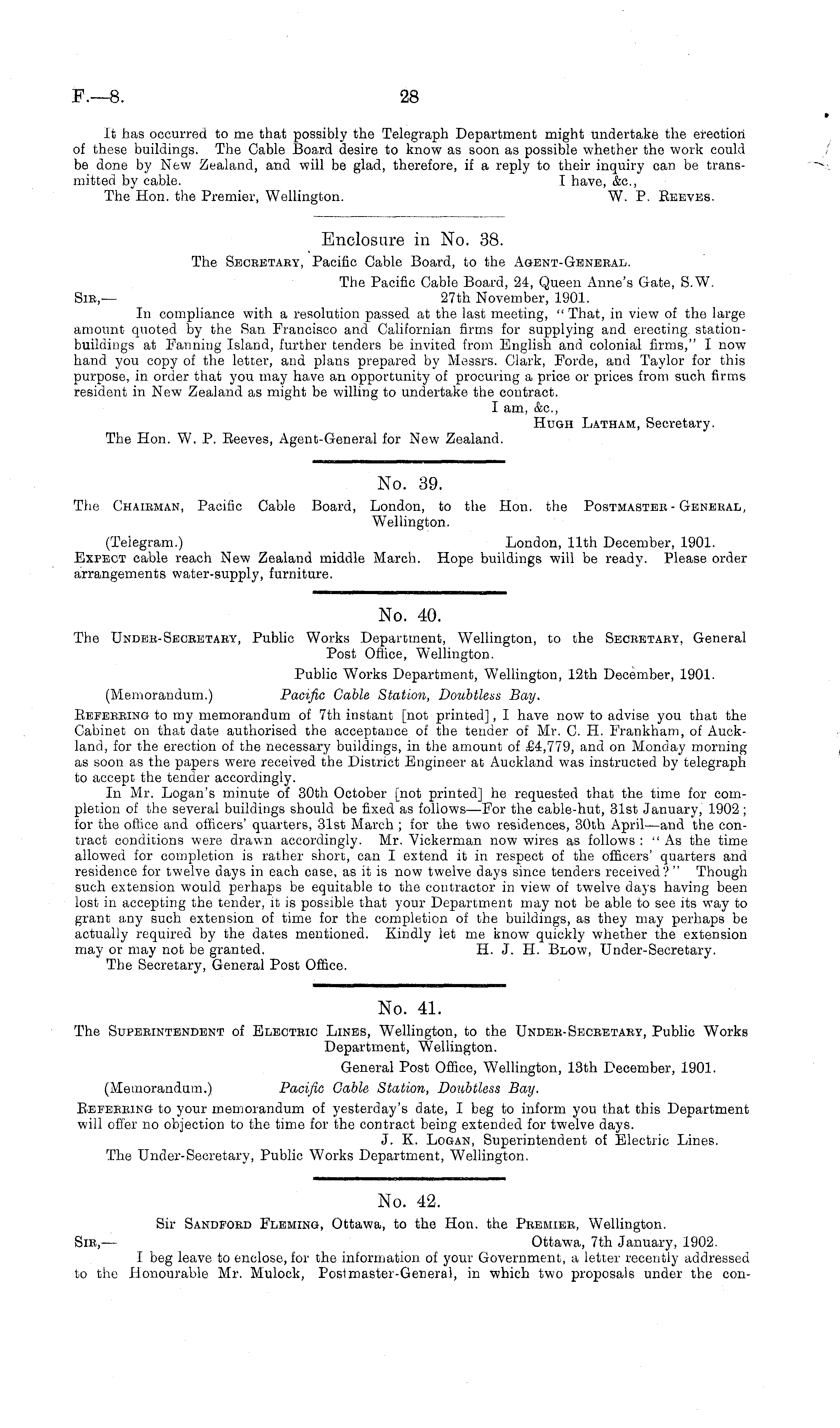 No. 40. The Under-Secretary, Public Works Department, Wellington, to the Secretary, General Post Office, Wellington. Public Works Department, Wellington, 12th December, 1901. (Memorandum.) Pacific Cable Station, Doubtless Bay. Beferring to my memorandum of 7th instant [not printed], I have now to advise you that the Cabinet on that date authorised the acceptance of the tender of Mr. C. H. Frankham, of Auckland, for the erection of the necessary buildings, in the amount of £4,779, and on Monday morning as soon as the papers were received the District Engineer at Auckland was instructed by telegraph to accept the tender accordingly. In Mr. Logan's minute of 30th October [not printed] he requested that the time for completion of the several buildings should be fixed as follows—For the cable-hut, 31st January, 1902 ; for the office and officers' quarters, 31st March ; for the two residences, 30th April—and the contract conditions were drawn accordingly. Mr. Vickerman now wires as follows : "As the time allowed for completion is rather short, can I extend it in respect of the officers' quarters and residence for twelve days in each case, as it is now twelve days since tenders received? " Though such extension would perhaps be equitable to the contractor in view of twelve days having been lost in accepting the tender, it is possible that your Department may not be able to see its way to grant any such extension of time for the completion of the buildings, as they may perhaps be actually required by the dates mentioned. Kindly let me know quickly whether the extension may or may not be granted. H. J. H. Blow, Under-Secretary. The Secretary, General Post Office.