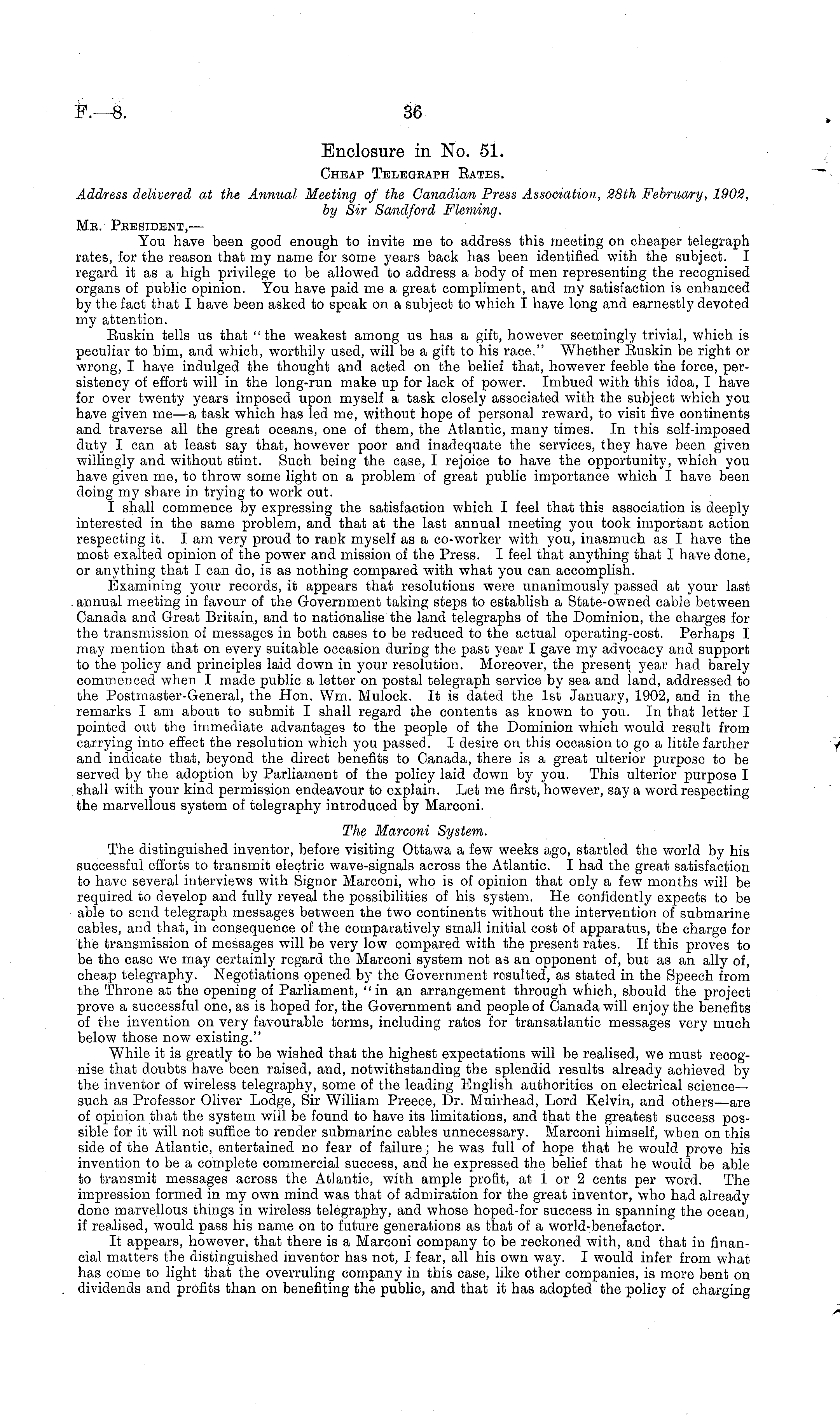 Enclosure in No. 51. Cheap Telegraph Bates. Address delivered at the Annual Meeting of the Canadian Press Association, 28th February, 1902, by Sir Sandford Fleming. Mr. President,- — You have been good enough to invite me to address this meeting on cheaper telegraph rates, for the reason that my name for some years back has been identified with the subject. I regard it as a high privilege to be allowed to address a body of men representing the recognised organs of public opinion. You have paid me a great compliment, and my satisfaction is enhanced by the fact that I have been asked to speak on a subject to which I have long and earnestly devoted my attention. Buskin tells us that " the weakest among us has a gift, however seemingly trivial, which is peculiar to him, and which, worthily used, will be a gift to his race." Whether Buskin be right or wrong, I have indulged the thought and acted on the belief that, however feeble the force, persistency of effort will in the long-run make up for lack of power. Imbued with this idea, I have for over twenty years imposed upon myself a task closely associated with the subject which you have given me—a task which has led me, without hope of personal reward, to visit five continents and traverse all the great oceans, one of them, the Atlantic, many times. In this self-imposed duty I can at least say that, however poor and inadequate the services, they have been given willingly and without stint. Such being the case, I rejoice to have the opportunity, which you have given me, to throw some light on a problem of great public importance which I have been doing my share in trying to work out. I shall commence by expressing the satisfaction which I feel that this association is deeply interested in the same problem, and that at the last annual meeting you took important action respecting it. lam very proud to rank myself as a co-worker with you, inasmuch as I have the most exalted opinion of the power and mission of the Press. I feel that anything that I have done, or anything that I can do, is as nothing compared with what you can accomplish. Examining your records, it appears that resolutions were unanimously passed at your last annual meeting in favour of the Government taking steps to establish a State-owned cable between Canada and Great Britain, and to nationalise the land telegraphs of the Dominion, the charges for the transmission of messages in both cases to be reduced to the actual operating-cost. Perhaps I may mention that on every suitable occasion during the past year I gave my advocacy and support to the policy and principles laid down in your resolution. Moreover, the present year had barely commenced when I made public a letter on postal telegraph service by sea and land, addressed to the Postmaster-General, the Hon. Wm. Mulock. It is dated the Ist January, 1902, and in the remarks I am about to submit I shall regard the contents as known to you. In that letter I pointed out the immediate advantages to the people of the Dominion which would result from carrying into effect the resolution which you passed. I desire on this occasion to go a little farther and indicate that, beyond the direct benefits to Canada, there is a great ulterior purpose to be served by the adoption by Parliament of the policy laid down by you. This ulterior purpose I shall with your kind permission endeavour to explain. Let me first, however, say a word respecting the marvellous system of telegraphy introduced by Marconi. The Marconi System. The distinguished inventor, before visiting Ottawa a few weeks ago, startled the world by his successful efforts to transmit electric wave-signals across the Atlantic. I had the great satisfaction to have several interviews with Signor Marconi, who is of opinion that only a few months will be required to develop and fully reveal the possibilities of his system. He confidently expects to be able to send telegraph messages between the two continents without the intervention of submarine cables, and that, in consequence of the comparatively small initial cost of apparatus, the charge for the transmission of messages will be very low compared with the present rates. If this proves to be the case we may certainly regard the Marconi system not as an opponent of, but as an ally of, cheap telegraphy. Negotiations opened by the Government resulted, as stated in the Speech from the Throne at the opening of Parliament, "in an arrangement through which, should the project prove a successful one, as is hoped for, the Government and people of Canada will enjoy the benefits of the invention on very favourable terms, including rates for transatlantic messages very much below those now existing." While it is greatly to be wished that the highest expectations will be realised, we must recognise that doubts have been raised, and, notwithstanding the splendid results already achieved by the inventor of wireless telegraphy, some of the leading English authorities on electrical sciencesuch as Professor Oliver Lodge, Sir William Preece, Dr. Muirhead, Lord Kelvin, and others—are of opinion that the system will be found to have its limitations, and that the greatest success possible for it will not suffice to render submarine cables unnecessary. Marconi himself, when on this side of the Atlantic, entertained no fear of failure; he was full of hope that he would prove his invention to be a complete commercial success, and he expressed the belief that he would be able to transmit messages across the Atlantic, with ample profit, at lor 2 cents per word. The impression formed in my own mind was that of admiration for the great inventor, who had already done marvellous things in wireless telegraphy, and whose hoped-for success in spanning the ocean, if realised, would pass his name on to future generations as that of a world-benefactor. It appears, however, that there is a Marconi company to be reckoned with, and that in financial matters the distingu