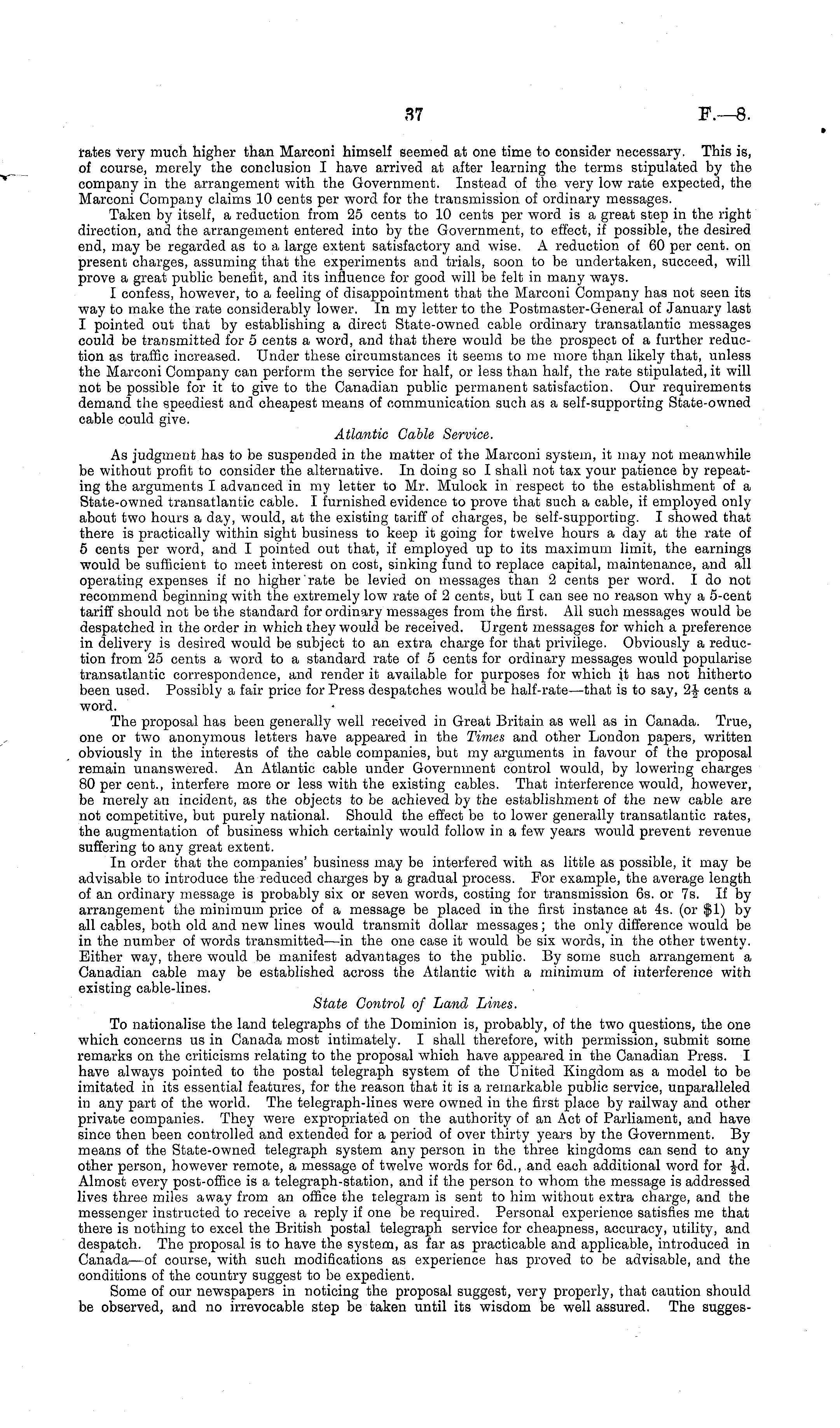 rates very much higher than Marconi himself seemed at one time to consider necessary. This is, of course, merely the conclusion I have arrived at after learning the terms stipulated by the company in the arrangement with the Government. Instead of the very low rate expected, the Marconi Company claims 10 cents per word for the transmission of ordinary messages. Taken by itself, a reduction from 25 cents to 10 cents per word is a great step in the right direction, and the arrangement entered into by the Government, to effect, if possible, the desired end, may be regarded as to a large extent satisfactory and wise. A reduction of 60 per cent, on present charges, assuming that the experiments and trials, soon to be undertaken, succeed, will prove a great public benefit, and its influence for good will be felt in many ways. I confess, however, to a feeling of disappointment that the Marconi Company has not seen its way to make the rate considerably lower. In my letter to the Postmaster-General of January last I pointed out that by establishing a direct State-owned cable ordinary transatlantic messages could be transmitted for 5 cents a word, and that there would be the prospect of a further reduction as traffic increased. Under these circumstances it seems to me more than likely that, unless the Marconi Company can perform the service for half, or less than half, the rate stipulated, it will not be possible for it to give to the Canadian public permanent satisfaction. Our requirements demand the speediest and cheapest means of communication such as a self-supporting State-owned cable could give. Atlantic Cable Service. As judgment has to be suspended in the matter of the Marconi system, it may not meanwhile be without profit to consider the alternative. In doing so I shall not tax your patience by repeating the arguments I advanced in my letter to Mr. Mulock in respect to the establishment of a State-owned transatlantic cable. I furnished evidence to prove that such a cable, if employed only about two hours a day, would, at the existing tariff of charges, be self-supporting. I showed that there is practically within sight business to keep it going for twelve hours a day at the rate of 5 cents per word, and I pointed out that, if employed up to its maximum limit, the earnings would be sufficient to meet interest on cost, sinking fund to replace capital, maintenance, and all operating expenses if no higher rate be levied on messages than 2 cents per word. I do not recommend beginning with the extremely low rate of 2 cents, but I can see no reason why a 5-cent tariff should not be the standard for ordinary messages from the first. All such messages would be despatched in the order in which they would be received. Urgent messages for which a preference in delivery is desired would be subject to an extra charge for that privilege. Obviously a reduction from 25 cents a word to a standard rate of 5 cents for ordinary messages would popularise transatlantic correspondence, and render it available for purposes for which it has not hitherto been used. Possibly a fair price for Press despatches would be half-rate—that is to say, 1\ cents a word. The proposal has been generally well received in Great Britain as well as in Canada. True, one or two anonymous letters have appeared in the Times and other London papers, written obviously in the interests of the cable companies, but my arguments in favour of the proposal remain unanswered. An Atlantic cable under Government control would, by lowering charges 80 per cent., interfere more or less with the existing cables. That interference would, however, be merely an incident, as the objects to be achieved by the establishment of the new cable are not competitive, but purely national. Should the effect be to lower generally transatlantic rates, the augmentation of business which certainly would follow in a few years would prevent revenue suffering to any great extent. In order that the companies' business may be interfered with as little as possible, it may be advisable to introduce the reduced charges by a gradual process. For example, the average length of an ordinary message is probably six or seven words, costing for transmission 6s. or 7s. If by arrangement the minimum price of a message be placed in the first instance at 4s. (or $1) by all cables, both old and new lines would transmit dollar messages; the only difference would be in the number of words transmitted—in the one case it would be six words, in the other twenty. Either way, there would be manifest advantages to the public. By some such arrangement a Canadian cable may be established across the Atlantic with a minimum of interference with existing cable-lines. State Control of Land Lines. To nationalise the land telegraphs of the Dominion is, probably, of the two questions, the one which concerns us in Canada most intimately. I shall therefore, with permission, submit some remarks on the criticisms relating to the proposal which have appeared in the Canadian Press. I have always pointed to the postal telegraph system of the United Kingdom as a model to be imitated in its essential features, for the reason that it is a remarkable public service, unparalleled in any part of the world. The telegraph-lines were owned in the first place by railway and other private companies. They were expropriated on the authority of an Act of Parliament, and have since then been controlled and extended for a period of over thirty years by the Government. By means of the State-owned telegraph system any person in the three kingdoms can send to any other person, however remote, a message of twelve words for 6d., and each additional word for Jd. Almost every post-office is a telegraph-station, and if the person to whom the message is addressed lives three miles away from an office the telegram is sent to him without extra charge, and the messenger instructed to receive a reply if one be required. Personal experie