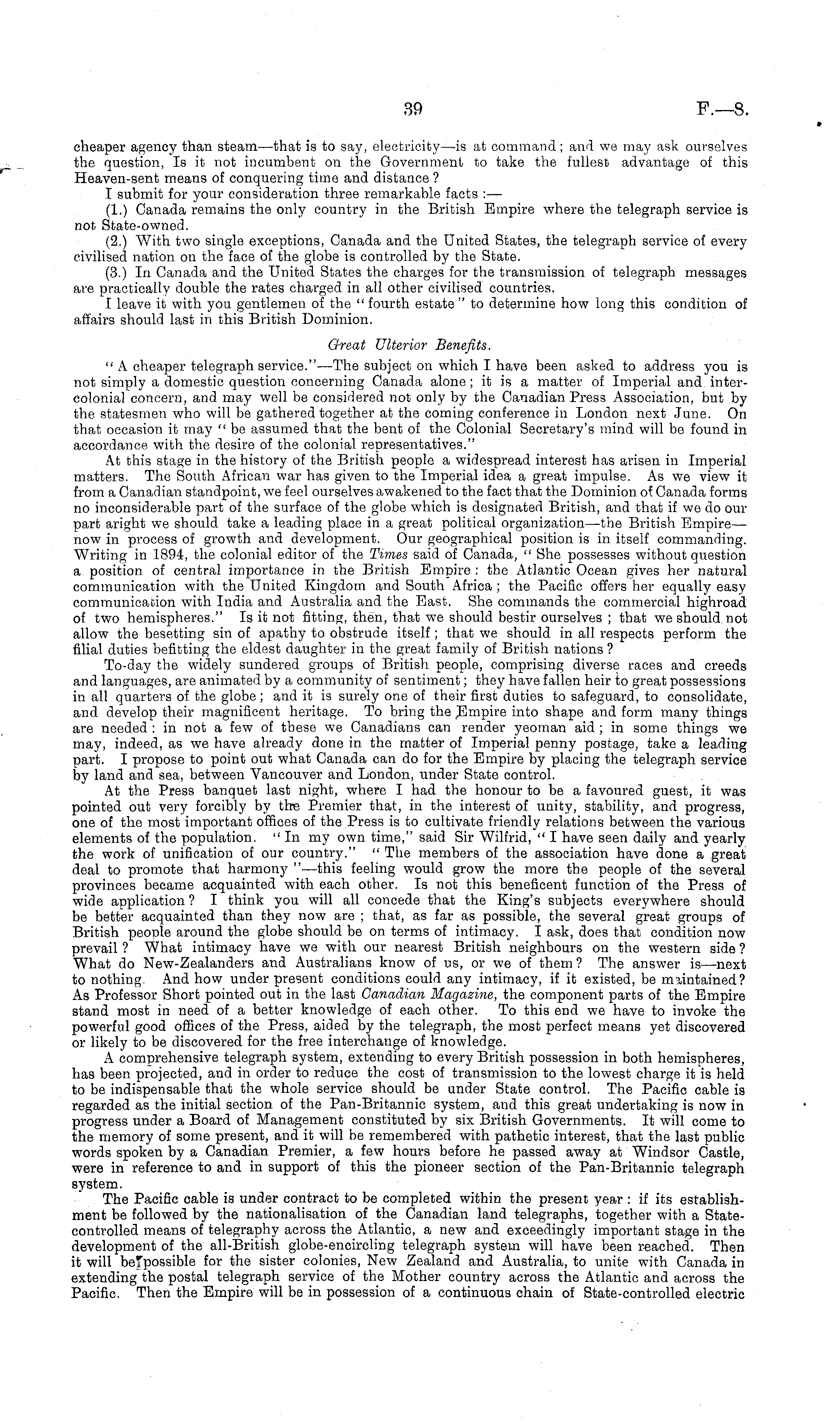 cheaper agency than steam—that is to say, electricity—is at command; and we may ask ourselves the question, Is it not incumbent on the Government to take the fullest advantage of this Heaven-sent means of conquering time and distance ? I submit for your consideration three remarkable facts :— (1.) Canada remains the only country in the British Empire where the telegraph service is not State-owned. (2.) With two single exceptions, Canada and the United States, the telegraph service of every civilised nation on the face of the globe is controlled by the State. (3.) In Canada and the United States the charges for the transmission of telegraph messages are practically double the rates charged in all other civilised countries. I leave it with you gentlemen of the " fourth estate " to determine how long this condition of affairs should last in this British Dominion. Great Ulterior Benefits. " A cheaper telegraph service."—The subject on which I have been asked to address you is not simply a domestic question concerning Canada alone ; it is a matter of Imperial and intercolonial concern, and may well be considered not only by the Canadian Press Association, but by the statesmen who will be gathered together at the coming conference in London next June. On that occasion it may " be assumed that the bent of the Colonial Secretary's mind will be found in accordance with the desire of the colonial representatives." At this stage in the history of the British people a widespread interest has arisen in Imperial matters. The South African war has given to the Imperial idea a great impulse. As we view it from a Canadian standpoint, we feel ourselves awakened to the fact that the Dominion of Canada forms no inconsiderable part of the surface of the globe which is designated British, and that if we do our part aright we should take a leading place in a great political organization—the British Empire— now in process of growth and development. Our geographical position is in itself commanding. Writing in 1894, the colonial editor of the Times said of Canada, " She possesses without question a position of central importance in the British Empire : the Atlantic Ocean gives her natural communication with the United Kingdom and South Africa ; the Pacific offers her equally easy communication with India and Australia and the East. She commands the commercial highroad of two hemispheres." Is it not fitting, then, that we should bestir ourselves ; that we should not allow the besetting sin of apathy to obstrude itself ; that we should in all respects perform the filial duties befitting the eldest daughter in the great family of British nations ? To-day the widely sundered groups of British people, comprising diverse races and creeds and languages, are animated by a community of sentiment; they have fallen heir to great possessions in all quarters of the globe; and it is surely one of their first duties to safeguard, to consolidate, and develop their magnificent heritage. To bring the Empire into shape and form many things are needed : in not a few of these we Canadians can render yeoman aid ; in some things we may, indeed, as we have already done in the matter of Imperial penny postage, take a leading part, I propose to point out what Canada can do for the Empire by placing the telegraph service by land and sea, between Vancouver and London, under State control. At the Press banquet last night, where I had the honour to be a favoured guest, it was pointed out very forcibly by the Premier that, in the interest of unity, stability, and progress, one of the most important offices of the Press is to cultivate friendly relations between the various elements of the population. "In my own time," said Sir Wilfrid, " I have seen daily and yearly the work of unification of our country." " The members of the association have done a great deal to promote that harmony " —this feeling would grow the more the people of the several provinces became acquainted with each other. Is not this beneficent function of the Press of wide application ? I think you will all concede that the King's subjects everywhere should be better acquainted than they now are ; that, as far as possible, the several great groups of British people around the globe should be on terms of intimacy. I ask, does that condition now prevail ? What intimacy have we with our nearest British neighbours on the western side ? What do New-Zealanders and Australians know of us, or we of them? The answer is—next to nothing. And how under present conditions could any intimacy, if it existed, be maintained? As Professor Short pointed out in the last Canadian Magazine, the component parts of the Empire stand most in need of a better knowledge of each other. To this end we have to invoke the powerful good offices of the Press, aided by the telegraph, the most perfect means yet discovered or likely to be discovered for the free interchange of knowledge. A comprehensive telegraph system, extending to every British possession in both hemispheres, has been projected, and in order to reduce the cost of transmission to the lowest charge it is held to be indispensable that the whole service should be under State control. The Pacific cable is regarded as the initial section of the Pan-Britannic system, and this great undertaking is now in progress under a Board of Management constituted by six British Governments. It will come to the memory of some present, and it will be remembered with pathetic interest, that the last public words spoken by a Canadian Premier, a few hours before he passed away at Windsor Castle, were in reference to and in support of this the pioneer section of the Pan-Britannic telegraph system. The Pacific cable is under contract to be completed within the present year : if its establishment be followed by the nationalisation of the Canadian land telegraphs, together with a Statecontrolled means of telegraphy across the Atlantic, a new and exceed