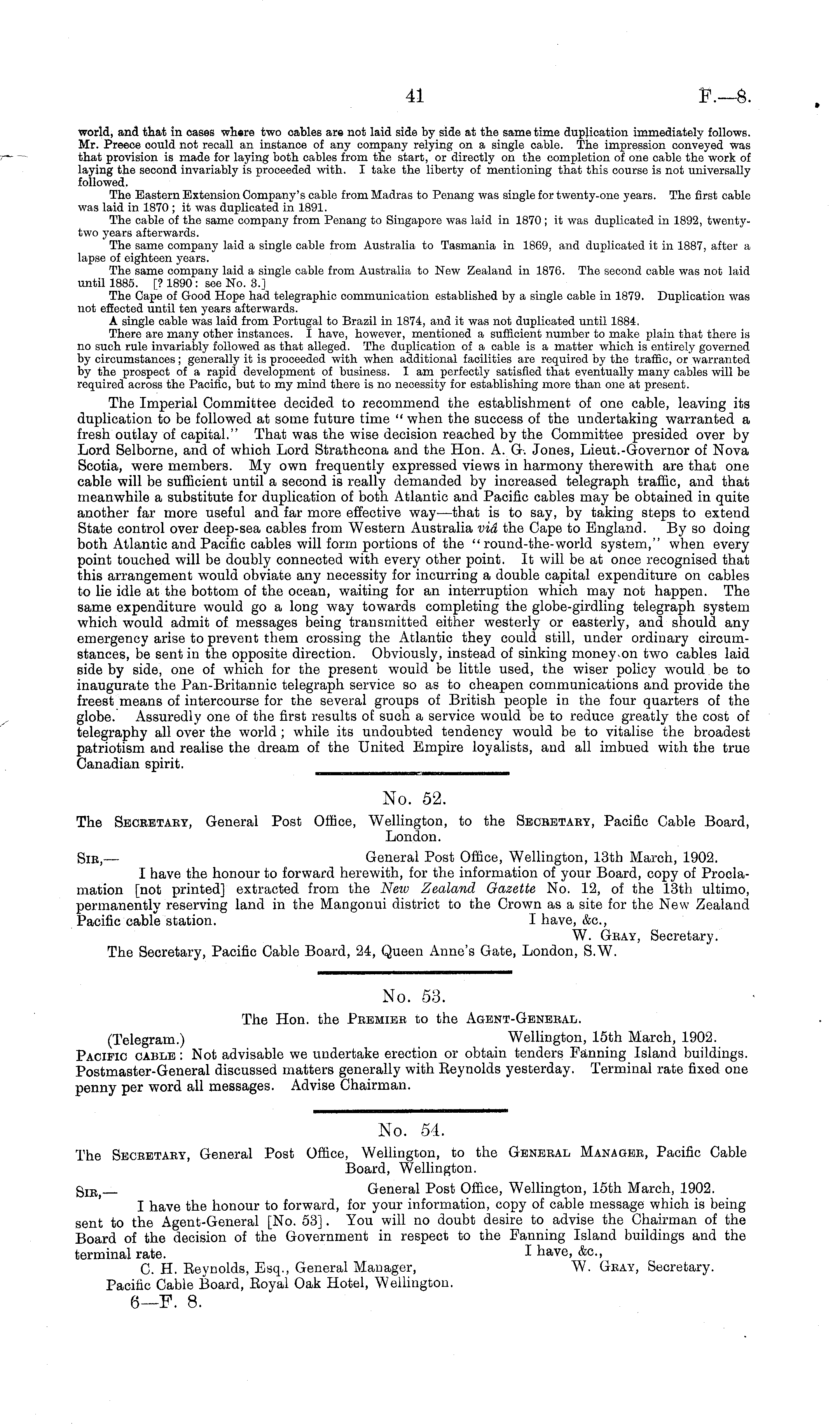 No. 54. The Secretary, General Post Office, Wellington, to the General Manager, Pacific Cable Board, Wellington. Sir — General Post Office, Wellington, 15th March, 1902. I have the honour to forward, for your information, copy of cable message which is being sent to the Agent-General [No. 53]. You will no doubt desire to advise the Chairman of the Board of the decision of the Government in respect to the Fanning Island buildings and the terminal rate. I have, &c, C. H. Beynolds, Esq., General Manager, W. Gray, Secretary. Pacific Cable Board, Boyal Oak Hotel, Wellington. 6— F. 8.
