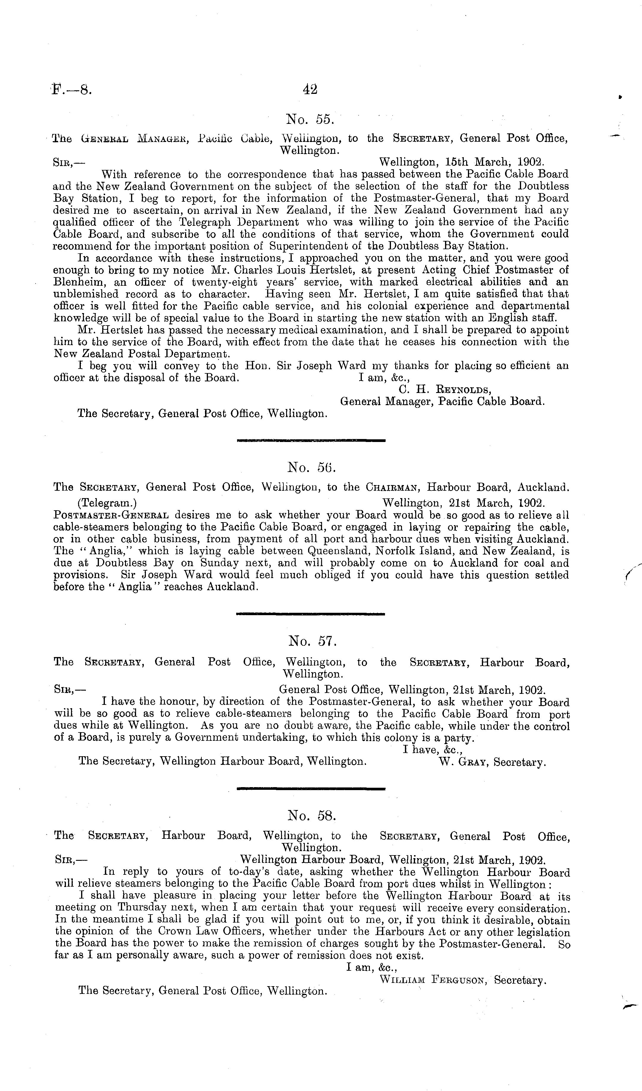 No. 55. The General Manager, Pacific Cable, Wellington, to the Secretary, General Post Office, Wellington. Sir,— Wellington, 15th March, 1902. With reference to the correspondence that has passed between the Pacific Cable Board and the New Zealand Government on the subject of the selection of the staff for the Doubtless Bay Station, I beg to report, for the information of the Postmaster-General, that my Board desired me to ascertain, on arrival in New Zealand, if the New Zealand Government had any qualified officer of the Telegraph Department who was willing to join the service of the Pacific Cable Board, and subscribe to all the conditions of that service, whom the Government could recommend for the important position of Superintendent of the Doubtless Bay Station. In accordance with these instructions, I approached you on the matter, and you were good enough to bring to my notice Mr. Charles Louis Hertslet, at present Acting Chief Postmaster of Blenheim, an officer of twenty-eight years' service, with marked electrical abilities and an unblemished record as to character. Having seen Mr. Hertslet, lam quite satisfied that that officer is well fitted for the Pacific cable service, and his colonial experience and departmental knowledge will be of special value to the Board in starting the new station with an English staff. Mr. Hertslet has passed the necessary medical examination, and I shall be prepared to appoint him to the service of the Board, with effect from the date that he ceases his connection with the New Zealand Postal Department. I beg you will convey to the Hon. Sir Joseph Ward my thanks for placing so efficient an officer at the disposal of the Board. I am, &c, C. H. Beynolds, General Manager, Pacific Cable Board. The Secretary, General Post Office, Wellington.