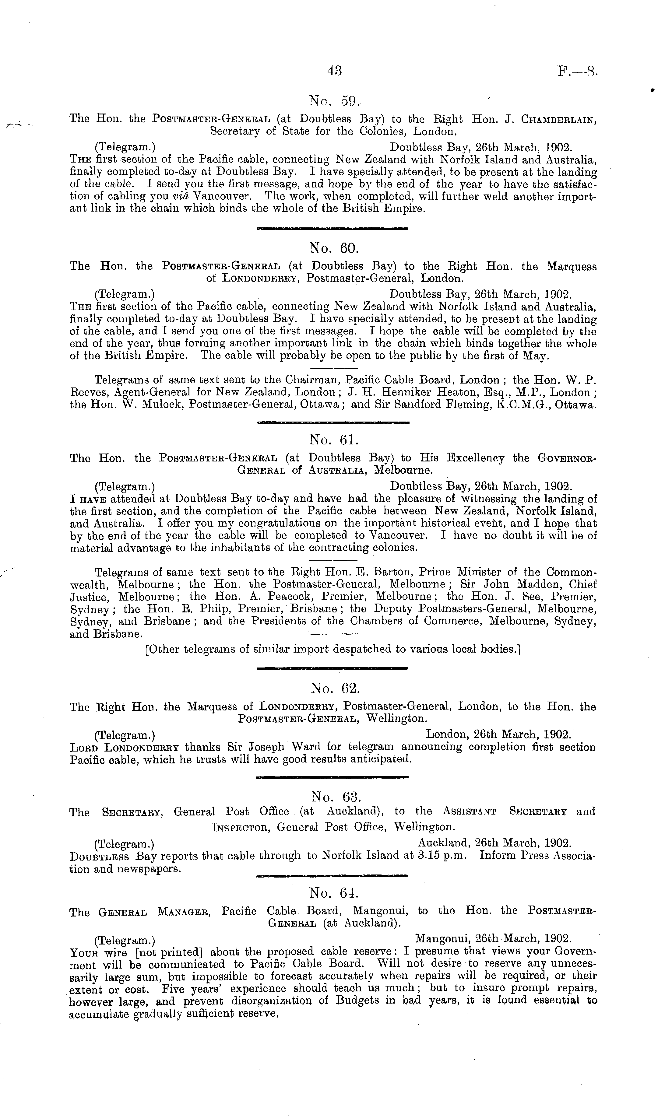 No. 59. The Hon. the Postmaster-General (at Doubtless Bay) to the Bight Hon. J. Chamberlain, Secretary of State for the Colonies, London. (Telegram.) Doubtless Bay, 26th March, 1902. The first section of the Pacific cable, connecting New Zealand with Norfolk Island and Australia, finally completed to-day at Doubtless Bay. I have specially attended, to be present at the landing of the cable. I send you the first message, and hope by the end of the year to have the satisfaction of cabling you vid Vancouver. The work, when completed, will further weld another important link in the chain which binds the whole of the British Empire.