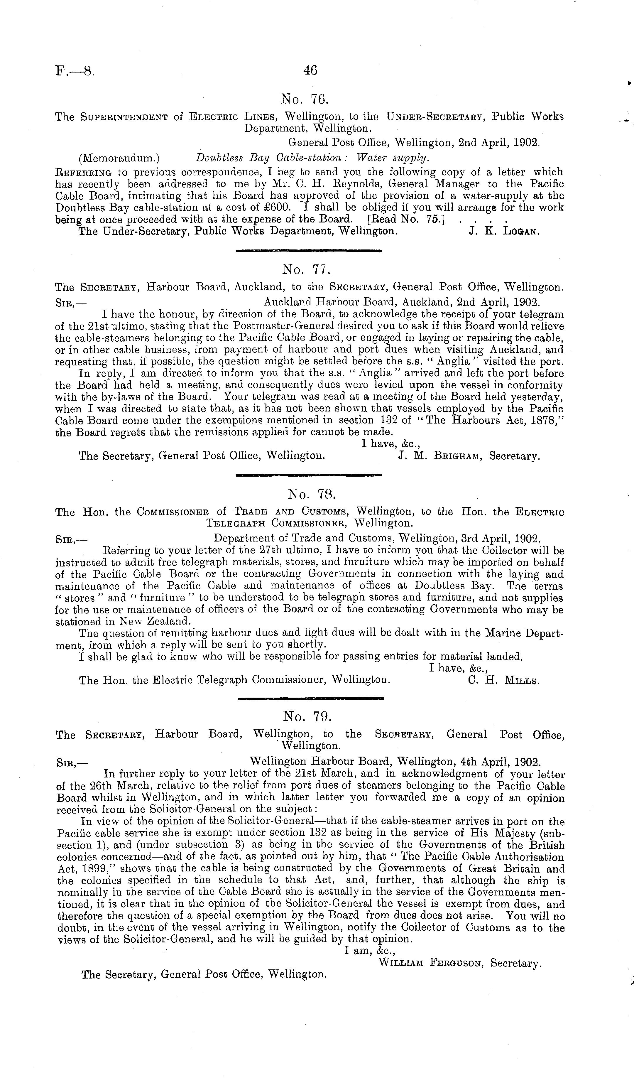 No. 79. The Secretary, Harbour Board, Wellington, to the Secretary, General Post Office, Wellington. Sir, — Wellington Harbour Board, Wellington, 4th April, 1902. In further reply to your letter of the 21st March, and in acknowledgment of your letter of the 26th March, relative to the relief from port dues of steamers belonging to the Pacific Cable Board whilst in Wellington, and in which latter letter you forwarded me a copy of an opinion received from the Solicitor-General on the subject: In view of the opinion of the Solicitor-General—that if the cable-steamer arrives in port on the Pacific cable service she is exempt under section 132 as being in the service of His Majesty (subsection 1), and (under subsection 3) as being in the service of the Governments of the British colonies concerned —and of the fact, as pointed out by him, that " The Pacific Cable Authorisation Act, 1899," shows that the cable is being constructed by the Governments of Great Britain and the colonies specified in the schedule to that Act, and, further, that although the ship is nominally in the service of the Cable Board she is actually in the service of the Governments mentioned, it is clear that in the opinion of the Solicitor-General the vessel is exempt from dues, and therefore the question of a special exemption by the Board from dues does not arise. You will no doubt, in the event of the vessel arriving in Wellington, notify the Collector of Customs as to the views of the Solicitor-General, and he will be guided by that opinion. I am, &c, William Ferguson, Secretary. The Secretary, General Post Office, Wellington.