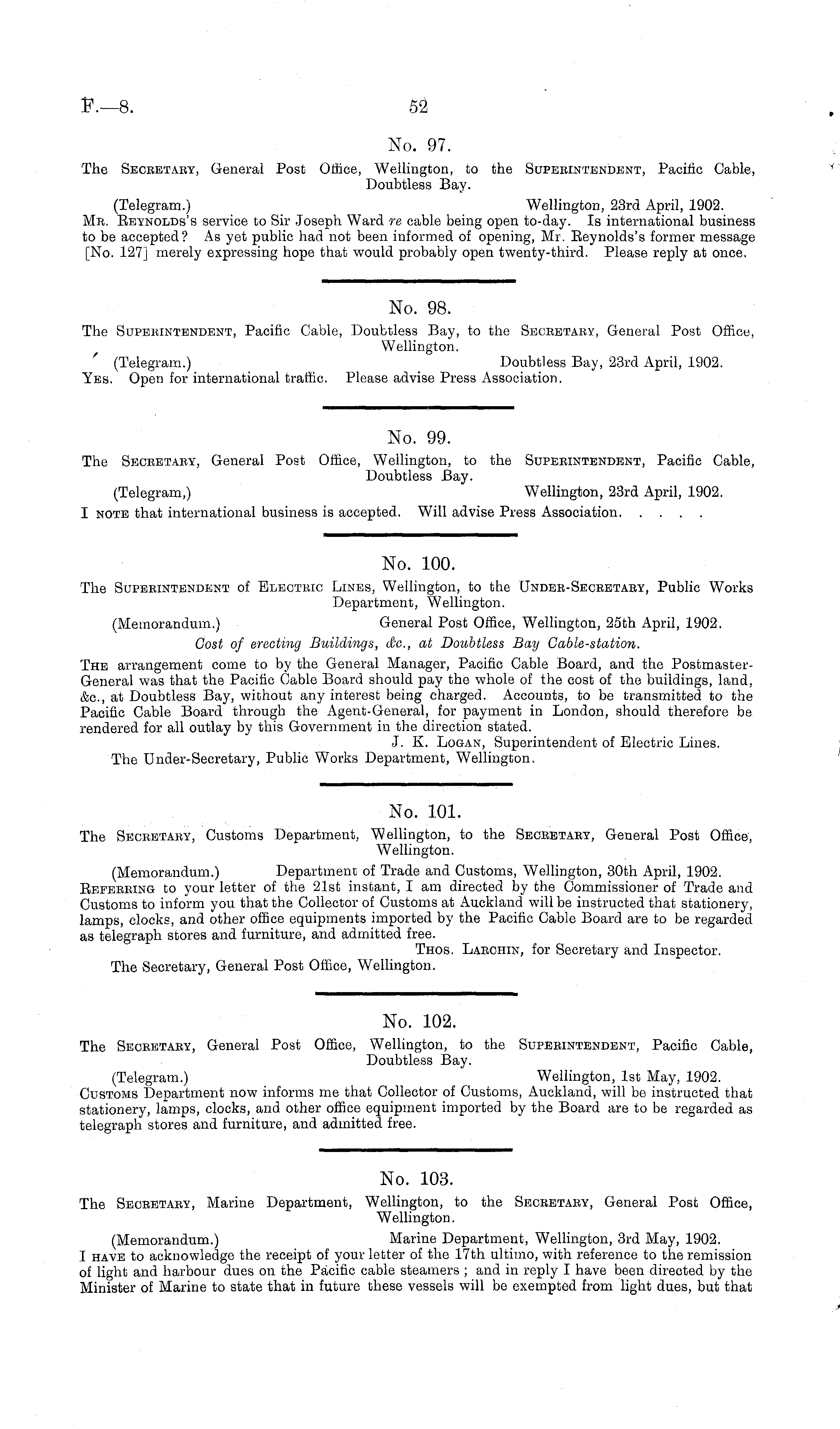 No. 100. The Supebintendent of Electbic Lines, Wellington, to the Undee-Secbetary, Public Works Department, Wellington. (Memorandum.) General Post Office, Wellington, 25th April, 1902. Cost of erecting Buildings, &c, at Doubtless Bay Gable-station. The arrangement come to by the General Manager, Pacific Cable Board, and the PostmasterGeneral was that the Pacific Gable Board should pay the whole of the cost of the buildings, land, &c, at Doubtless Bay, without any interest being charged. Accounts, to be transmitted to the Pacific Cable Board through the Agent-General, for payment in London, should therefore be rendered for all outlay by this Government in the direction stated. J. K. Logan, Superintendent of Electric Lines. The Under-Secretary, Public Works Department, Wellington.