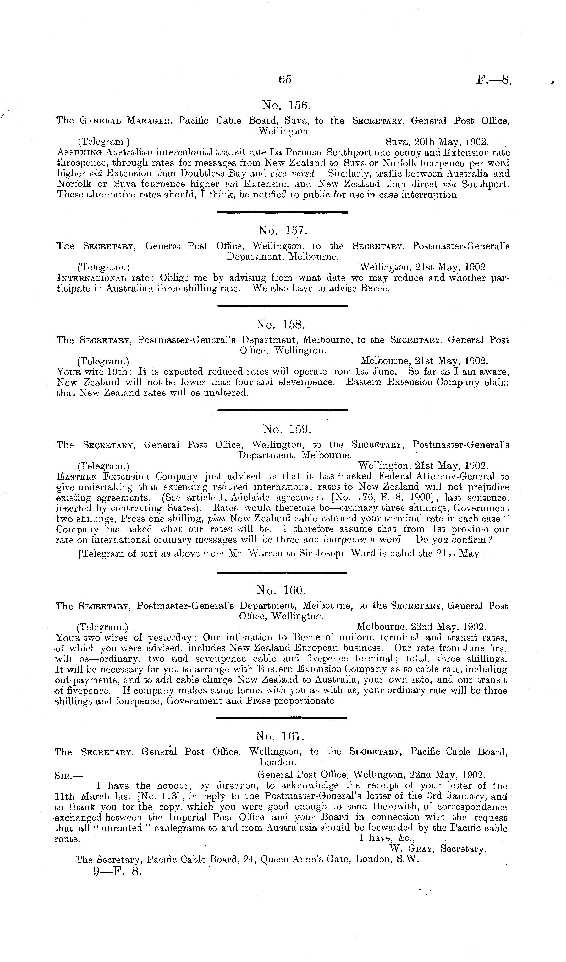 No. 161. The Secbetaey, General Post Office, Wellington, to the Secbetaey, Pacific Cable Board, London. Sic,— General Post Office, Wellington, 22nd May, 1902. I have the honour, by direction, to acknowledge the receipt of your letter of the 11th March last [No. 113], in reply to the Postmaster-General's letter of the 3rd January, and to thank you for the copy, which you were good enough to send therewith, of correspondence exchanged between the Imperial Post Office and your Board in connection with the request that all "unrouted " cablegrams to and from Australasia should be forwarded by the Pacific cable route. I have, &c, W. Geay, Secretary. The Secretary, Pacific Cable Board, 24, Queen Anne's Gate, London, S.W.