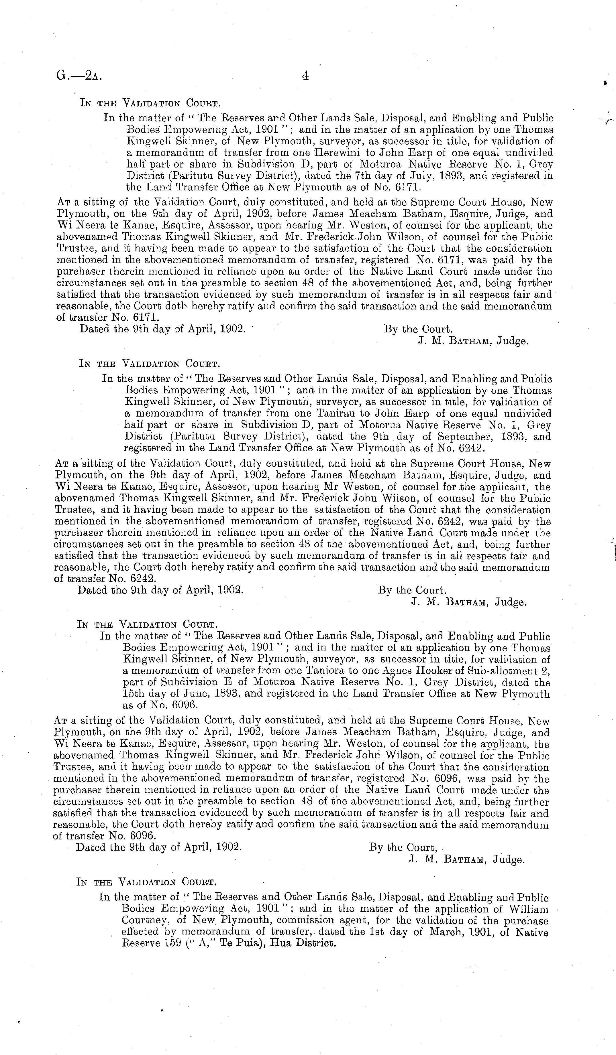In the Validation Coukt. In the matter of " The Eeserves and Other Lands Sale, Disposal, and Enabling and Public Bodies Empowering Act, 1901 " ; and in the matter of an application by one Thomas Kingwell Skinner, of New Plymouth, surveyor, as successor in title, for validation of a memorandum of transfer from one Herewini to John Earp of one equal undivided half part or share in Subdivision D, part of Moturoa Native Eeserve No. 1, Grey District (Paritutu Survey District), dated the 7th day of July, 1893, and registered in the Land Transfer Office at New Plymouth as of No. 6171. At a sitting of the Validation Court, duly constituted, and held at the Supreme Court House, New Plymouth, on the 9th day of April, 1902, before James Meacham Batham, Esquire, Judge, and Wi Neera te Kanae, Esquire, Assessor, upon hearing Mr. Weston, of counsel for the applicant, the abovenamp-d Thomas Kingwell Skinner, and Mr. Frederick John Wilson, of counsel for the Public Trustee, and it having been made to appear to the satisfaction of the Court that the consideration mentioned in the abovementioned memorandum of transfer, registered No. 6171, was paid by the purchaser therein mentioned in reliance upon an order of the Native Land Court made under the circumstances set out in the preamble to section 48 of the abovementioned Act, and, being further satisfied that the transaction evidenced by such memorandum of transfer is in all respects fair and reasonable, the Court doth hereby ratify and confirm the said transaction and the said memorandum of transfer No. 6171. Dated the 9th day of April, 1902. By the Court. J. M. Batham, Judge. In the Validation Covet. In the matter of " The Reserves and Other Lands Sale, Disposal, and Enabling and Public Bodies Empowering Act, 1901 " ; and in the matter of an application by one Thomas Kingwell Skinner, of New Plymouth, surveyor, as successor in title, for validation of a memorandum of transfer from one Tanirau to John Earp of one equal undivided half part or share in Subdivision D, part of Motorua Native Eeserve No. 1, Grey District (Paritutu Survey District), dated the 9th day of September, 1893, and registered in the Land Transfer Office at New Plymouth as of No. 6242. At a sitting of the Validation Court, duly constituted, and held at the Supreme Court House, New Plymouth, on the 9th day of April, 1902, before James Meacham Batham, Esquire, Judge, and Wi Neera te Kanae, Esquire, Assessor, upon hearing Mr Weston, of counsel for-the applicant, the abovenamed Thomas Kingwell Skinner, and Mr. Frederick John Wilson, of counsel for the Public Trustee, and it having been made to appear to the satisfaction of the Court that the consideration mentioned in the abovementioned memorandum of transfer, registered No. 6242, was paid by the purchaser therein mentioned in reliance upon an order of the Native Land Court made under the circumstances set out in the preamble to section 48 of the abovementioned Act, and, being further satisfied that the transaction evidenced by such memorandum of transfer is in all respects fair and reasonable, the Court doth hereby ratify and confirm the said transaction and the said memorandum of transfer No. 6242. Dated the 9th day of April, 1902. By the Court. J. M. Batham, Judge. In the Validation Court. In the matter of " The Eeserves and Other Lands Sale, Disposal, and Enabling and Public Bodies Empowering Act, 1901 " ; and in the matter of an application by one Thomas Kingwell Skinner, of New Plymouth, surveyor, as successor in title, for validation of a memorandum of transfer from one Taniora to one Agnes Hooker of Sub-allotment 2, part of Subdivision E of Moturoa Native Eeserve No. 1, Grey District, dated the 15th day of June, 1893, and registered in the Land Transfer Office at New Plymouth as of No. 6096. At a sitting of the Validation Court, duly constituted, and held at the Supreme Court House, New Plymouth, on the 9th day of April, 1902, before James Meacham Batham, Esquire, Judge, and Wi Neera te Kanae, Esquire, Assessor, upon hearing Mr. Weston, of counsel for the applicant, the abovenamed Thomas Kingwell Skinner, and Mr. Frederick John Wilson, of counsel for the Public Trustee, and it having been made to appear to the satisfaction of the Court that the consideration mentioned in the abovementioned memorandum of transfer, registered No. 6096, was paid by the purchaser therein mentioned in reliance upon an order of the Native Land Court made under the circumstances set out in the preamble to section 48 of the abovementioned Act, and, being further satisfied that the transaction evidenced by such memorandum of transfer is in all respects fair and reasonable, the Court doth hereby ratify and confirm the said transaction and the said memorandum of transfer No. 6096. Dated the 9th day of April, 1902. By the Court, J. M. Batham, Judge. In the Validation Covet. In the matter of " The Eeserves and Other Lands Sale, Disposal, and Enabling and Public Bodies Empowering Act, 1901 " ; and in the matter of the application of William Courtney, of New Plymouth, commission agent, for the validation of the purchase effected by memorandum of transfer, dated the Ist day of March, 1901, of Native Eeserve 159 (" A," Te Puia), Hua District.