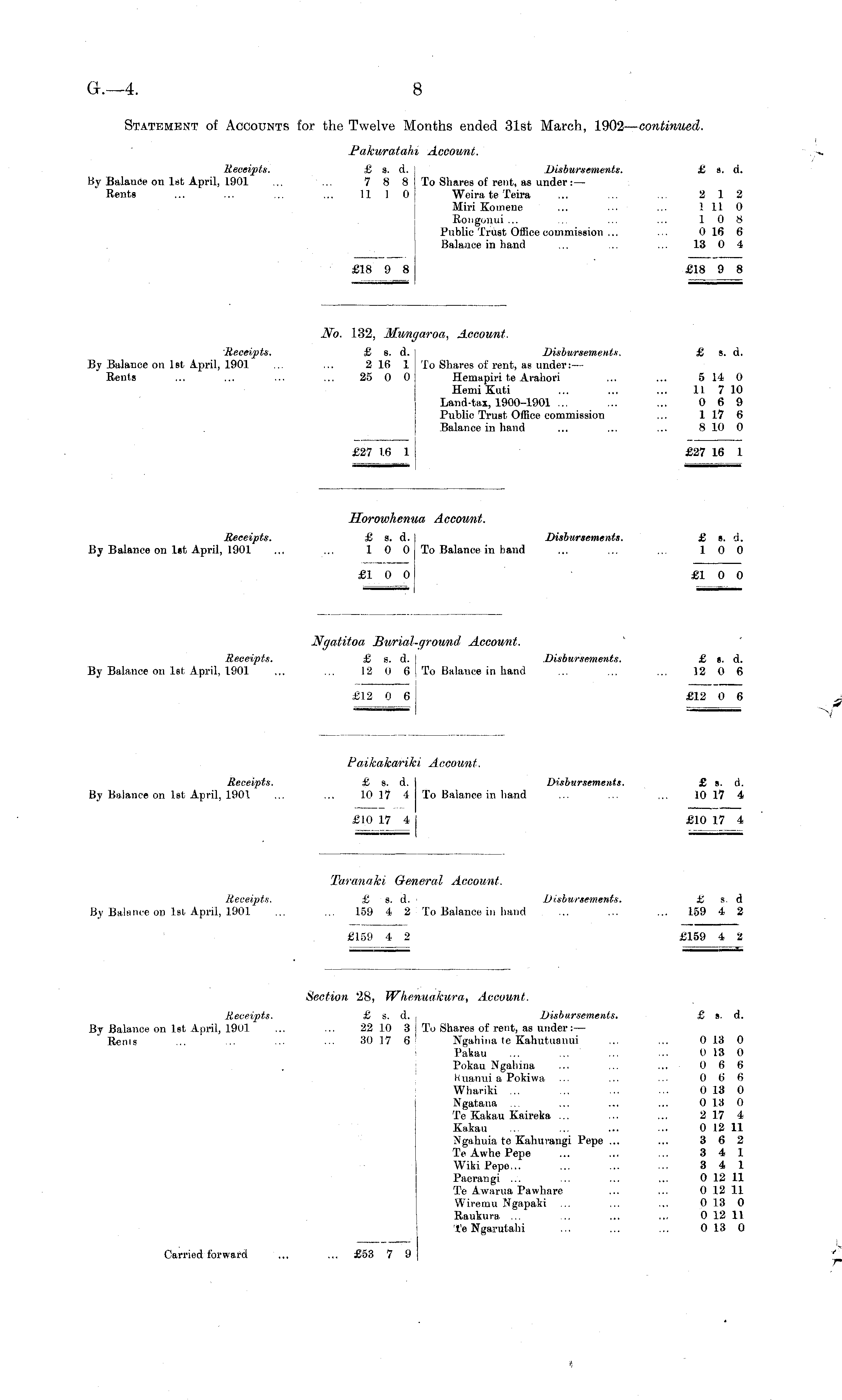 Statement of Accounts for the Twelve Months ended 31st March, 1902— continued. Fakuratahi Account. Receipts. £ s. d. Disbursements. £ a. d. By Balance on let April, 1901 ... ... 7 8 8 To Shares of rent, as under: — Rente ... ... ... ... 11 1 0 ; Weira te Teira ... ... ... 2 12 Miri Kotnene ... ... ... 1 11 0 Bongonui ... ... ... ... 10 8 Public Trust Office commission ... ... 0 16 6 Balance in hand ... ... ... 13 0 4 £18 9 8 £18 9 8