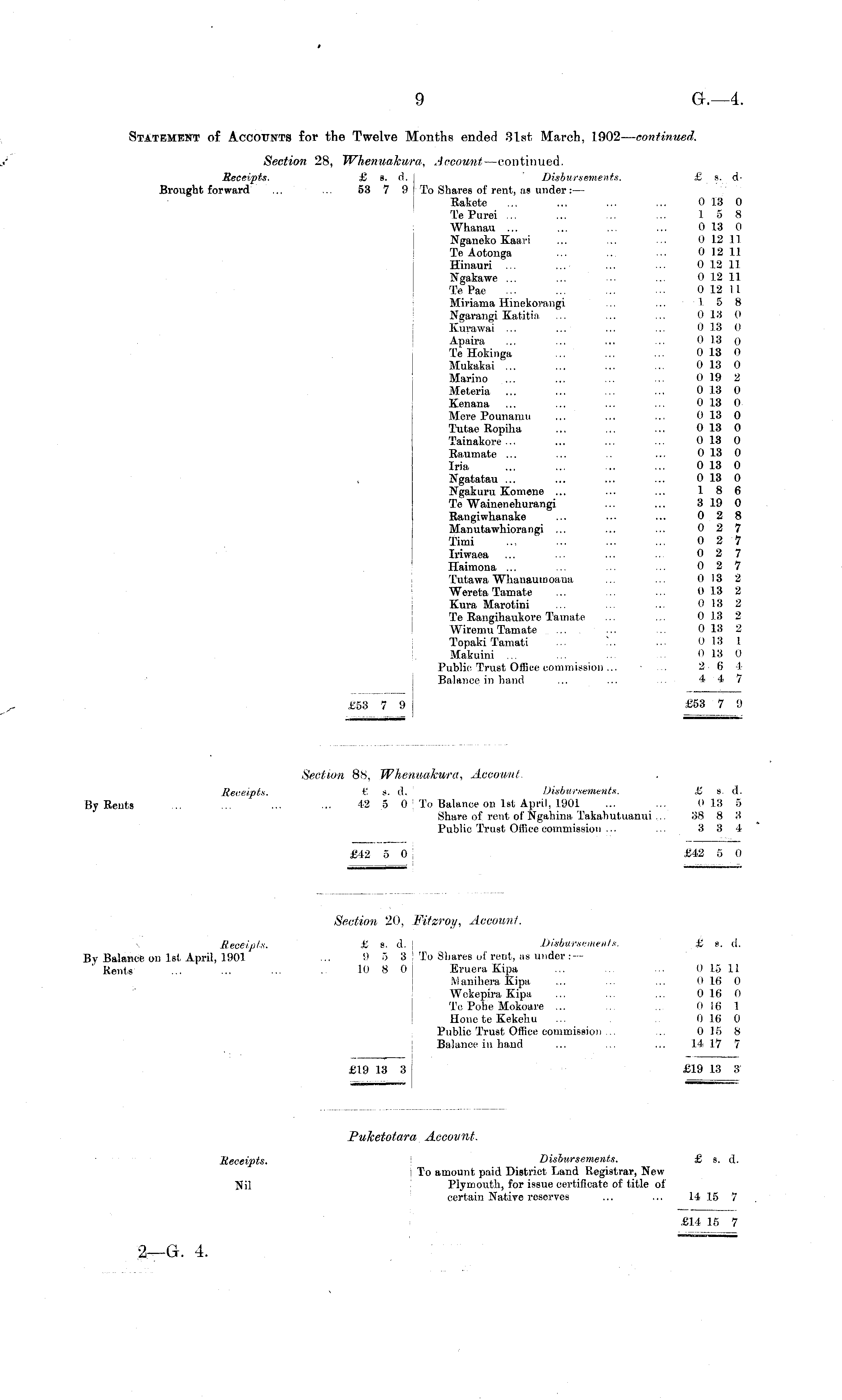 Section 20, Fitzroi/, Account. Receipts. £ s. d. : Disbursements. £ 8. d. By Balance on Ist April, 1901 ... 9 5 3! To Shares of rent, us under : — Rents ... ... ... .. 10 8 0 Eruera Kipa ... ... ... 0 15 11 Manihera Kipa ... ... ... 016 0 Wckepira Kipa ... ... ... 0 16 0 To Pohe Mokoare ... ... ... 0 16 1 HoueteKekehu ... . .. 0 16 0 Public Trust Office commission ... ... 0 15 8 Balance in hand ... ... ... 1.4 17 7 £19 13 3 £19 13 3