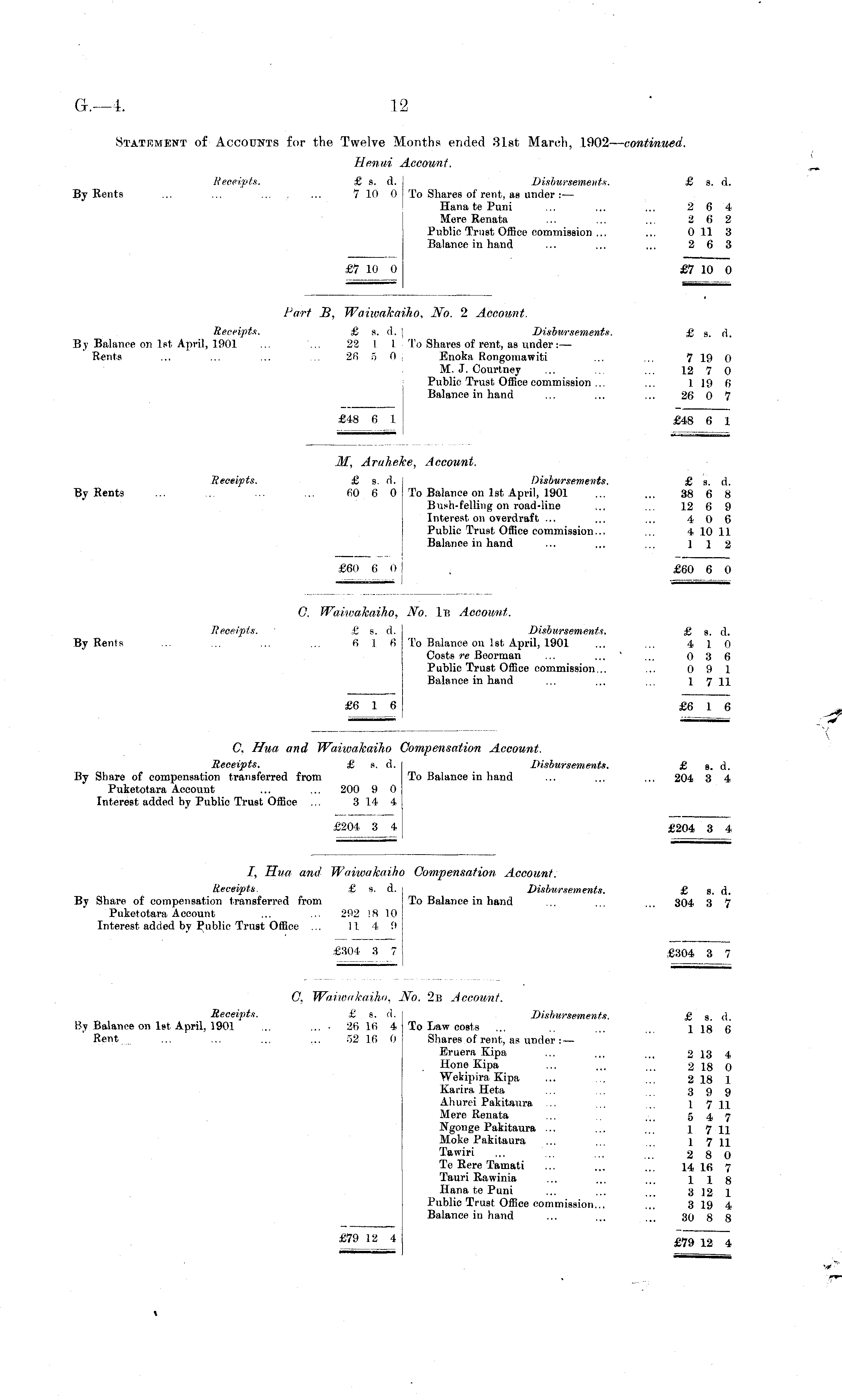 C, Him and Waiwakaiho Compensation Account. Receipts. £ s. A. Disbursements. £ s. d. By Share of compensation transferred from To Balance in hand ... ... ... 204 3 4 Puketotara Account ... ... 200 9 0 Interest added by Public Trust Office ... 3 14 4 £204. 3 4 £204 3 4