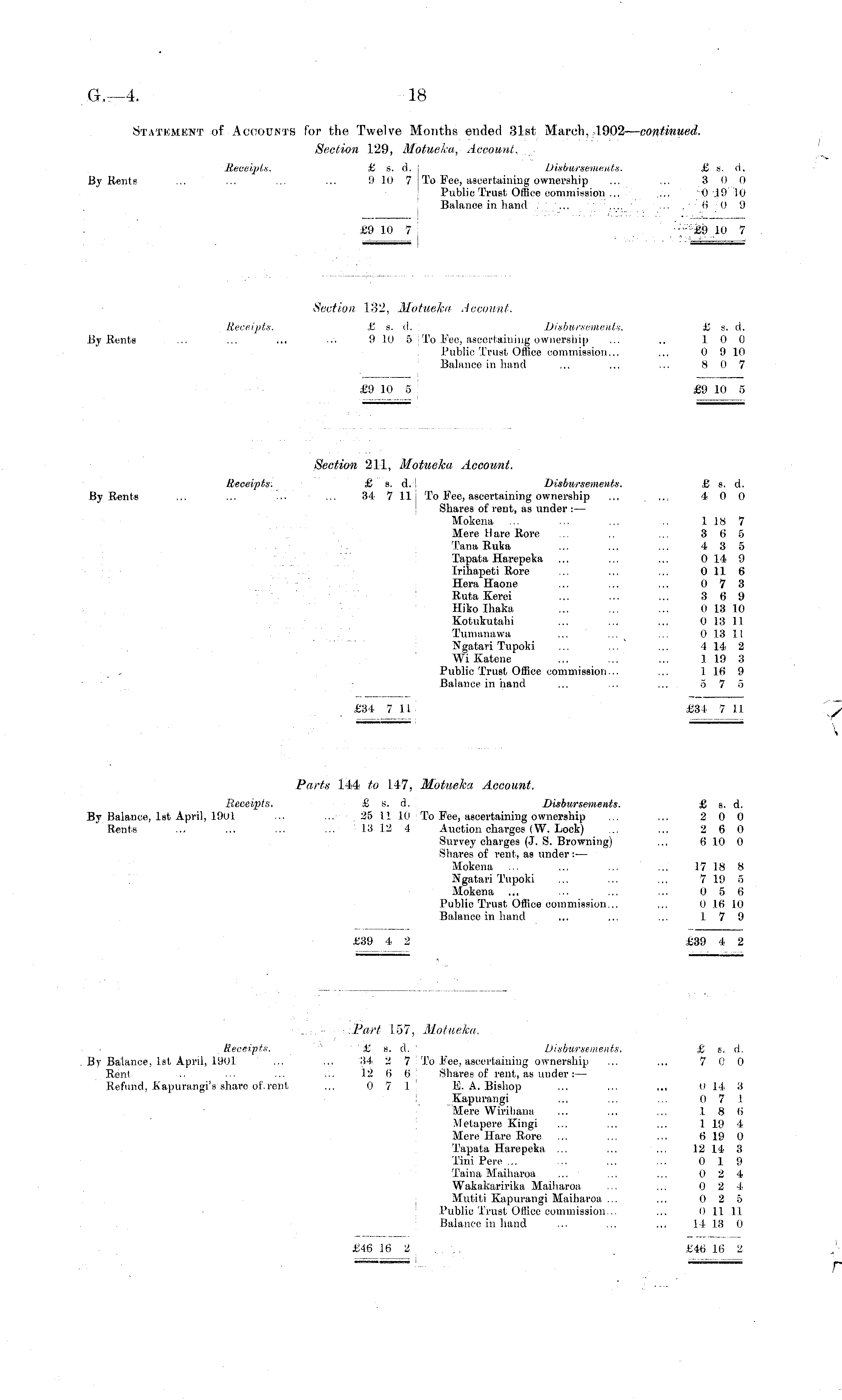 Parts 144 to 147, Motueka Account. Receipts. ■ £ s. d. Disbursements. £ c. d. By Balance, Ist April, 1901 ... ... 25 11 10 To Fee, ascertaining ownership ... ... 2 0 0 Rente ... ... ... ... 13 12 4 Auction charges (W. Lock) ... ... 26 0 Survey charges (J. S. Browning) .., 6 10 0 Shares of rent, as under :— Mokena ... ... ... ... 17 18 8 Ngatari Tupoki ... ... ... 7 19 5 Mokena ... ... ... ... 0 5 6 Public Trust Office commission... ... 0 16 10 Balance in hand ... ... ... 17 9 £39 4 2 £39 4 2