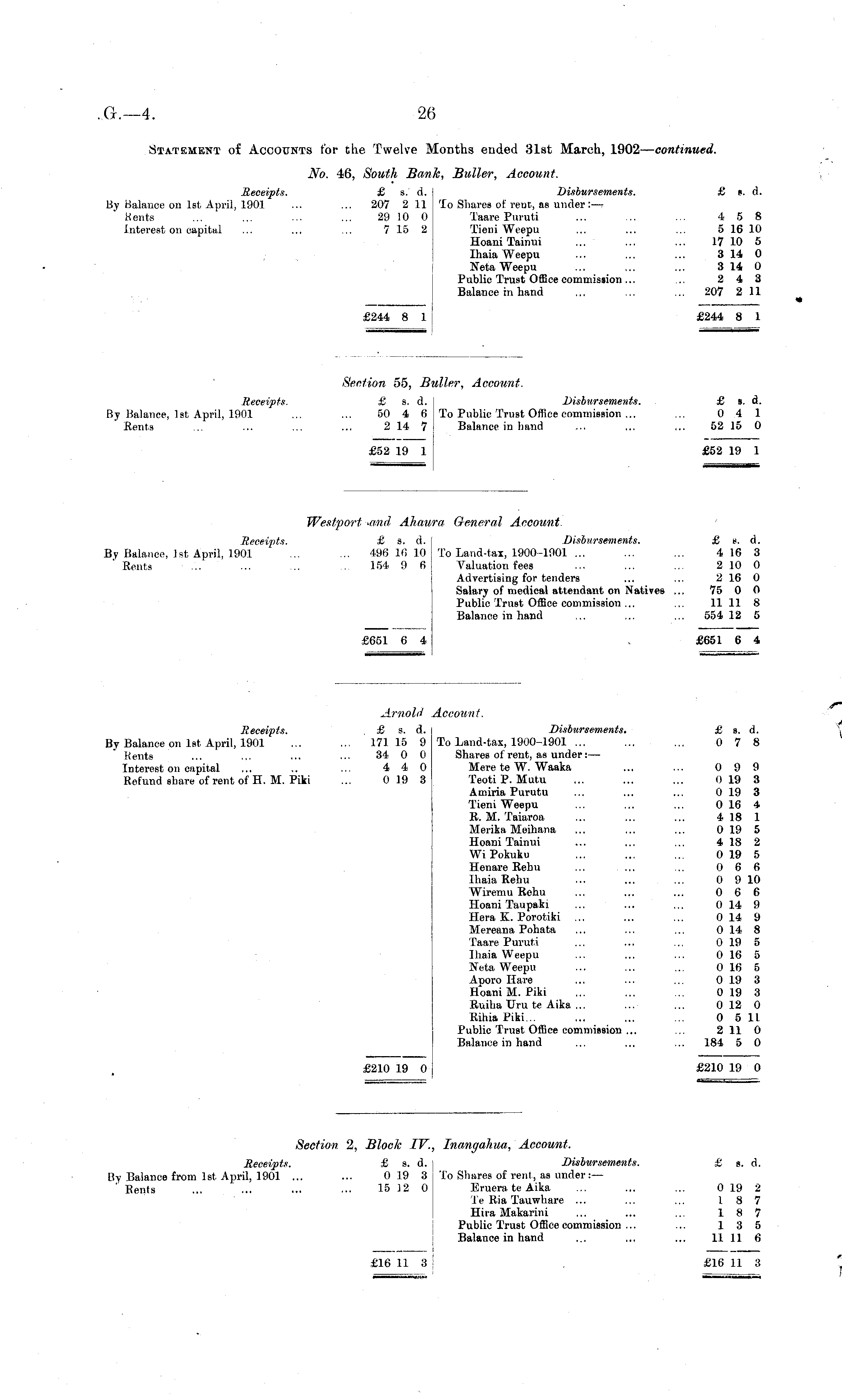 Westport .and Ahaitra General Account. Receipts. £ 3. d. Disbursements. £ s. d. By Balance, Ist April, 1901 ... ... 496 16 10 To Land-tax, 1900-1901 ... ... ... 416 3 Eents ... ... ... ... 154 9 6 Valuation fees ... ... ... 2 10 0 Advertising for tenders ... ... 2 16 0 Salary of medical attendant on Natives ... 75 0 0 Public Trust Office commission... ... 11 11 8 Balance in hand ... ... ... 554 12 5 £651 6 4 . £651 6 4