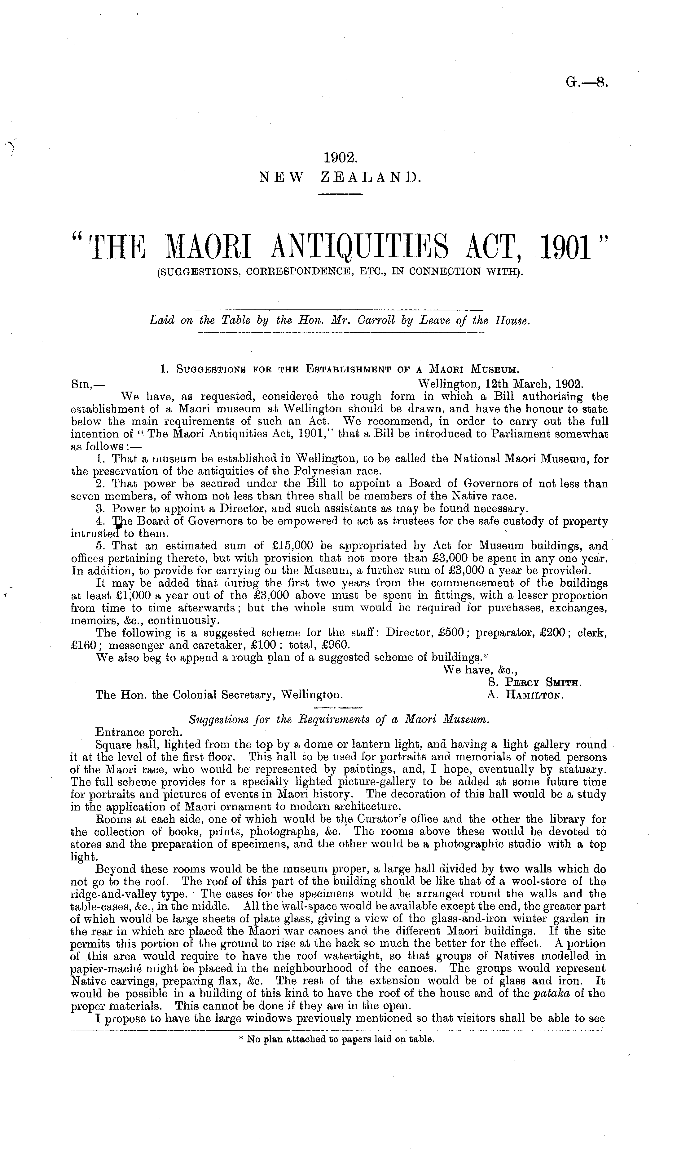 1. Suggestions foe the Establishment of a Maoei Museum. Sir,— Wellington, 12th March, 1902. Wβ have, as requested, considered the rough form in which a Bill authorising the establishment of a Maori museum at Wellington should be drawn, and have the honour to state below the main requirements of such an Act. We recommend, in order to carry out the full intention of " The Maori Antiquities Act, 1901," that a Bill be introduced to Parliament somewhat as follows: — 1. That a museum be established in Wellington, to be called the National Maori Museum, for the preservation of the antiquities of the Polynesian race. 2. That power be secured under the Bill to appoint a Board of Governors of not less than seven members, of whom not less than three shall be members of the Native race. 3. Power to appoint a Director, and such assistants as may be found necessary. 4. The Board of Governors to be empowered to act as trustees for the safe custody of property intrusted to them. 5. That an estimated sum of £15,000 be appropriated by Act for Museum buildings, and offices pertaining thereto, but with provision that not more than £3,000 be spent in any one year. In addition, to provide for carrying on the Museum, a further sum of £3,000 a year be provided. It may be added that during the first two years from the commencement of the buildings at least £1,000 a year out of the £3,000 above must be spent in fittings, with a lesser proportion from time to time afterwards; but the whole sum would be required for purchases, exchanges, memoirs, &c, continuously. The following is a suggested scheme for the staff: Director, £500; preparator, £200; clerk, £160; messenger and caretaker, £100 : total, £960. We also beg to append a rough plan of a suggested scheme of buildings.* We have, &c, S. Peect Smith. The Hon. the Colonial Secretary, Wellington. A. Hamilton.