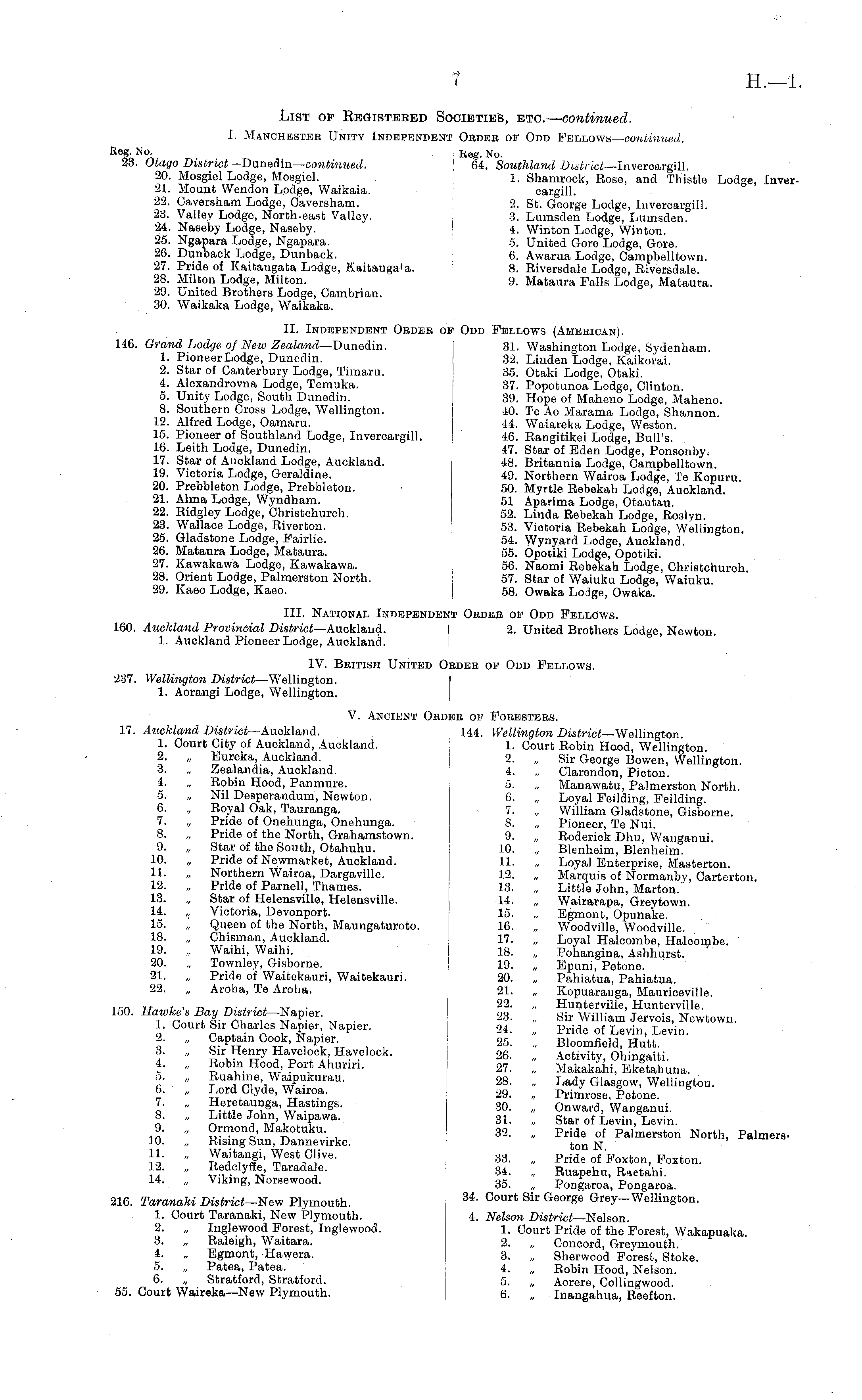 List of Begistered Societies, etc. — continued. I. Manchester Unity Independent Order of Odd Fellows — continued. Keg. No. I Keg. n O , 23. District— -Dunedin— continued. 64. Southland District— lnveroargill. 20. Mosgiel Lodge, Mosgiel. 1. Shamrock, Rose, and Thistle Lodge, luver 21. Mount Wendon Lodge, Waikaia. cargill. 22. Caversham Lodge, Caversham. 2. St. George Lodge, Invercargill. 23. Valley Lodge, North-east Valley. 3. Lumsden Lodge, Lumsden. 24. Naseby Lodge, Naseby. 4. Winton Lodge, Winton. 25. Ngapara Lodge, Ngapara. 5. United Gore Lodge, Gore. 26. Dunback Lodge, Dunback. 6. Awarua Lodge, Campbelltown. 27. Pride of Kaitangata Lodge, Kaitauga'a. 8. Riversdale Lodge, Riversdale. 28. Milton Lodge, Milton. 9. Mataura Falls Lodge, Mataura. 29. United Brothers Lodge, Cambrian. 30. Waikaka Lodge, Waikaka. 11. Independent Order of Odd Fellows (American). 146. Grand Lodge of New Zealand— Dunedin. 31. Washington Lodge, Sydenham. 1. Pioneer Lodge, Dunedin. 32. Linden Lodge, Kaikorai. 2. Star of Canterbury Lodge, Timaru. 35. Otaki Lodge, Otaki. 4. Alexandrovna Lodge, Temuka. 37. Popotunoa Lodge, Clinton. 5. Unity Lodge, South Dunedin. 39. Hope of Maheno Lodge, Maheno. 8. Southern Cross Lodge, Wellington. 40. Te Ao Marama Lodge, Shannon. 12. Alfred Lodge, Oamaru. 44. Waiareka Lodge, Weston. 15. Pioneer of Southland Lodge, Invercargill. 46. Rangitikei Lodge, Bull's. 16. Leith Lodge, Dunedin. 47. Star of Eden Lodge, Ponsonby. 17. Star of Auckland Lodge, Auckland. 48. Britannia Lodge, Campbelltown. 19. Victoria Lodge, Geraldine. 49. Northern Wairoa Lodge, Te Kopuru. 20. Prebbleton Lodge, Prebbleton. 50. Myrtle Rebekah Lodge, Auckland. 21. Alma Lodge, Wyndham. 51 Aparima Lodge, Otautau. 22. Ridgley Lodge, Christchurch. 52. Linda Rebekah Lodge, Roslyn. 23. Wallace Lodge, Riverton. 53. Victoria Rebekah Lodge, Wellington. 25. Gladstone Lodge, Fairlie. 54. Wynyard Lodge, Auokland. 26. Mataura Lodge, Mataura. 55. Opotiki Lodge, Opotiki. 27. Kawakawa Lodge, Kawakawa. 56. Naomi Rebekah Lodge, Christchurch 28. Orient Lodge, Palmerston North. 57. Star of Waiuku Lodge, Waiuku 29. Kaeo Lodge, Kaeo. 58. Owaka Lo3ge, Owaka. 111. National Independent Order of Odd Fellows. 160. Auckland Provincial District— Auckland. 2. United Brothers Lodge, Newton. 1. Auckland Pioneer Lodge, Auckland. IV. British United Order of Odd Fellows. 237. Wellington District —Wellington. I 1. Aorangi Lodge, Wellington. V. Ancient Order of Foresters. 17. Auckland District— Auckland. i 144. Wellington District— Wellington. 1. Court City of Auckland, Auckland. 1. Court Robin Hood, Wellington. 2. „ Eureka, Auckland. 2. „ Sir George Bowen, Wellington. 3. „ Zealandia, Auckland. 4. „ Clarendon, Picton. 4. „ Robin Hood, Panmure. 5. „ Manawatu, Palmerston North. 5. „ Nil Desperandum, Newton. 6. „ Loyal Feilding, Feilding. 6. „ Royal Oak, Tauranga. 7. „ William Gladstone, Gisborne. 7. „ Pride of Onehunga, Onehunga. 8. „ Pioneer, Te Nui. 8. „ Pride of the North, Grahamstown. 0. „ Roderick Dhu, Wanganui. 9. „ Star of the South, Otahuhu. 10. „ Blenheim, Blenheim. 10. „ Pride of Newmarket, Auckland. 11. „ Loyal Enterprise, Masterton. 11. „ Northern Wairoa, Dargaville. 12. „ Marquis of Normanby, Carterton. 12. „ Pride of Parnell, Thames. 13. „ Little John, Marton. 13. „ Star of Helensville, Helensville. 14. „ Wairarapa, Greytown. 14. „ Victoria, Devonport. 15. „ Egmont.Opunake. 15. „ Queen of the North, Maungaturoto. 16. „ Woodville, Woodville. 18. „ Chisman, Auckland. 17. „ Loyal Halcombe, Halcombe. 19. „ Waihi, Waihi. 18. „ Pohangina, Ashhurst. 20. „ Townley, Gisborne. 19. „ Epuni, Petone. 21. „ Pride of Waitekauri, Waitekauri. 20. „ Pahiatua, Pahiatua. 22. „ Aroha, Te Aroha. 21. „ Kopuaranga, Mauricevillo. ,„ „ ~ -, _~ ... , T . 22. „ Hunterville, Hunterville. UQ. Hawke s Bay ZWci-Napier. 23 . sir William Jervoi Newtowu . 1. Court Sir Charles Napier, Napier. 24. . Pride of Levin, Levin. 2. „ Captain Cook, Napier 35 . n Bloomfield, Hutt. 3. „ Sir Henry Havelock Havelock. 26. „ Activity, Ohingaiti. 4. . Itob.n Hood Port Ahuriri. 27. . Makakahi, Eketahuna. 5. „ Ruahme Waipukurau. 28. . Lady Glasgow, Wellington. 6. . Lord Clyde, Wairoa. 29. . Primrose, Petone. 7. „ Heretaunga Hastings. 30 . Onward, Wanganui. 8. . Little John, Waipawa. 31 . Star of Levin, Levin. 9. . Ormond, Makotuku. 32 . Pride of Paimerston North PalmerB . 10. „ Rising Sun, Dannevirke. ton ' 11. . Waitangi, West Olive. 33 . Pride of Foxton, Foxton. 12. „ Redolyffe Taradale. 34 . Ruapehu, 14. , V.kmg, Norsewood. 35 . Pongaroa, Pongaroa. 216. Taranaki District—New Plymouth. 34 - Court Sir Geor S e Grey-Wellington. 1. Court Taranaki, New Plymouth. 4. Nelson District— Nelson. 2. „ Inglewood Forest, Inglewood. 1. Court Pride of the Forest, Wakapuaka 3. „ Raleigh, Waitara. 2. „ Concord, Greymouth. 4. „ Egmont, Hawera. 3. „ Sherwood Forest, Stoke. 5. „ Patea, Patea. i. „ Robin Hood, Nelson. 6. „ Stratford, Stratford. 5. „ Aorere, Collingwood. 55. Court Waireka—New Plymouth. 6. „ Inangahua, Reefton.