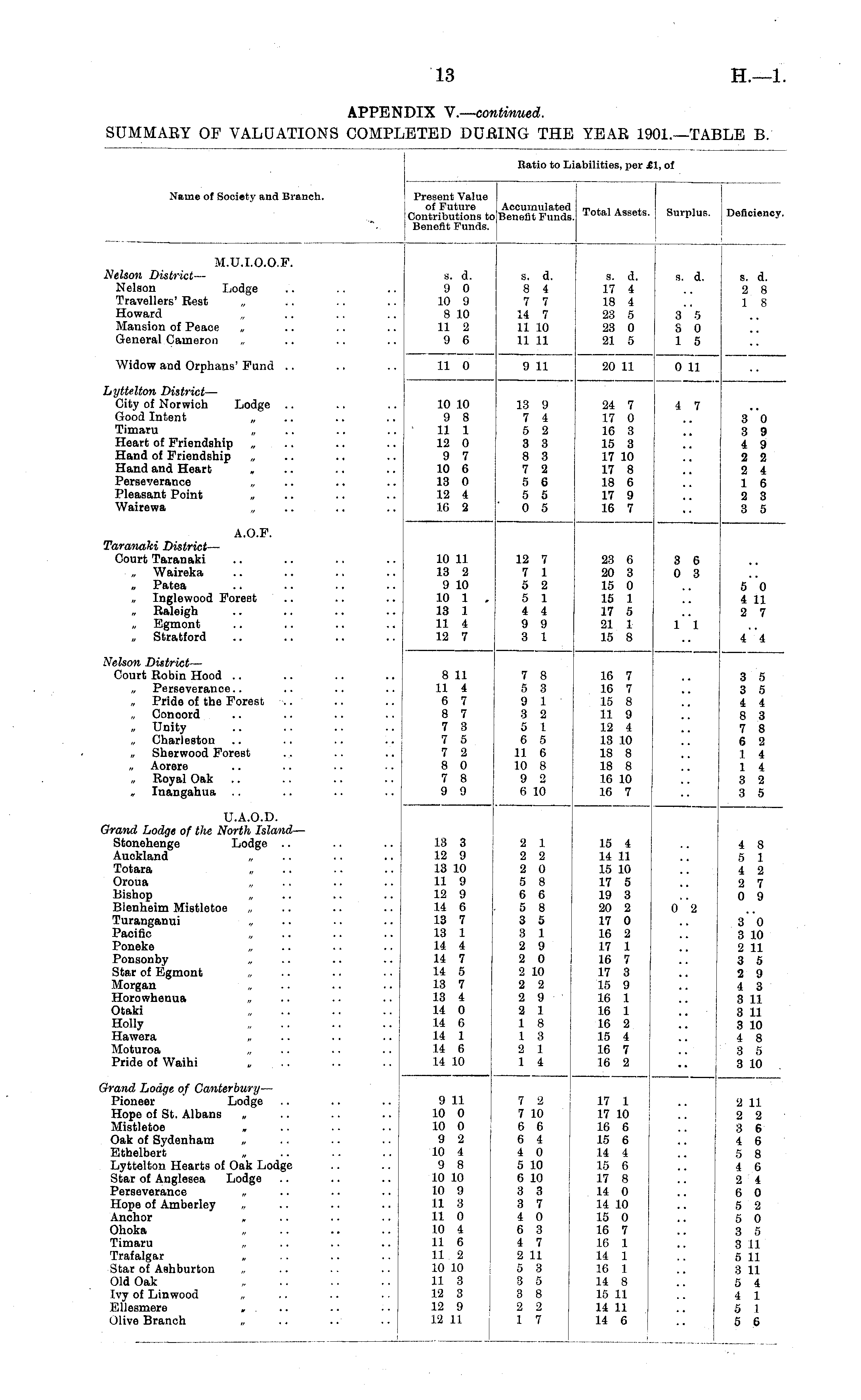 Ratio to Lii ibilities, per £. ,of Name of Society and Branch. Present Value of Future Contributions to Benefit Funds. Accumulated Benefit Funds. Total Assets. Surplus. Deficienc; M.U.I.O.O.F. Nelson District — Nelson Lodge Travellers' Rest Howard Mansion of Peace General Cameron s. d. 9 0 10 9 8 10 11 2 9 6 s. d. 8 4 7 7 14 7 11 10 11 11 s. d. 17 4 18 4 23 5 23 0 21 5 s. d. 3 5 8 0 1 5 s. d. 2 8 1 8 Widow and Orphans' Fund .. 11 0 9 11 20 11 0 11 Lyttelton District — City of Norwich Lodge .. Good Intent „ Timaru Heart of Friendship Hand of Friendship Hand and Heart Perseverance Pleasant Point Wairewa 10 10 9 8 11 1 12 0 9 7 10 6 13 0 12 4 16 2 13 9 7 4 5 2 3 3 8 3 7 2 5 6 5 5 0 5 24 7 17 0 16 3 15 3 17 10 17 8 18 6 17 9 16 7 4 7 3 0 3 9 4 9 2 2 2 4 1 6 2 3 3 5 A.O.F. Taranaki District — Court Taranaki Waireka Patea Inglewood Forest Raleigh Egmont Stratford 10 11 13 2 9 10 10 1 13 1 11 4 12 7 12 7 7 1 5 2 5 1 4 4 9 9 3 1 23 6 20 3 15 0 15 1 17 5 21 1 15 8 3 6 0 3 5 0 4 11 2 7 1 "l 4 4 Nelson District — Court Robin Hood Perseveranoe.. Pride of the Forest Conoord Unity Charleston Sherwood Forest Aorere Royal Oak Inangahua 8 11 11 4 6 7 8 7 7 3 7 5 7 2 8 0 7 8 9 9 7 8 5 3 9 1 3 2 5 1 6 5 11 6 10 8 9 2 6 10 16 7 16 7 15 8 11 9 12 4 13 10 18 8 18 8 16 10 16 7 3 5 3 5 4 4 8 3 7 8 6 2 1 4 1 4 3 2 3 5 U.A.O.D. Grand Lodge of the North Island — Stonehenge Lodge .. Auokland Totara Oroua Bishop Blenheim Mistletoe Turanganui Pacific Poneke Ponsonby Star of Egmont Morgan Horowhenua Otaki Holly Hawera Moturoa Pride of Waihi „ 13 3 12 9 13 10 11 9 12 9 14 6 13 7 13 1 14 4 14 7 14 5 13 7 13 4 14 0 14 6 14 1 14 6 14 10 2 1 2 2 2 0 5 8 6 6 5 8 3 5 3 1 2 9 2 0 2 10 2 2 2 9 2 1 1 8 1 3 2 1 1 4 15 4 14 11 15 10 17 5 19 3 20 2 17 0 16 2 17 1 16 7 17 3 15 9 16 1 16 1 16 2 15 4 16 7 16 2 0 "2 4 8 5 1 4 2 2 7 0 9 3 0 3 10 2 11 3 5 2 9 4 3 3 11 3 11 3 10 4 8 3 5 3 10 Grand Lodge of Canterbury — Pioneer Lodge Hope of St. Albans „ Mistletoe Oak of Sydenham Ethelbert Lyttelton Hearts of Oak Lodge Star of Anglesea Lodge Perseverance Hope of Amberley Anchor » Ohoka Timaru Trafalgar Star of Ashburton Old Oak „ .. Ivy of Linwood Ellesmere Olive Branch 9 11 10 0 10 0 9 2 10 4 9 8 10 10 10 9 11 3 11 0 10 4 11 6 11 2 10 10 11 3 12 3 12 9 12 11 7 2 7 10 6 6 6 4 4 0 5 10 6 10 3 3 3 7 4 0 6 3 4 7 2 11 5 3 3 5 3 8 2 2 1 7 17 1 17 10 16 6 15 6 14 4 15 6 17 8 14 0 14 10 15 0 16 7 16 1 14 1 16 1 14 8 15 11 14 11 I 14 6 2 11 2 2 3 6 4 6 5 8 4 6 2 4 6 0 5 2 5 0 3 5 3 11 5 11 3 11 5 4 4 1 5 1 5 6