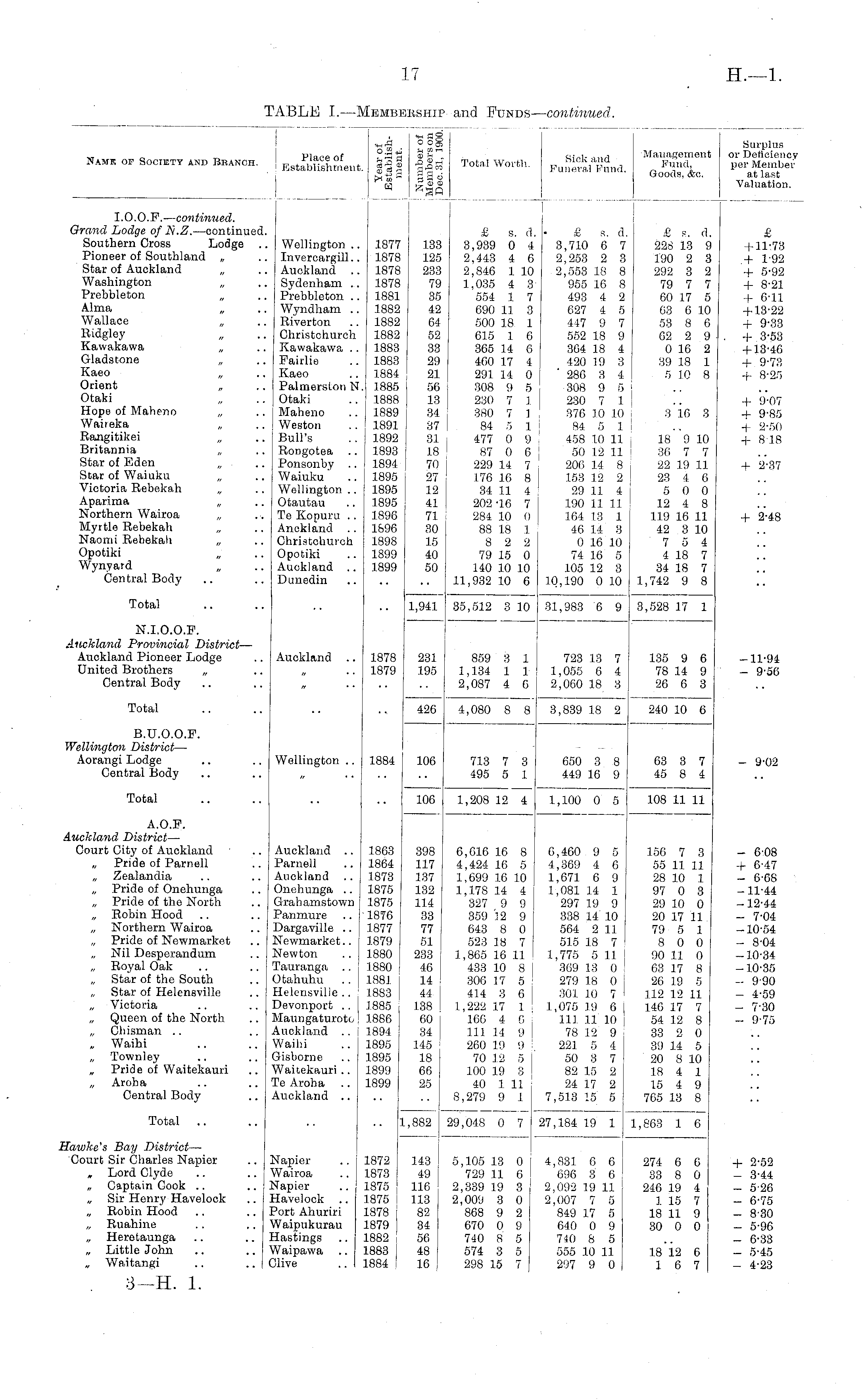Name of Society and Branch. Place of Establishment. o.S _ Ih-3 fl _d _ >tV>~ oog ■h t_ri B © © ______ Total Worth. Sick and Funeral Fund. Management Fund, Goods, tfec. Surplus or Deficiency per Member at last Valuation. | I.O.O.F.— continued. Grand Lodge of N.Z. —continued. Southern Cross Lodge Pioneer of Southland „ Star of Auckland Washington Prebbleton Alma Wallace Ridgley Kawakawa „ Gladstone ,, Kaeo Orient „ Otaki Hope of Maheno Waiieka Rangitikei Britannia Star of Eden Star of Waiuku Victoria Rebekah Aparima Northern Wairoa ,, Myi tie Rebekah Naomi Rebekah „ Opotiki ,, Wynyard „ Central Body , Wellington .. Invercargill.. Auckland .. Sydenham .. Prebbleton .. Wyndham .. Riverton Christchurch Kawakawa .. Fairlie Kaeo Palmerston N. Otaki Maheno Weston Bull's .. ] Rongotea .. Ponsonby .. Waiuku Wellington .. Otautau Te Kopuru .. Anckland .. j Christchurch Opotiki I Auckland .. Dunedin 1877 1878 1878 1878 1881 1882 1882 1882 1883 1883 1884 1885 1888 1889 1891 1892 1893 1894 1895 1895 1895 1896 1896 1898 1899 1899 133 125 233 79 35 42 64 52 33 29 21 56 13 34 37 31 18 70 27 12 41 71 30 15 40 50 £ s. cl. 3,939 0 4 2,443 4 6 2,846 1 10 1,035 4 3 554 1 7 690 11 8 500 18 1 615 1 6 365 14 6 460 17 4 291 14 0 308 9 5 230 7 1 380 7 1 84 5 1 477 0 9 87 0 6 229 14 7 176 .1.6 8 34 11 4 202 -16 7 284 10 0 88 18 1 8 2 2 79 15 0 140 10 10 11,932 10 6 £ s. d. 3,710 6 7 2,253 2 3 2,553 18 8 955 16 8 493 4 2 627 4 5 447 9 7 552 18 9 364 18 4 420 19 3 ' 286 3 4 308 9 5 230 7 1 376 10 10 84 5 1 458 10 11 50 12 11 206 14 8 153 12 2 29 11 4 190 11 11 164 13 1 46 14 3 0 16 10 74 16 5 105 12 3 10,190 0 10 £ R, Cl. 228 13 9 190 2 3 292 3 2 79 7 7 60 17 5 63 6 10 58 8 6 62 2 9 0 16 2 39 18 1 5 10 8 3 if, 3 £ + 11-73 + 1'92 + 5-92 + 8-21 + 6-11 + 13-22 + 9'33 + 3-53 + 13-46 + 9-73 + 8-25 + 9-07 + 9'85 + 2-50 + 8'18 18 9 10 36 7 7 22 19 11 23 4 6 5 0 0 12 4 8 119 16 11 42 3 10 7 5 4 4 18 7 34 18 7 1,742 9 8 + 2-37 + 2-48 Total 1,941 35,512 3 10 31,983 6 9 3,528 17 1 N.I.O.O.F. Auckland Provincial District — Auckland Pioneer Lodge United Brothers Central Body Auckland .. 1878 1879 231 195 859 3 1 1,134 1 1 2,087 4 0 723 13 7 1,055 6 4 2,000 18 3 3,839 18 2 135 9 6 78 14 9 26 6 3 -11-94 - 9-36 Total 426 4,080 8 8 j 240 10 6 B.U.O.O.F. Wellington District — Aorangi Lodge Central Body Wellington .. 713 7 3 650 3 i 495 5 1 449 16 i 650 3 8 449 16 9 - 9-02 1884 106 63 3 7 45 8 4 Total 106 1,208 12 4 1,100 0 £ 1,100 0 5 .[ 108 11 11 A.O.F. Auckland District — Court City of Auckland Pride of Parnell „ Zealandia „ Pride of Onehunga Pride of the North „ Robin Hood „ Northern Wairoa „ Pride of Newmarket ,, Nil Desperandum .. I Royal Oak .. Star of the South .. j „ Star of Helensville .. j Victoria .. Queen of the North .. | Chisman .. .. „ Waihi „ Townley Pride of Waitekauri „ Aroha Central Body Auckland .. Parnell Auckland Onehunga .. Grahams town Panmure .. ' Dargaville .. Newmarket.. Newton Tauranga .. , Otahuhu .. [ Helensville .. Devonport .. | Maungaturoto ! Auckland .. Waihi .. ! Gisborne Waitekauri .. Te Aroha Auckland .. 1863 1864 1873 1875 1875 1876 1877 1879 1880 1880 1881 1883 1.885 1886 1894 1895 1895 1899 1899 398 117 137 132 114 33 77 i 51 233 46 14 44 138 60 34 145 18 66 25 6,616 16 8 6,460 9 £ 4,424 16 5 I 4,369 4 6 1,699 16 10 | 1,071 6 II 1,178 14 4 I 1,081 14 1 327 9 9 | 297 19 9 359 12 9 i 338 14 10 643 8 0 I 504 2 11 523 18 7 , 515 18 7 1,865 16 11 ! 1,775 5 1.1 433 10 8 369 13 0 306 17 5 279 18 0 414 3 6 301 10 7 I 1,222 17 1 1,075 19 6 166 4 6 , 111 11 10 111 14 9 . 78 12 9 260 19 9 221 5 4 70 12 5 I 50 3 7 100 19 3 ! 82 15 2 40 1 11 24 17 2 8,279 9 1 7,513 15 5 6,460 9 5 4,369 4 6 1,671 6 9 1,081 14 1 297 19 9 j 338 14 10 504 2 11 515 18 7 1,775 5 11 369 13 0 279 18 0 301 10 7 1,075 19 6 111 11 10 . 78 12 9 221 5 4 50 3 7 82 15 2 24 17 2 7,513 15 5 ! 156 7 3 55 11 11 28 10 1 97 0 3 29 10 0 20 17 11 79 5 1 8 0 0 90 11 0 63 17 8 26 19 5 112 12 11 146 17 7 54 12 8 33 2 0 39 14 5 20 8 10 18 4 1 15 4 9 765 13 8 - 6-08 + 6-47 - 668 -11-44 -12-44 - 7-04 -10'54 - 8'04 -10-34 -10-35 - 990 - 4-59 - 7'30 - 975 Total 1,882 29,048 0 7 27,184 19 1 27,184 19 1 1,863 1 6 Hawke's Bay District — Court Sir Charles Napier „ Lord Clyde „ Captain Cook Sir Henry Havelook .. Robin Hood Ruahine ,. Heretaunga .. .. ,, Little John ,, Waitangi .. .. ..t Napier Wairoa Napier Havelook Port Ahuriri Waipukurau Hastings Waipawa .. j Clive .. : 1872 1873 1875 1875 1878 1879 1882 1883 1884 143 49 116 113 82 34 56 48 16 5,105 13 0 4,831 6 6 729 11 6 696 3 6 2,339 19 3 2,092 19 11 2,009 3 0 2,007 7 5 868 9 2 ,849 17 5 670 0 9 640 0 9 740 8 5 740 8 5 574 3 5 555 10 11 298 15 7 297 9 0 274 6 0 33 8 0 246 19 4 1 15 7 18 11 9 30 0 0 + 2-52 - 3-44 - 5-26 - 6-75 - 830 - 5-96 - 6-33 - 5-45 - 4-23 18 12 6 16 7