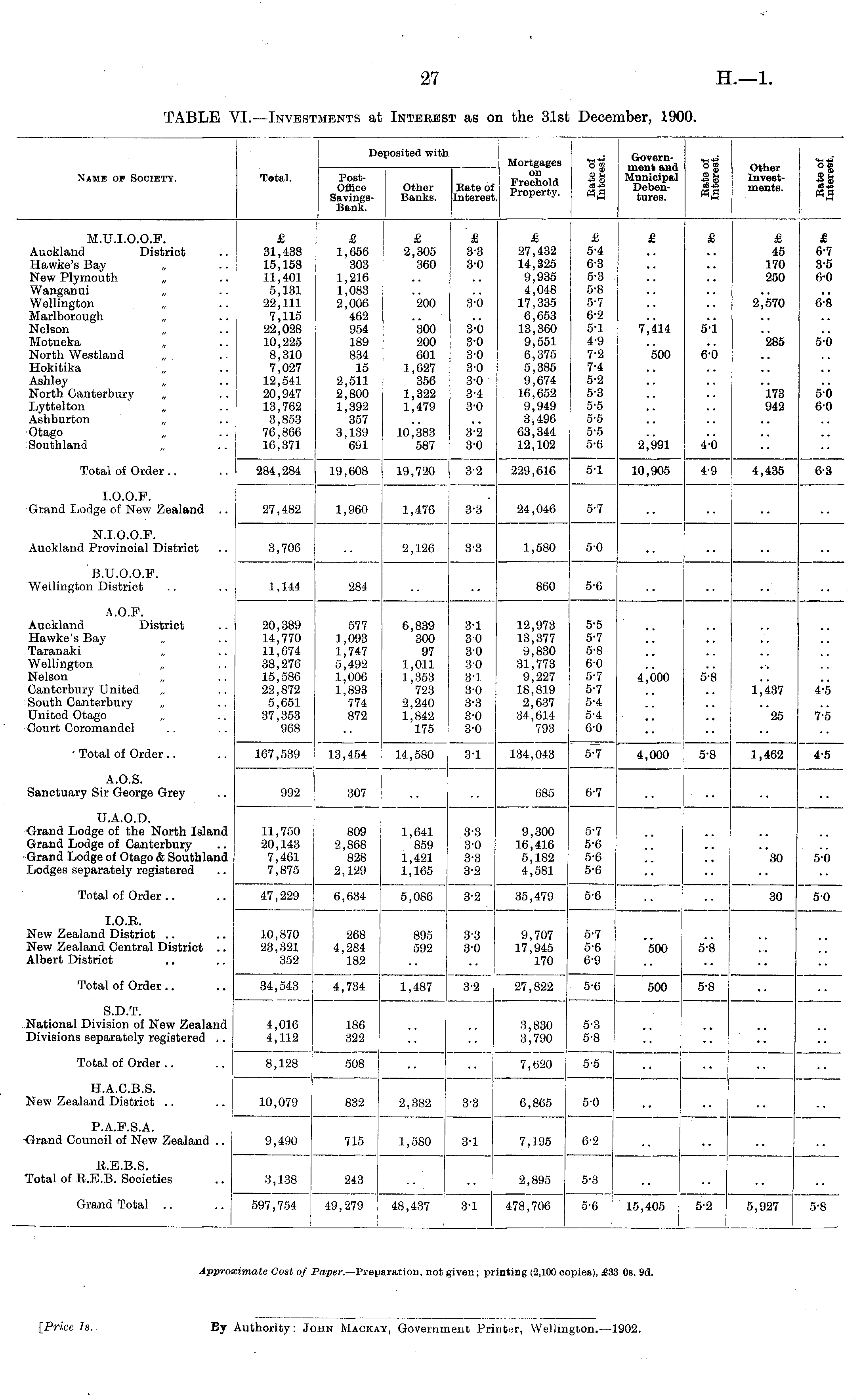 Name of Society. Total. Depo PostOffice SavingsBank. Deposited with osited witl Other Banks. :h Mortgages on Rate of Freehold Interest. *"*•«*■ t*H +* °£ © tH ■g * PH A "rt Government and Municipal Debentures. <n-t=> O B9 © U "§ ° P. A ~^rt Other Investments. O 00 _, SO P. A "m M.U.I.O.O.F. Auckland District Hawke's Bay „ New Plymouth Wanganui Wellington Marlborough Nelson Motueka North Westland Hokitika Ashley North Canterbury Lyttelton „ Ashburton „ Otago Southland £ 31,438 15,158 11,401 5,131 22,111 7,115 22,028 10,225 8,310 7,027 12,541 20,947 13,762 3,853 76,866 16,371 £ 1,656 303 1,216 1,083 2,006 462 954 189 834 15 2,511 2,800 1,392 357 3,139 691 £ 2,305 360 £ 3'3 3.1 £ 27,432 14,325 9,935 4,048 17,335 6,653 13,360 9,551 6,375 5,385 9,674 16,652 9,949 3,496 63,344 12,102 £ 5-4 6-3 5-3 5-8 5-7 6-2 5-1 4-9 7-2 7.4 5-2 5-3 5-5 5-5 5-5 5-6 £ £ £ 45 170 250 £ 6-7 8-8 6-0 200 3-6 2| 570 6*8 300 200 601 1,627 356 1,322 1,479 3-0 30 3-0 3-0 3-0 3-4 3-0 7,414 _'i 285 5-6 500 6-6 173 942 5-0 60 10,383 587 3-2 3-0 2J991 4"-6 Total of Order 284,284 19,608 5-1 19,720 3-2 229,616 10,905 4'9 4,435 6-3 I.O.O.F. Grand Lodge of New Zealand .. 3-8 27,482 1,960 1,476 24,046 5-7 N.I.O.O.F. Auckland Provincial District 3,706 2,126 :3-3 1,580 5-0 B.U.O.O.F. Wellington District 1,144 284 860 5-6 A.O.F. Auckland District Hawke's Bay Taranaki Wellington. Nelson Canterbury United South Canterbury United Otago Court Coromandel 20,389 14,770 11,674 38,276 15,586 22,872 5,651 37,353 968 577 1,093 1,747 5,492 1,006 1,893 774 872 6,839 300 97 1,011 1,353 723 2,240 1,842 175 3-1 30 30 3-0 3-1 3-0 3-3 3. 3-0 12,973 13,377 9,830 31,773 9,227 18,819 2,637 34,614 793 5-5 5-7 5-8 6-0 5-7 5-7 5-4 5-4 6-0 4,000 _'•_ l,'-37 4-5 25 7-5 • Total of Order 167,539 13,454 14,580 8-1 134,043 5- 7 4,000 5-8 1,462 4-5 A.O.S. Sanctuary Sir George Grey 992 307 685 6-7 U.A.O.D. Grand Lodge of the North Island Grand Lodge of Canterbury Grand Lodge of Otago & Southland Lodges separately registered 11,750 20,143 7,461 7,875 47,229 809 2,868 828 2,129 1,641 859 1,421 1,165 3-3 3-0 3-3 3-2 9,300 16,416 5,182 4,581 5-7 5-6 5-6 5-6 30 5-6 Total of Order 6,634 5,086 .1 3-2 35,479 5-6 30 50 I.O.R. New Zealand District New Zealand Central District .. Albert District 10,870 23,321 352 268 ! 4,284 182 895 592 3-3 3-0 9,707 17,945 170 5-7 5-6 6-9 500 5-8 Total of Order 34,543 4,734 1,487 8-2 27,822 5-6 500 5-8 S.D.T. National Division of New Zealand Divisions separately registered .. 4,016 4,112 186 322 3,830 3,790 5-3 5-8 Total of Order 8,128 508 7,620 5-5 H.A.C.B.S. New Zealand District 10,079 832 2,382 33 6,865 5-0 P.A.F.S.A. Grand Council of New Zealand .. 9,490 715 1,580 3-1 7,195 6-2 R.E.B.S. Total of R.E.B. Societies 3,138 243 2,895 5-3 Grand Total .. 597,754 49,279 48,437 8-1 478,706 5-6 15,405 5-2 5,927 5-8