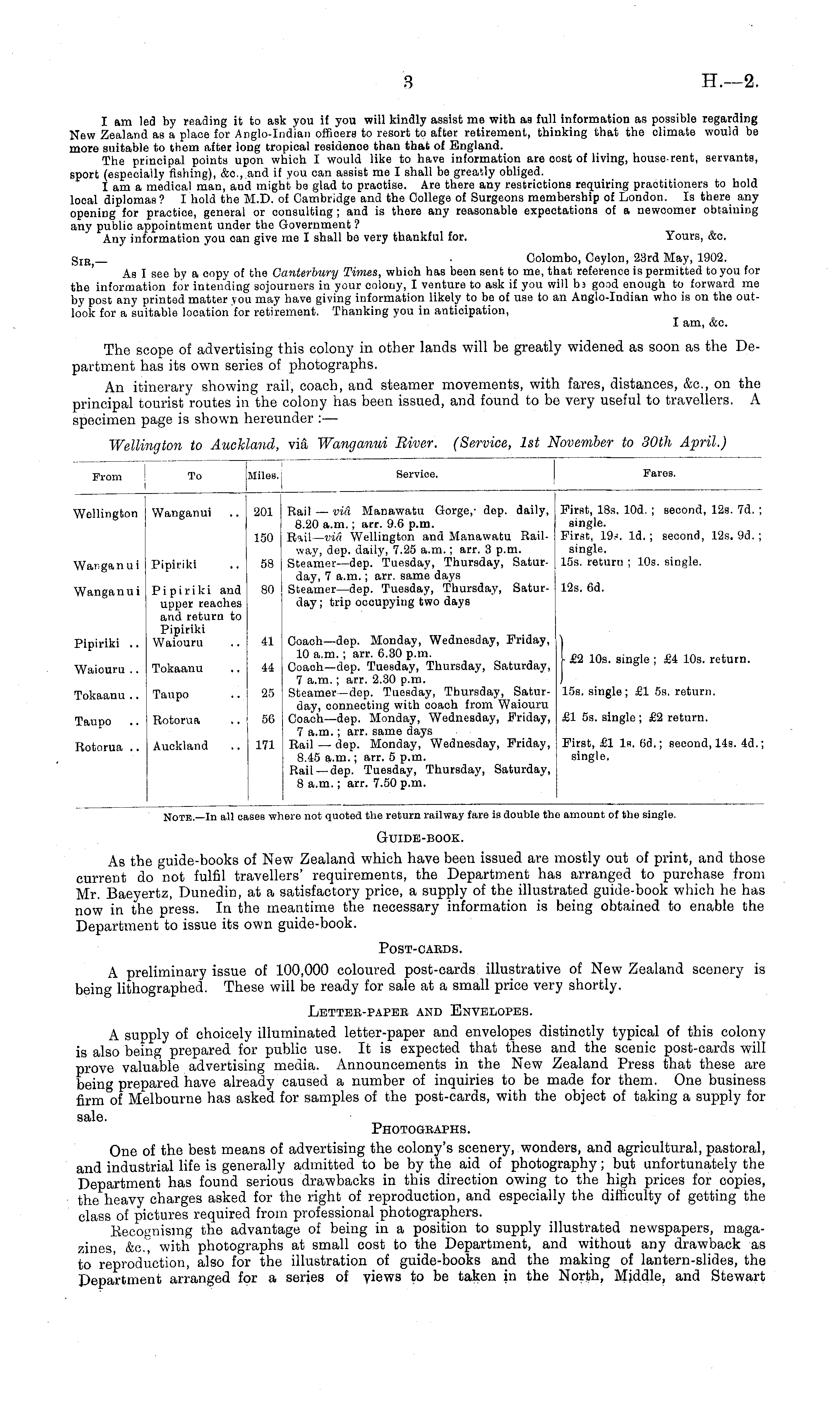 I am led by reading it to ask you if you will kindly assist me with as full information as possible regarding New Zealand as a place for Anglo-Indian officers to resort to after retirement, thinking that the climate would be more suitable to them after long tropical residenoe than that of England. The principal points upon which I would like to have information are cost of living, house-rent, servants, sport (especially fishing), &o.,.and if you can assist me I shall be greatly obliged. lam a medical man, and might be glad to practise. Are there any restrictions requiring practitioners to hold local diplomas? I hold the M.D. of Cambridge and the College of Surgeons membership of London. Is there any opening for practice, general or consulting ; and is there any reasonable expectations of a newcomer obtaining any public appointment under the Government ? Any information you can give me I shall be very thankful for. Yours, &c. Sijj _ Colombo, Ceylon, 23rd May, 1902. As I see by a oopy of the Canterbury Times, whioh has been sent to me, that reference is permitted to you for the information for intending sojourners in your colony, I venture to ask if you will b) good enough to forward me by post any printed matter you may have giving information likely to be of use to an Anglo-Indian who is on the outlook for a suitable location for retirement. Thanking you in anticipation, I am, &c. The scope of advertising this colony in other lands will be greatly widened as soon as the Department has its own series of photographs. An itinerary showing rail, coach, and steamer movements, with fares, distances, &c, on the principal tourist routes in the colony has been issued, and found to be very useful to travellers. A specimen page is shown hereunder : —