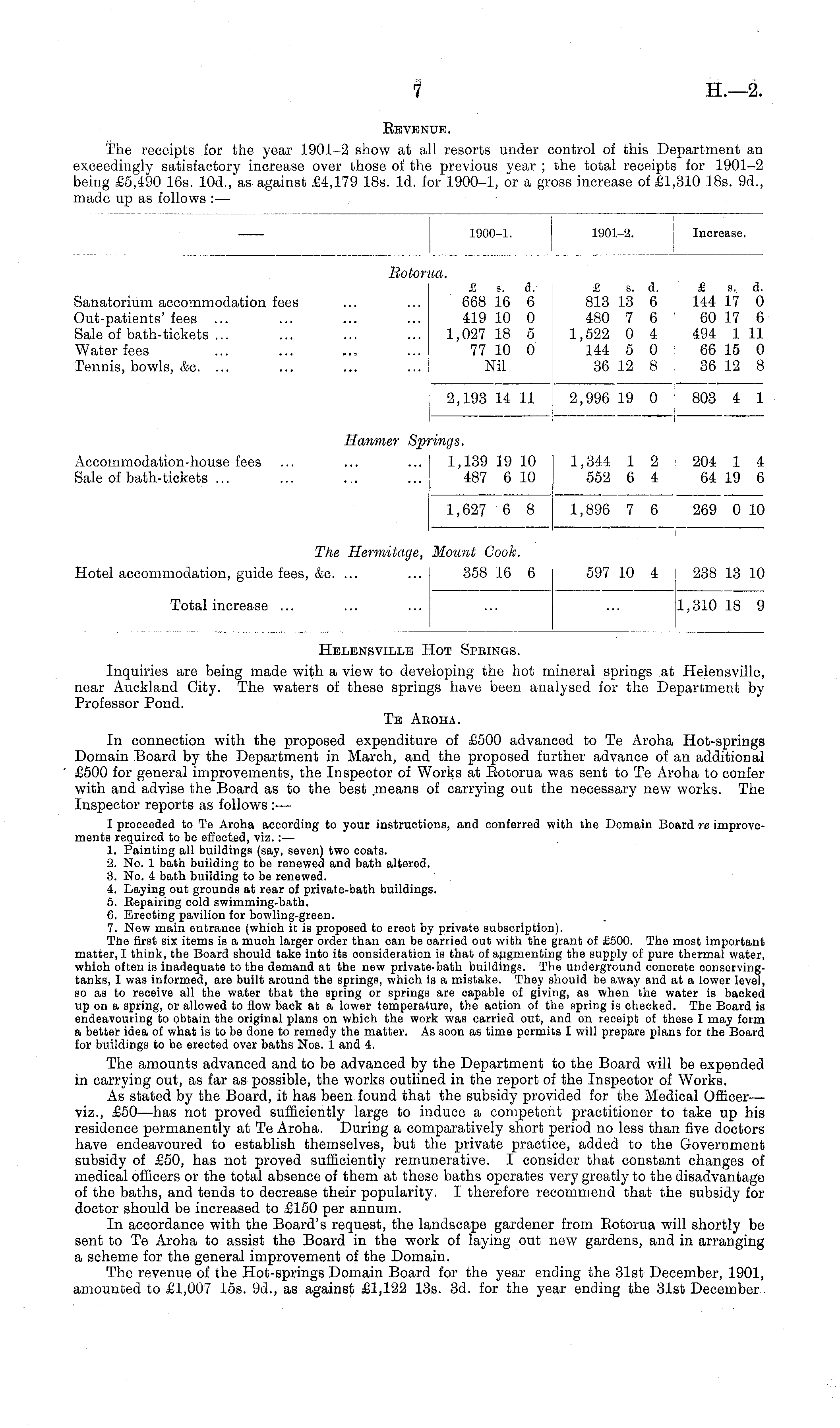 Revenue. The receipts for the year 1901-2 show at all resorts under control of this Department an exceedingly satisfactory increase over those of the previous year; the total receipts for 1901-2 being £5,490 16s. 10d., as against £4,179 18s. 1d. for 1900-1, or a gross increase of £1,310 18s. 9d., made up as follows: —