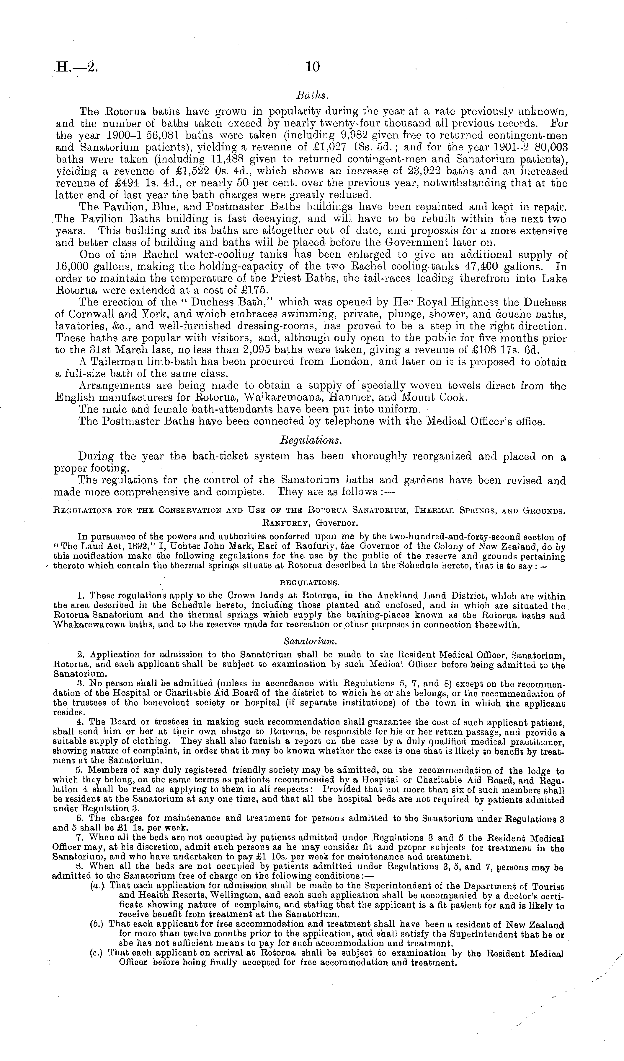 Baths. The Botorua baths have grown in popularity during the year at a rate previously unknown, and the number of baths taken exceed by nearly twenty-four thousand all previous records. For the year 1900-1 56,081 baths were taken (including 9,982 given free to returned contingent-men and Sanatorium patients), yielding a revenue of £1,027 18s. 5d.; and for the year 1901-2 80,003 baths were taken (including 11,488 given to returned contingent-men and Sanatorium patients), yielding a revenue of £1,522 os. 4d., which shows an increase of 23,922 baths and an increased revenue of £494 Is. 4d., or nearly 50: per cent, over the previous year, notwithstanding that at the latter end of last year the bath charges were greatly reduced. The Pavilion, Blue, and Postmaster Baths buildings have been repainted and kept in repair. The Pavilion Baths building is fast decaying, and will have to be rebuilt within the next two years. This building and its baths are altogether out of date, and proposals for a more extensive and better class of building and baths will be placed before the Government later on. One of the Bachel water-cooling tanks has been enlarged to give an additional supply of 16,000 gallons, making the holding-capacity of the two Bachel cooling-tanks 47,400 gallons. In order to maintain the temperature of the Priest Baths, the tail-races leading therefrom into Lake Botorua were extended at a cost of £175. The erection of the " Duchess Bath," which was opened by Her Boyal Highness the Duchess of Cornwall and York, and which embraces swimming, private, plunge, shower, and douche baths, lavatories, &c, and well-furnished dressing-rooms, has proved to be a step in the right direction. These baths are popular with visitors, and, although only open to the public for five months prior to the 31st March last, no less than 2,095 baths were taken, giving a revenue of £108 17s. 6d. A Tallerman limb-bath has been procured from London, and later on it is proposed to obtain a full-size bath of the same class. Arrangements are being made to obtain a supply of specially woven towels direct from the English manufacturers for Botorua, Waikaremoana, Hanmer, and Mount Cook. The male and female bath-attendants have been put into uniform. The Postmaster Baths have been connected by telephone with the Medical Officer's office. Regulations. During the year the bath-ticket system has beeu thoroughly reorganized and placed on a proper footing. The regulations for the control of the Sanatorium baths and gardens have been revised and made more comprehensive and complete. They are as follows : — Regulations for the Conservation and Use of the Rotorua Sanatorium, Thermal Springs, and Grounds. Ranfubly, Governor. In pursuance of the powers and authorities conferred upon me by the two-hundred-and-forty-second section of "The Land Act, 1892," I, Uchter John Mark, Earl of Raafurly, the Governor of the Colony of New Zealand, do by this notification make the following regulations for the use by the public of the reserve and grounds pertaining thereto which contain the thermal springs situate at Rotorua described in the Schedule hereto, that is to say:— REGULATIONS. 1. These regulations apply to the Crown lands at Rotorua, in the Auckland Land District, which are within the area described in the Schedule hereto, including those planted and enclosed, and in which are situated the Rotorua Sanatorium and the thermal springs which supply the bathing-places known as the Rotorua baths and Whakarewarewa baths, and to the reserves made for recreation or other purposes in connection therewith. Sanatorium. 2. Application for admission to the Sanatorium shall be made to the Resident Medical Offioer, Sanatorium, Rotorua, and each applicant shall be subject to examination by such Medical Officer before being admitted to the Sanatorium. 3. No person shall be admitted (unless in accordance with Regulations 5, 7, and 8) except on the recommendation of the Hospital or Charitable Aid Board of the district to which he or she belongs, or the recommendation of the trustees of the benevolent society or hospital (if separate institutions) of the town in which the applioant resides. 4. The Board or trustees in making such recommendation shall guarantee the cost of such applicant patient, shall send him or her at their own charge to Rotorua, be responsible for his or her return passage, and provide a suitable supply of clothing. They shall also furnish a report on the case by a duly qualified medical practitioner, showing nature of complaint, in order that it may be known whether the case is one that is likely to benefit by treatment at the Sanatorium. 5. Members of any duly registered friendly society may be admitted, on the recommendation of the lodge to which they belong, on the same terms as patients recommended by a Hospital or Charitable Aid Board, and Regulation 4 shall be read as applying to them in all respects: Provided that not more than six of such members shall be resident at the Sanatorium at any one time, and that all the hospital beds are not required by patients admitted under Regulation 3. 6. The charges for maintenance and treatment for persons admitted to the Sanatorium under Regulations 3 and 5 shall be £1 Is. per week. 7. When all the beds are not occupied by patients admitted under Regulations 3 and 5 the Resident Medical Officer may, at his discretion, admit such persons as he may consider fit and proper subjects for treatment in the Sanatorium, and who have undertaken to pay £1 10s. per week for maintenance and treatment. 8. When all the beds are not occupied by patients admitted under Regulations 3, 5, and 7, persons may be admitted to the Sanatorium free of charge on the following conditions: — (a.) That each application for admission shall be made to the Superintendent of the Department of Tourist and Health Resorts, Wellington, and each such application shall be accompanied by a doctor's certificate showing nat