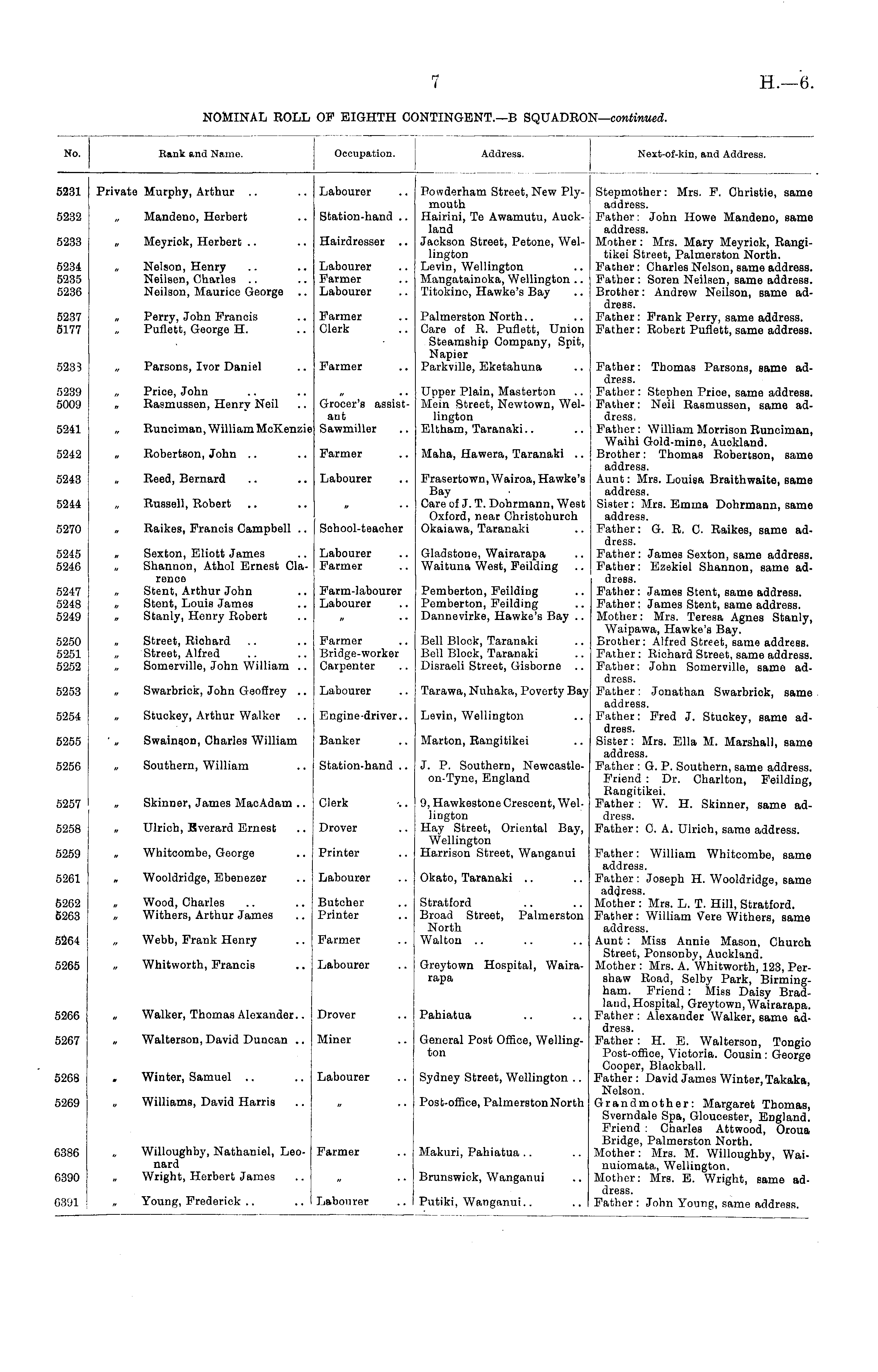 iO. :an ani [sine. iccupal :ion. Iress. ex1 i-o :in, am Iress. 5231 Private Murphy, Arthur Labourer Powderham Street, New Plymouth Hairini, Te Awamutu, Auckland Jackson Street, Petone, Wellington Levin, Wellington Mangatainoka, Wellington .. Titokino, Hawke's Bay Stepmother: Mrs. F. Christie, same address. Father: John Howe Mandeno, same address. Mother : Mrs. Mary Meyriok, Rangitikei Street, Palmerston North. Father: Charles Nolson, same address. Father : Soren Neilsen, same address. Brother: Andrew Neilson, same address. Father : Frank Perry, same address. Father: Robert Puflett, same address. 5232 Mandeno, Herbert Station-hand .. 5233 Meyriok, Herbert Hairdresser .. 5234 5235 5236 Nelson, Henry Neilsen, Charles .. Neilson, Maurice George .. Labourer Farmer Labourer 5237 5177 Perry, John Francis Puflett, George H. Farmer Clerk Palmerston North Care of R. Puflett, Union Steamship Company, Spit, Napier Parkville, Eketahuna 5233 Parsons, Ivor Daniel Farmer Father: Thomas Parsons, same address. Father : Stephen Prioe, same address. Father: Neil Rasmussen, same address, Father: William Morrison Runciman, Waihi Gold-mine, Auokland. Brother: Thomas Robertson, same address. Aunt: Mrs. Louisa Braithwaite, same address. Sister: Mrs. Emma Dohrmann, same address. Father: G. R. C. Raikes, same address. Father : James Sexton, same address. Father: Ezekiel Shannon, same address. Father: James Stent, same address. Father ; James Stent, same address. Mother: Mrs. Teresa Agnes Stanly, Waipawa, Hawke's Bay. Brother: Alfred Street, same address. Father : Richard Street, same address. Father: John Somerville, same address. Father: Jonathan Swarbrick, same address. Father: Fred J. Stuckey, same address. Sister: Mrs. Ella M. Marshall, same address. Father : G. P. Southern, same address. Friend : Dr. Charlton, Feilding, Rangitikei. Father : W. H. Skinner, same address. Father: C. A. Ulrich, same address. 5239 5009 „ Price, John Rasmussen, Henry Neil Grocer's assistant Sawmiller Upper Plain, Masterton Mein Street, Newtown, Wellington Eltham, Taranaki 5241 Runciman, William McKenzie 5242 Robertson, John Farmer Maha, Hawera, Taranaki .. 5243 Reed, Bernard Labourer Frasertown, Wairoa, Hawke's Bay Care of J. T. Dohrmann, West Oxford, near Christchurch Okaiawa, Taranaki 5244 Russell, Robert H • • 5270 Raikes, Francis Campbell .. School-teacher 5245 5246 5247 5248 5249 „ Sexton, Eliott James Shannon, Athol Ernest Clarence Stent, Arthur John „ Stent, Louis James Stanly, Henry Robert Labourer Farmer Farm-labourer Labourer Gladstone, Wairarapa Waituna West, Feilding Pemberton, Feilding Pemberton, Feilding Dannevirke, Hawke's Bay .. 5250 5251 5252 Street, Richard Street, Alfred Somerville, John William .. Farmer Bridge-worker Carpenter Bell Blook, Taranaki Bell Block, Taranaki Disraeli Street, Gisborne .. 5253 Swarbrick, John Geoffrey .. Labourer Tarawa, Nuhaka, Poverty Bay 5254 „ Stuckey, Arthur Walker Engine-driver.. Levin, Wellington 5255 Swainson, Charles William Banker Marton, Rangitikei 5256 „ Southern, William Station-hand .. J. P. Southern, Newcastle-on-Tyne, England 5257 Skinner, James MacAdam .. Clerk 9, Hawkestone Crescent, Wellington Hay Street, Oriental Bay, Wellington Harrison Street, Wanganui 5258 „ Ulrich, Everard Ernest Drover 5259 Whitcombe, George Printer Father: William Whitcombe, same address. Father : Joseph H. Wooldridge, same address. Mother : Mrs. L. T. Hill, Stratford. Father: William Vere Withers, same address. Aunt : Miss Annie Mason, Church Street, Ponsonby, Auckland. Mother : Mrs. A. Whitworth, 123, Pershaw Road, Selby Park, Birmingham. Friend : Mies Daisy Bradland, Hospital, Greytown, Wairarapa. Father : Alexander Walker, same address. Father : H. E. Walterson, Tongio Post-office, Victoria. Cousin : George Cooper, Blackball. Father : David James Winter, Takaka, Nelson. Grandmother: Margaret Thomas, Sverndale Spa, Gloucester, England. Friend : Charles Attwood, Oroua Bridge, Palmerston North. Mother: Mrs. M. Willoughby, Wainuiomata, Wellington. Mother: Mrs. E. Wright, same address. Father : John Young, same address. 5261 „ Wooldridge, Ebenezer Labourer Okato, Taranaki 5262 5263 „ Wood, Charles „ Withers, Arthur James Butcher Printer Stratford Broad Street, Palmerston North Walton .. 5264 Webb, Frank Henry Farmer 5265 Whitworth, Francis Labourer Greytown Hospital, Wairarapa Walker, Thomas Alexander.. Drover Pahiatua 5266 5267 Walterson, David Duncan .. Miner General Post Office, Wellington 5268 Winter, Samuel .. Labourer Sydney Street, Wellington .. 5269 Williams, David Harris Post-office, Palmerston North Willoughby, Nathaniel, Leonard Wright, Herbert James Farmer Makuri, Pahiatua 6386 6390 Brunswick, Wanganui G391 Young, Frederick Labourer Putiki, Wanganui.. .. I