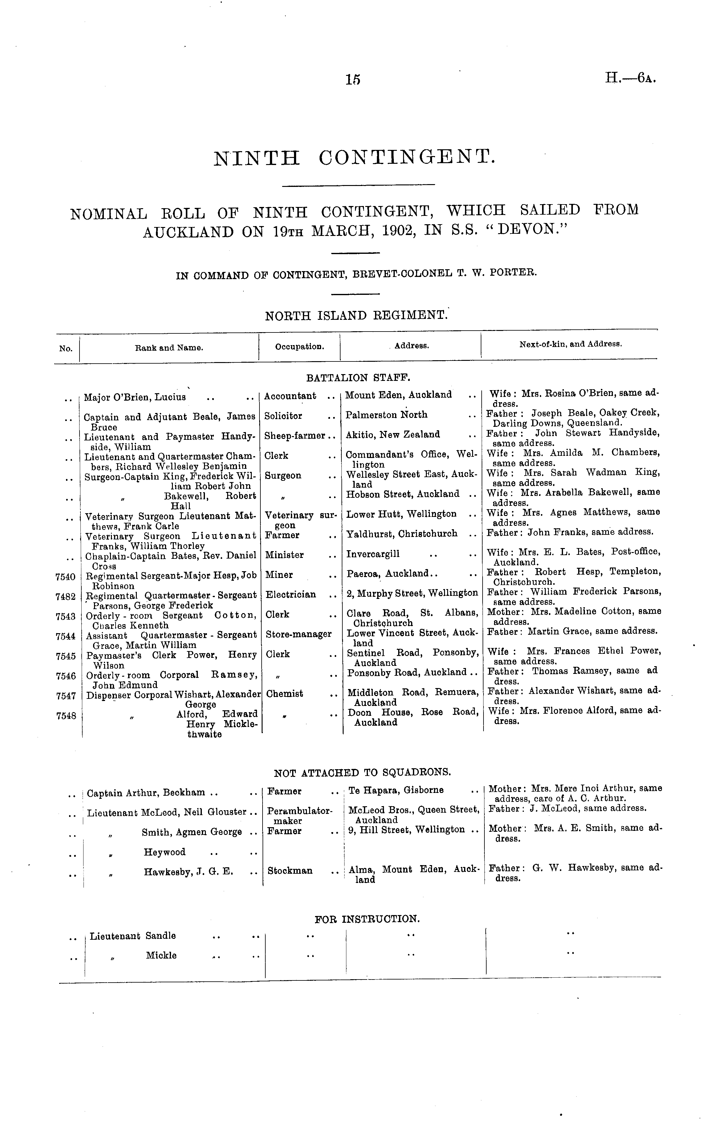 NOMINAL EOLL OF NINTH CONTINGENT, WHICH SAILED FEOM AUCKLAND ON 19th MAECH, 1902, IN S.S. " DEVON."