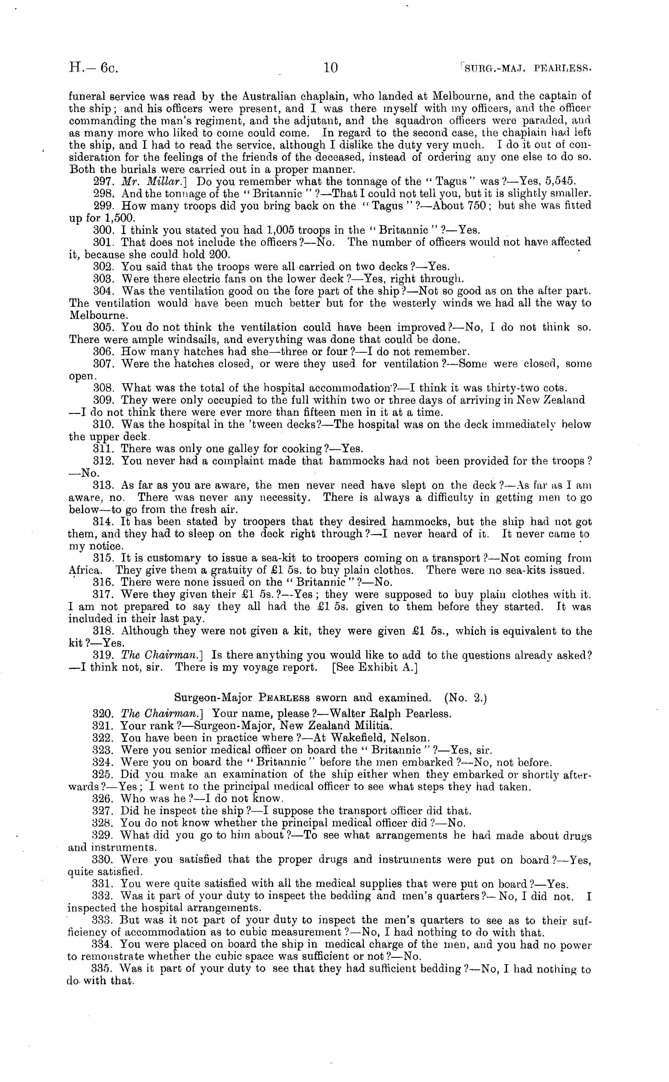 funeral service was read by the Australian chaplain, who landed at Melbourne, and the captain of the ship; and his officers were present, and I was there myself with my officers, and the officer commanding the man's regiment, and the adjutant, and the squadron officers were paraded, and as many more who liked to come could come. In regard to the second case, the chaplain had left the ship, and I had to read the service, although I dislike the duty very much. [do it out of consideration for the feelings of the friends of the deceased, instead of ordering any one else to do so. Both the burials were carried out in a proper manner. 297. Mr. Millar.] Do you remember what the tonnage of the " Tagus " was ? —Yes, 5,545. 298. And the tonnage of the " Britannic " ?— That I could not tell you, but it is slightly smaller. 299. How many troops did you bring back on the " Tagus " ? —About 750; but she was fitted up for 1,500. 300. I think you stated you had 1,005 troops in the "Britannic " ?—Yes. 301. That does not include the officers?— No. The number of officers would not have affected it, because she could hold 200. 302. You said that the troops were all carried on two decks ?—Yes. 303. Were there electric fans on the lower deck ?—Yes, right through. 304. Was the ventilation good on the fore part of the ship?— Not so good as on the after part. The ventilation would have been much better but for the westerly winds we had all the way to Melbourne. 305. You do not think the ventilation could have been improved?—No, I do not think so. There were ample windsails, and everything was done that could be done. 306. How many hatches had she—three or four?—l do not remember. 307. Were the hatches closed, or were they used for ventilation? —Some were closed, some open. 308. What was the total of the hospital accommodation'? —I think it was thirty-two cots. 309. They were only occupied to the full within two or three days of arriving in New Zealand —I do not think there were ever more than fifteen men in it at a time. 310. Was the hospital in the 'tween decks?— The hospital was on the deck immediately below the upper deck 311. There was only one galley for cooking?— Yes. 312. You never had a complaint made that hammocks had not been provided for the troops ? —No. 313. As far as you are aware, the men never need have slept on the deck ?—As far as I am aware, no. There was never any necessity. There is always a difficulty in getting men to go below 7 —to go from the fresh air. 314. It has been stated by troopers that they desired hammocks, but the ship had not got them, and they had to sleep on the deck right through?—l never heard of it. It never came to my notice. 315. It is customary to issue a sea-kit to troopers coining on a transport ?—Not coming from Africa. They give them a gratuity of £1 ss. to buy plain clothes. There were no sea-kits issued. 316. There were none issued on the " Britannic " ?—No. 317. Were they given their £1 ss. ? —Yes ; they were supposed to buy plain clothes with it. lam not prepared to say they all had the £1 ss. given to them before they started. It was included in their last pay. 318. Although they were not given a kit, they were given £1 55., which is equivalent to the kit ?—Yes. 319. The Chairman.] Is there anything you would like to add to the questions already asked? —I think not, sir. There is my voyage report. [See Exhibit A.] Surgeon-Major Pbarless sworn and examined. (No. 2.) 320. The Chairman.] Your name, please ?—Walter Ealph Fearless. 321. Your rank ?—Surgeon-Major, New Zealand Militia. 322. You have been in practice where ?—At Wakefield, Nelson. 323. Were you senior medical officer on board the " Britannic " ?—Yes, sir. 324. Were you on board the "Britannic" before the men embarked ?—No, not before. 325. Did you make an examination of the ship either when they embarked or shortly afterwards? —Yes; I went to the principal medical officer to see what steps they had taken. 326. Who was he ?—I do not know. 327. Did he inspect the ship? —I suppose the transport officer did that. 328. You do not know whether the principal medical officer did ?—No. 329. What did you go to him about?—To see what arrangements he had made about druj's and instruments. 330. Were you satisfied that the proper drugs and instruments were put on board ?—Yes, quite satisfied. 331. You were quite satisfied with all the medical supplies that were put on board?— Yes. 332. Was it part of your duty to inspect the bedding and men's quarters ?— No, I did not. I inspected the hospital arrangements. 333. But was it not part of your duty to inspect the men's quarters to see as to their sufficiency of accommodation as to cubic measurement ?—No, I had nothing to do with that. 334. You were placed on board the ship in medical charge of the men, and you had no power to remonstrate whether the cubic space was sufficient or not?— No. 335. Was it part of your duty to see that they had sufficient bedding?—No, I had nothing to do with that.