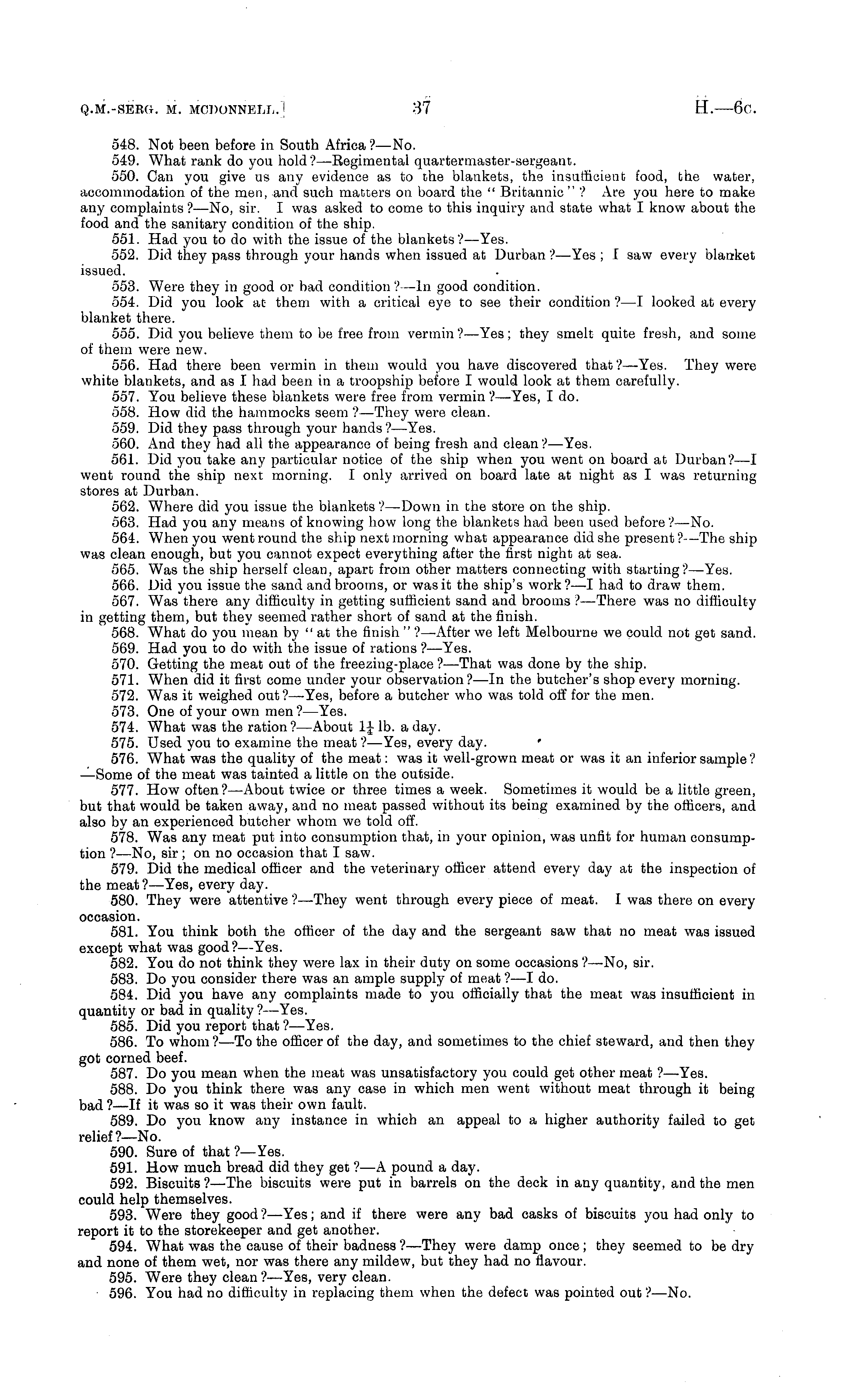 548. Not been before in South Africa ?—No. 549. What rank do you hold?—Eegimental quartermaster-sergeant. 550. Cau you give us any evidence as to the blankets, the insufficient food, the water, accommodation of the men, and such matters on board the " Britannic " ? Are you here to make any complaints ? —No, sir. I was asked to come to this inquiry and state what I know about the food and the sanitary condition of the ship. 551. Had you to do with the issue of the blankets? —Yes. 552. Did they pass through your hands when issued at Durban ?—Yes ; I saw every blanket issued. 553. Were they in good or bad condition ?—ln good condition. 554. Did you look at- them with a critical eye to see their condition ?—I looked at every blanket there. 555. Did you believe them to be free from vermin?— Yes; they smelt quite fresh, and some of them were new. 556. Had there been vermin in them would you have discovered that ?—-Yes. They were white blankets, and as I had been in a troopship before I would look at them carefully. 557. You believe these blankets were free from vermin ?—Yes, I do. 558. How did the hammocks seem ?—They were clean. 559. Did they pass through your hands?— Yes. 560. And they had all the appearance of being fresh and clean? —Yes. 561. Did you take any particular notice of the ship when you went on board at Durban?—l went round the ship next morning. I only arrived on board late at night as I was returning stores at Durban. 562. Where did you issue the blankets ?—Down in the store on the ship. 563. Had you any means of knowing how long the blankets had been used before ?—No. 564. When you went round the ship next morning what appearance did she present ?—The ship was clean enough, but you cannot expect everything after the first night at sea. 565. Was the ship herself clean, apart from other matters connecting with starting?— Yes. 566. Did you issue the sand and brooms, or was it the ship's work ?—I had to draw them. 567. Was there any difficulty in getting sufficient sand and brooms ?—There was no difficulty in getting them, but they seemed rather short of sand at the finish. 568. What do you mean by " at the finish " ?—After we left Melbourne we could not get sand. 569. Had you to do with the issue of rations ?—Yes. 570. Getting the meat out of the freezing-place ?—That was done by the ship. 571. When did it first come under your observation? —In the butcher's shop every morning. 572. Was it weighed out ?—Yes, before a butcher who was told off for the men. 573. One of your own men? —Yes. 574. What was the ration? —About 1J lb. a day. 575. Used you to examine the meat ?—Yes, every day. ' 576. What was the quality of the meat: was it well-grown meat or was it an inferior sample ? —Some of the meat was tainted a little on the outside. 577. How often? —About twice or three times a week. Sometimes it would be a little green, but that would be taken away, and no meat passed without its being examined by the officers, and also by an experienced butcher whom we told off. 578. Was any meat put into consumption that, in your opinion, was unfit for human consumption ?—No, sir; on no occasion that I saw. 579. Did the medical officer and the veterinary officer attend every day at the inspection of the meat? —Yes, every day. 580. They were attentive ?—They went through every piece of meat. I was there on every occasion. 581. You think both the officer of the day and the sergeant saw that no meat was issued except what was good?— Yes. 582. You do not think they were lax in their duty on some occasions ?—No, sir. 583. Do you consider there was an ample supply of meat ? —I do. 584. Did you have any complaints made to you officially that the meat was insufficient in quantity or bad in quality ? —Yes. 585. Did you report that ?—Yes. 586. To whom ?—To the officer of the day, and sometimes to the chief steward, and then they got corned beef. 587. Do you mean when the meat was unsatisfactory you could get other meat ?—-Yes. 588. Do you think there was any case in which men went without meat through it being bad ?—lf it was so it was their own fault. 589. Do you know any instance in which an appeal to a higher authority failed to get relief?— No. 590. Sure of that ?—Yes. 591. How much bread did they get ?—A pound a day. 592. Biscuits? —The biscuits were put in barrels on the deck in any quantity, and the men could help themselves. 593. Were they good? —Yes; and if there were any bad casks of biscuits you had only to report it to the storekeeper and get another. 594. What was the cause of their badness ?—They were damp once; they seemed to be dry and none of them wet, nor was there any mildew, but they had no flavour. 595. Were they clean ?—Yes, very clean. ■ 596. You had no difficulty in replacing them when the defect was pointed out ?—No.