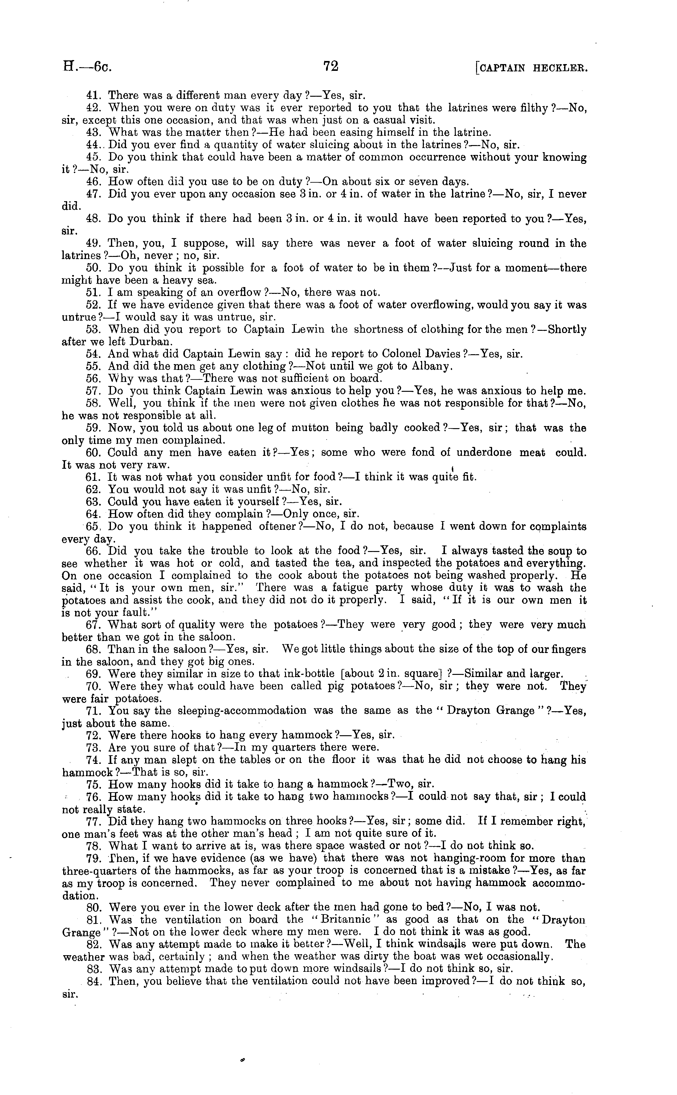41. There was a different man every day? —Yes, sir. 42. When you were on duty was it ever reported to you that the latrines were filthy ?—No, sir, except this one occasion, and that was when just on a casual visit. 43. What was the matter then ? —He had been easing himself in the latrine. 44.. Did you ever find a quantity of water sluicing about in the latrines?—No, sir. 45. Do you think that could have been a matter of common occurrence without your knowing it ?—No, sir. 46. How often did you use to be on duty ?—On about six or seven days. 47. Did you ever upon any occasion see 3 in. or 4 in. of water in the latrine?—No, sir, I never did. 48. Do you think if there had been 3 in. or 4 in. it would have been reported to you ?—Yes, sir. 49. Then, you, I suppose, will say there was never a foot of water sluicing round in the latrines ?—Oh, never ; no, sir. 50. Do you think it possible for a foot of water to be in them ?—Just for a moment —there might have been a heavy sea. 51. I am speaking of an overflow ?—■Nβ, there was not. 52. If we have evidence given that there was a foot of water overflowing, would you say it was untrue?—l would say it was untrue, sir. 53. When did you report to Captain Lewin the shortness of clothing for the men ?—Shortly after we left Durban. 54. And what did Captain Lewin say : did he report to Colonel Davies ?—Yes, sir. 55. And did the men get any clothing?— Not until we got to Albany. 56. Why was that ?—There was not sufficient on board. 57. Do you think Captain Lewin was anxious to help you?— Yes, he was anxious to help me. 58. Well, you think if the men were not given clothes he was not responsible for that ?—No, he was not responsible at all. 59. Now, you told us about one leg of mutton being badly cooked ?—Yes, sir; that was the only time my men complained. 60. Could any men have eaten it ?—Yes; some who were fond of underdone meat could. It was not very raw. , 61. It was not what you consider unfit for food?—I think it was quite fit. 62. You would not say it was unfit ? —No, sir. 63. Could you have eaten it yourself ?—Yes, sir. 64. How often did they complain ?—Only once, sir. 65 Do you think it happened oftener? —No, I do not, because I went down for complaints every day. 66. Did you take the trouble to look at the food ?—Yes, sir. I always tasted the soup to see whether it was hot or cold, and tasted the tea, and inspected the potatoes and everything. On one occasion I complained to the cook about the potatoes not being washed properly. He said, "It is your own men, sir." There was a fatigue party whose duty it was to wash the potatoes and assist the cook, and they did not do it properly. I said, "If it is our own men it is not your fault." 67. What sort of quality were the potatoes ? —They were very good ; they were very much better than we got in the saloon. 68. Than in the saloon ?—Yes, sir. We got little things about the size of the top of our fingers in the saloon, and they got big ones. 69. Were they similar in size to that ink-bottle [about 2 in. square] ?—Similar and larger. 70. Were they what could have been called pig potatoes ?—No, sir ; they were not. They were fair potatoes. 71. You say the sleeping-accommodation was the same as the " Drayton Grange " ?—Yes, just about the same. 72. Were there hooks to hang every hammock ?—Yes, sir. 73. Are you sure of that ?—ln my quarters there were. 74. If any man slept on the tables or on the floor it was that he did not choose to hang his hammock? —That is so, sir. 75. How many hooks did it take to hang a hammock ?—Two, sir. 76. How many hooks did it take to hang two hammocks ?—I could not say that, sir ; I could not really state. 77. Did they hang two hammocks on three hooks ? —Yes, sir; some did. If I remember right, one man's feet was at the other man's head ; I am not quite sure of it. 78. What I want to arrive at is, was there space wasted or not ? —-I do not think so. 79. Then, if we have evidence (as we have) that there was not hanging-room for more than three-quarters of the hammocks, as far as your troop is concerned that is a mistake ?—Yes, as far as my troop is concerned. They never complained to me about not having hammock accommodation. 80. Were you ever in the lower deck after the men had gone to bed? —No, I was not. 81. Was the ventilation on board the "Britannic" as good as that on the " Draytou Grange " ?—Not on the lower deck where my men were. Ido not think it was as good. 82. Was any attempt made to make it better?— Well, I think windsajls were put down. The weather was bad, certainly ; and when the weather was dirty the boat was wet occasionally. 83. Was any attempt made to put down more windsails?—l do not think so, sir. 84. Then, you believe that the ventilation could not have been improved?—l do not think so, sir. ■ . ■-.-..