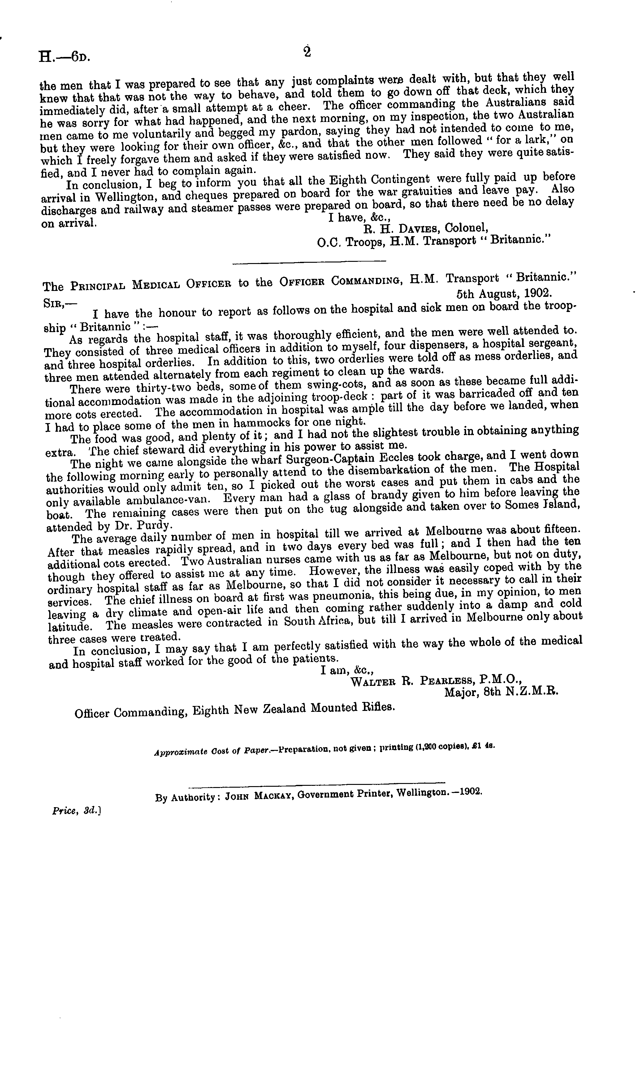 the men that I was prepared to see that any just complaints were dealt with, buti that they well but thev were looking for their own officer, fc, and that the other men followed toi a lark, on which Y freely forgave them and asked if they were satisfied now. They sa.d they were quite satisfiedd i a 'rn^Son, SgTfiS that all the Eighth Contingent, were fully paid up before arrivaHn WdHng on, and cheques prepared on board for the war gratuities and leave pay. Also discharges and railway and steamer passes were prepared on board, so that there need be no delay on arrivaL R H. Davies, Colonel, O.C. Troops, H.M. Transport " Britannic."