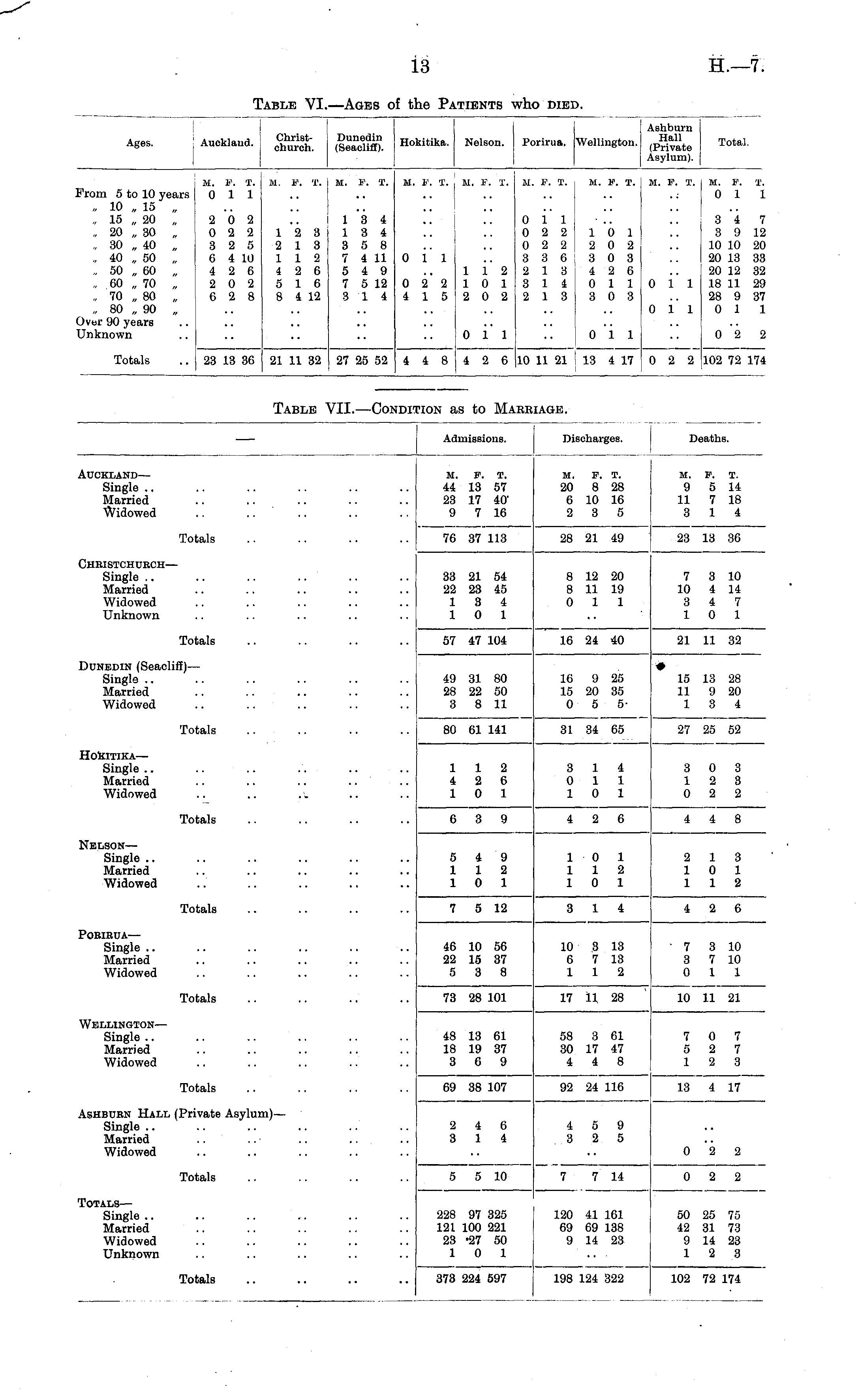 Admissions. Discharges. Deaths. Auckland— Single Married Widowed M. F. T. 44 13 57 23 17 409 7 16 M. F. T. 20 8 28 6 10 16 2 3 5 H. F. T. 9 5 14 11 7 18 3 14 Totals 76 37 113 28 21 49 23 13 36 Chbistchurch— Single Married Widowed Unknown 33 21 54 22 23 45 13 4 1 0 1 8 12 20 8 11 19 0 11 7 10 3 1 3 10 4 14 4 7 0 1 Totals 57 47 104 16 24 40 21 11 32 Dunedin (Seacliff) — Single Married Widowed 49 31 80 28 22 50 3 8 11 16 9 25 15 20 35 0 5 5- • 15 13 28 11 9 20 13 4 Totals 80 61 141 31 34 65 27 25 52 Hokitika — Single Married Widowed 1 4 1 1 2 0 2 6 1 3 0 1 1 1 0 4 1 1 3 1 0 0 2 2 3 3 2 Totals 6 3 9 4 2 6 4 4 8 Nelson — Single Married Widowed 5 1 1 4 1 0 9 2 1 1 0 1 1 1 0 1 2 1 2 1 1 1 0 1 3 1 2 Totals 7 5 12 3 1 4 4 2 6 Pobieua — Single Married Widowed 46 10 56 22 15 37 5 3 8 10 6 1 3 13 7 13 1 2 7 3 0 3 10 7 10 1 1 Totals 73 28 101 17 11 28 10 11 21 Wellington— Single Married Widowed 48 13 61 18 19 37 3 6 9 58 3 61 30 17 47 4 4 8 7 5 1 0 2 2 7 7 3 Totals 69 38 107 92 24 116 13 4 17 Ashbuen Hall (Private Asylum)— Single Married Widowed 3 3 4 1 6 4 4 3 5 2 9 5 0 2 2 Totals 5 5 10 7 14 0 2 2 Totals — Single Married Widowed Unknown 228 97 325 121 100 221 23 -27 50 10 1 120 41 161 69 69 138 9 14 23 50 25 75 42 31 73 9 14 23 12 3 Totals 373 224 597 198 124 322 102 72 174