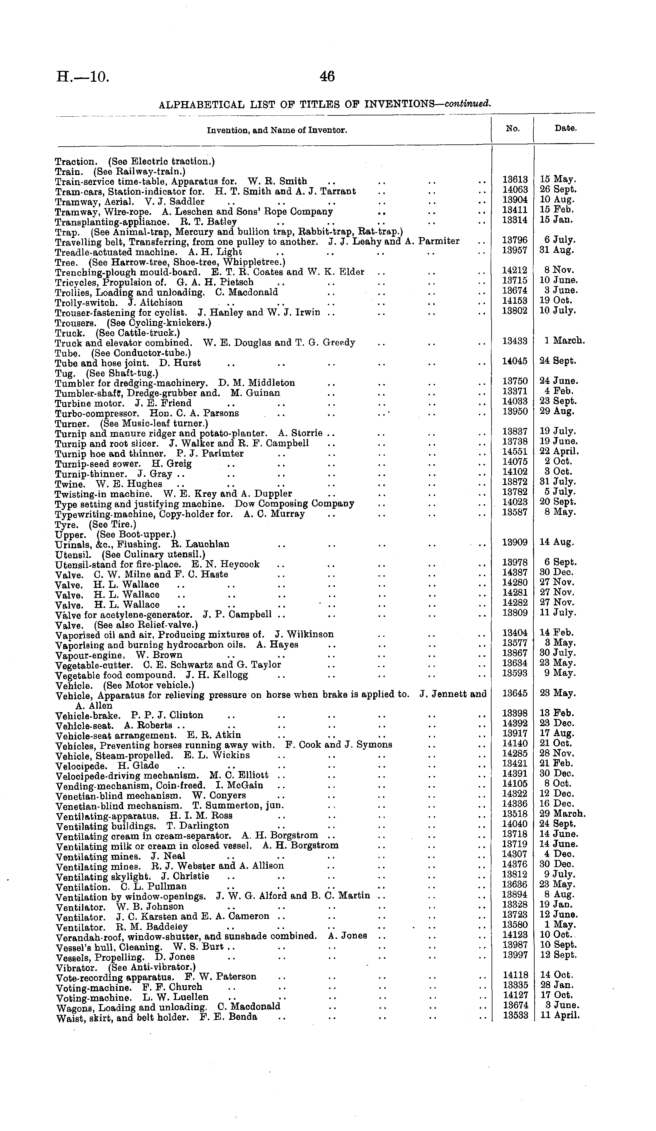 Invention, and Name of Inventor. [o, iO. Traction. (See Bleotrio traction.) Train. (See Railway-train.) Train-service time-table, Apparatus for. W. R. Smith Tram-cars, Station-indicator for. H. T. Smith and A. J. Tarrant Tramway, Aerial. V. J. Saddler Tramway, Wire-rope. A. Leschen and Sons' Rope Company Transplanting-appliance. R. T. Batley Trap. (See Animal-trap, Mercury and bullion trap, Rabbit-trap, Rat-trap.) Travelling belt, Transferring, from one pulley to another. J. J. Leahy and A. Parmiter Treadle-actuated machine. A. H. Light Tree. (See Harrow-tree, Shoe-tree, Whippletree.) Trenching-plough mould-board. E. T. R. Coates and W. K. Elder Tricycles, Propulsion of. G. A. H. Pietsch Trollies, Loading and unloading. C. Macdonald Trolly-switch. J. Aitchison .. .. .. Trouser-fastening for cyclist. J. Hanley and W. J. Irwin Trousers. (See Cycling-knickers.) Truck. (See Cattle-truck.) Truck and elevator combined. W. E. Douglas and T. G. Greedy Tube. (See Conductor-tube.) Tube and hose joint. D. Hurst Tug. (See Sbaft-tug.) Tumbler for dredging-machinery. D. M. Middleton Tumbler-shaft, Dredge-grubber and. M. Guinan Turbine motor. J. E. Friend Turbo-compressor. Hon. C. A. Parsons .. .. ..' •• Turner. (See Music-leaf turner.) Turnip and manure ridger and potato-planter. A. Storrie Turnip and root slicer. J. Walker and R. P. Campbell Turnip hoe and thinner. P. J. Parimter Turnip-seed sower. H. Greig Turnip-thinner. J. Gray Twine. W. E. Hughes Twisting-in machine. W. E. Krey and A. Duppler Type setting and justifying machine. Dow Composing Company Typewriting-maohine, Copy-holder for. A. C. Murray Tyre. (See Tire.) Upper. (See Boot-upper.) Urinals, &c, Flushing. R. Lauohlan .. .. .. .. Utensil. (See Culinary utensil.) Utensil-stand for fire-place. E. N. Heycock Valve. C. W. Milne and F. C. Haste Valve. H. L. Wallace Valve. H. L. Wallace Valve. H. L. Wallace .. .. .. ■ .. Valve for acetylene-generator. J. P. Campbell Valve. (See also Relief-valve.) Vaporised oil and air, Producing mixtures of. J. Wilkinson Vaporising and burning hydrocarbon oils. A. Hayes Vapour-engine, W. Brown Vegetable-cutter. C. E. Schwartz and G. Taylor Vegetable food compound. J. H. Kellogg Vehicle. (See Motor vehicle.) Vehicle, Apparatus for relieving pressure on horse when brake is applied to. J. Jennett and A. Allen Vehicle-brake. P. P. J. Clinton Vehicle-seat. A. Roberts Vehicle-seat arrangement. E. R. Atkin Vehicles, Preventing horses running away with. F. Cook and J. Symons Vehicle, Steam-propelled. E. L. Wickins Velocipede. H. Glade Velooipede-driving meohanism. M. C. Elliott Vending-mechanism, Coin-freed. I. McGain Venetian-blind mechanism. W. Conyers Venetian-blind mechanism. T. Summerton, jun. Ventilating-apparatus. H. I. M. Ross Ventilating buildings. T. Darlington Ventilating cream in croam-separator. A. H. Borgstrom .. .. ... Ventilating milk or cream in closed vessel. A. H. Borgstrom Ventilating mines. J. Neal Ventilating mines. R. J. Webster and A. Allison Ventilating skylight. J. Christie Ventilation. C. L. Pullman Ventilation by window-openings. J. W. G. Alford and B. C. Martin Ventilator. W. B. Johnson Ventilator. J. C. Karsten and E. A. Cameron Ventilator. R. M. Baddeley .. .. .. . ■ ... Verandah-roof, window-shutter, and sunshade combined. A.Jones .. Vessel's hull, Cleaning. W. S. Burt Vessels, Propelling. D. Jones Vibrator. (See Anti-vibrator.) Vote-recording apparatus. F. W. Paterson Voting-machine. F. F. Church Voting-maohine. L. W. Luellen Wagons, Loading and unloading. 0. Maodonald Waist, skirt, and belt holder. F. E. Benda 13613 14063 13904 13411 13314 13796 13957 14212 13715 13674 14153 13802 13433 14045 13750 13371 14033 13950 13837 13738 14551 14075 14102 13872 13782 14023 13587 13909 13978 14387 14280 14281 14282 13809 15 May. 26 Sept. 10 Aug. 15 Feb. 15 Jan. 6 July. 31 Aug. 8 Nov. 10 June. 3 June. 19 Oot. 10 July. 1 March, 24 Sept. 24 June. 4 Feb. 23 Sept. 29 Aug. 19 July. 19 June. 22 April. 2 Oct. 3 Oct. 31 July. 5 July. 20 Sept. 8 May. 14 Aug. 6 Sept. 30 Dec. 27 Nov. 27 Nov. 27 Nov. 11 July. 13404 13577 13867 13634 13593 14 Feb. 3 May. 30 July. 23 May. 9 May. 13645 23 May. 13398 14392 13917 14140 14285 13421 14391 14105 14322 14336 13518 14040 13718 13719 14307 14376 13812 13636 13894 13328 13723 13580 14123 13987 13997 13 Feb. 23 Dec. 17 Aug. 21 Oot. 28 Nov. 21 Feb. 30 Dec. 8 Oct. 12 Dec. 1G Dec. 29 Maroh 24 Sept. 14 June. 14 June. 4 Deo. 30 Dec. 9 July. 23 May. 8 Aug. 19 Jan. 12 June. 1 May. 10 Oot. 10 Sept. 12 Sept. 14118 13335 14127 13674 13533 14 Oct. 28 Jan. 17 Oct. 3 June. 11 April.