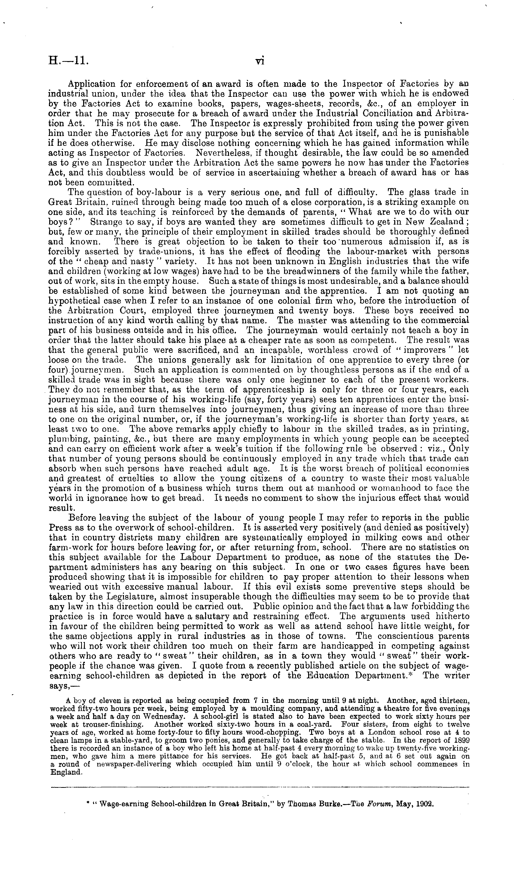 Application for enforcement of an award is often made to the Inspector of Factories by an industrial union, under the idea that the Inspector can use the power with which he is endowed by the Factories Act to examine books, papers, wages-sheets, records, &c, of an employer in order that he may prosecute for a breach of award under the Industrial Conciliation and Arbitration Act. This is not the case. The Inspector is expressly prohibited from using the power given him under the Factories Act for any purpose but the service of that Act itself, and he is punishable if he does otherwise. He may disclose nothing concerning which he has gained information while acting as Inspector of Factories. Nevertheless, if thought desirable, the law could be so amended as to give an Inspector under the Arbitration Act the same powers he now has under the Factories Act, and this doubtless would be of service in ascertaining whether a breach of award has or has not been committed. The question of boy-labour is a very serious one, and full of difficulty. The glass trade in Great Britain, ruined through being made too much of a close corporation, is a striking example on one side, and its teaching is reinforced by the demands of parents, " What are we to do with our boys? " Strange to say, if boys are wanted they are sometimes difficult to get in New Zealand ; but, few or many, the principle of their employment in skilled trades should be thoroughly defined and known. There is great objection to be taken to their too numerous admission if, as is forcibly asserted by trade-unions, it has the effect of flooding the labour-market with persons of the " cheap and nasty " variety. It has not been unknown in English industries that the wife and children (working at low wages) have had to be the breadwinners of the family while the father, out of work, sits in the empty house. Such a state of things is most undesirable, and a balance should be established of some kind between the journeyman and the apprentice. I am not quoting an hypothetical case when I refer to an instance of one colonial firm who, before the introduction of the Arbitration Court, employed three journeymen and twenty boys. These boys received no instruction of any kind worth calling by that name. The master was attending to the commercial part of his business outside and in his office. The journeyman would certainly not teach a boy in order that the latter should take his place at a cheaper rate as soon as competent. The result was that the general public were sacrificed, and an incapable, worthless crowd of " improvers " let loose on the trade. The unions generally ask for limitation of one apprentice to every three (or four) journeymen. Such an application is commented on by thoughtless persons as if the end of a skilled trade was in sight because there was only one beginner to each of the present workers. They do not remember that, as the term of apprenticeship is only for three or four years, each journeyman in the course of his working-life (say, forty years) sees ten apprentices enter the business at his side, and turn themselves into journeymen, thus giving an increase of more than three to one on the original number, or, if the journeyman's working-life is shorter than forty years, at least two to one. The above remarks apply chiefly to labour in the skilled trades, as in printing, plumbing, painting, &c, but there are many employments in which young people can be accepted and can carry on efficient work after a week's tuition if the following rule be observed : viz., Only that number of young persons should be continuously employed in any trade which that trade can absorb when such persons have reached adult age. It is the worst breach of political economies and greatest of cruelties to allow the young citizens of a country to waste their most valuable years in the promotion of a business which turns them out at manhood or womanhood to face the world in ignorance how to get bread. It needs no comment to show the injurious effect that would result. Before leaving the subject of the labour of young people I may refer to reports in the public Press as to the overwork of school-children. It is asserted very positively (and denied as positively) that in country districts many children are systematically employed in milking cows and other farm-work for hours before leaving for, or after returning from, school. There are no statistics on this subject available for the Labour Department to produce, as none of the statutes the Department administers has any bearing on this subject. In one or two cases figures have been produced showing that it is impossible for children to pay proper attention to their lessons when wearied out with excessive manual labour. If this evil exists some preventive steps should be taken by the Legislature, almost insuperable though the difficulties may seem to be to provide that any law in this direction could be carried out. Public opinion and the fact that a law forbidding the practice is in force would have a salutary and restraining effect. The arguments used hitherto in favour of the children being permitted to work as well as attend school have little weight, for the same objections apply in rural industries as in those of towns. The conscientious parents who will not work their children too much on their farm are handicapped in competing against others who are ready to " sweat" their children, as in a town they would " sweat" their workpeople if the chance was given. I quote from a recently published article on the subject of wageearning school-children as depicted in the report of the Education Department.' 1 ' The writer says,— A boy of eleven is reported as being occupied from 7 in the morning until 9at night. Another, aged thirteen, worked fifty-two hours per week, being employed by a moulding company, and attending a theatre for five evenings a week and half a day on Wednesday. A school-girl is stated also 