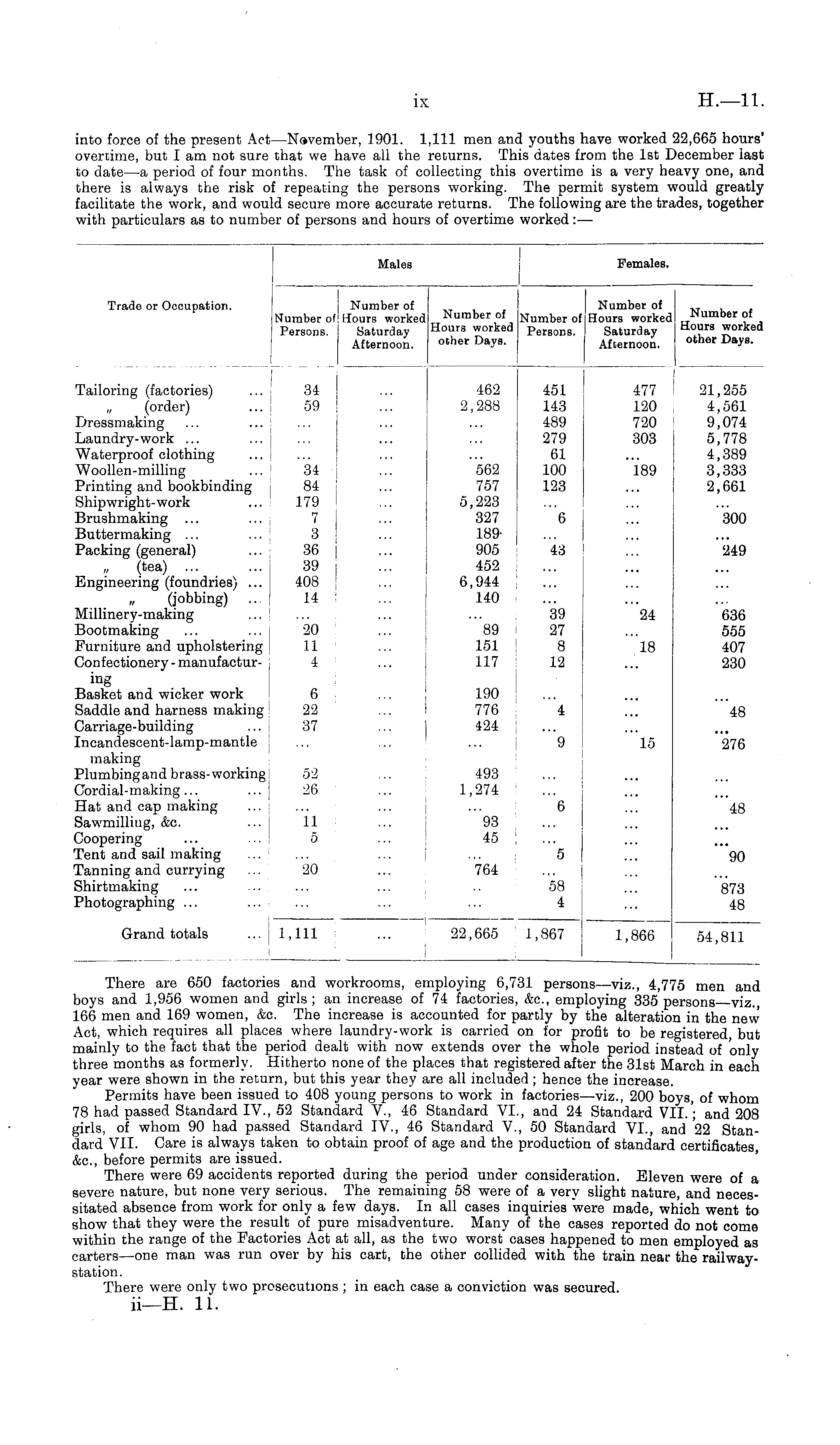 into force of the present Act—Navember, 1901. 1,111 men and youths have worked 22,665 hours' overtime, but lam not sure that we have all the returns. This dates from the Ist December last to date —a period of four months. The task of collecting this overtime is a very heavy one, and there is always the risk of repeating the persons working. The permit system would greatly facilitate the work, and would secure more accurate returns. The following are the trades, together with particulars as to number of persons and hours of overtime worked: —