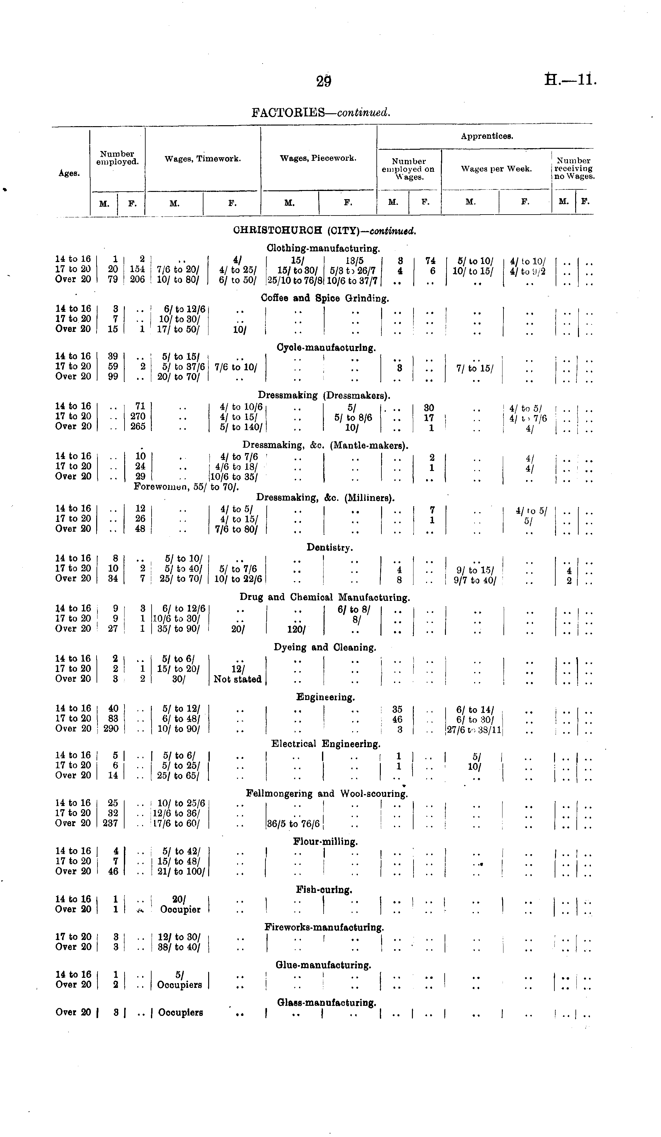 Apprentices. Number employed. Wages, Timework. Wages, Piecework. Wages per Week. Number j receiving I no Wages. Ages. Number employed on Wages. M. P. U. P. M. P. M. P. M. P. M. F. CHRISTCHURCH (GlTY)-continued. Clothing-manufacturing. 14 to 16 1 I 2 ] .. 4/ 15/1 13/5 13 74 5/ to 10/ 4/ to 10/ I .. I .. 17 to 20 30 I 151 : 7/6 to 20/ 4/to 25/ 15/ to 30/ I 5/3 t > 26/7 4 6 10/to 15/ 4/ to 9'2 Over 20 79 ! 206 ' 10/ to 80/ 6/to 50/ 25/10 to 76/8110/6 to 37/7 .. .. .. .. .. Coffee and Spice Grinding. 14 to 16 3 .. 6/ to 12/6 I .. .. I ".. I .. I I | 17 to 20 7 .. ! 10/to 30/ .. .. .. . Over 20 15 1 17/ to 50/ 10/ | Cyole-manufaoturing. 14 to 16 39 .. 5/ to 15/ t .. I .. .. .. .. , 17 to 20 59 2 5/ to 37/6 j 7/6 to 10/ .. .. 3 .. 7/ to 15/ Over 20 99 .. | 20/ to 70/ I .. .. .. . | I " Dressmaking (Dressmakers). 14 to 16 .. 71 .. 14/ to 10/6 .. 5/ ... 30 .. 4/ to 5/ ' .. I .. 17 to 20 . 270 .. 4/ to 15/ .. 5/ to 8/6 .. 17 .. I 4/ t. 7/6 .. ; .. Over 20 .. 265 .. | 5 to 140/ .. 10/ .. 1 4/ Dressmaking, &c. (Mantle-makers). 14 to 16 .. 10 .. 1 4/ to 7/6 .. .. I .. 2 .. t 4/ i 17 to 20 .. 24 .. 4/6 to 18/ .. .. .. 1 . 4/ j Over 20 29 '10/6 to 35/ .. .. I .. .. .. .. \ I. ll Forewomen, 55/ to 70/. Dressmaking, &c. (Milliners). 14 to 16 .. 12 .. 4/ to 5/ .. I .. I .. I 7 | .. 4/ to 5/ 17 to 20 .. 26 .. 4/to 15/ .. .. .. 1 j 5/ Over 20 .. 48 .. 7/6 to 80/ Dentistry. 14 to 16 8 .. 5/to 10/ .. ] .. .. .. I I I 17 to 20 10 2 I 5/to 40/ 5/to 7/6 .. .. 4 .. 9/to 15/ I "i \" Over 20 34 7 25/ to 70/ 10/ to 22/6 .. .. 8 .. | 9/7 to 40/ ' 2 Drug and Chemical Manufacturing. 14 to 16 9 | 3 6/ to 12/6 .. .. 6/ to 8/ .... .. i 17 to 20 9 1 10/6 to 30/ .. .. 8/ Over 20 27 | 1 35/to 90/ 20/ 120/ .. .. .. Dyeing and Cleaning. 14 to 16 2 I .. 5/ to 6/ .. .. I .. j .. | .. .. I I 17 to 20 2 1 15/ to 20/ 12/ .. .. Over 20 3 2 30/ Not stated .. .. | .. .. .. .. .. | .. Engineering. 14 to 16 40 5/ to 12/ .. .. | .. 35 | .. 6/ to 14/ .. I .. .. 17 to 20 | 83 .. 6/ to 48/ .. .. .. 46 .. 6/ to 30/ I Over 20 290 .. 10/ to 90/ .. .. .. 8 | .. 27/6 to 38/11 Electrical Engineering. 14 to 16 I 5 | .. | 5/ to 6/ | .. | .. | .. | 1 1 .. I 5/ | .. I .. I .. 17 to 20 | 6 I .. | 5/ to 25/ I .. .. I .. 111.. 10/ I Over 20 | 14 I .. I 25/ to 65/ | .. .. .. | .. ! .. .. . | Fellmongering and Wool-scouring. 14 to 16 25 ... 10/ to 25/6 .. .. I .. I .. I .. i .. I 17 to 20 32 .. 12/6 to 36/ .. .. .. .... Over 20 237 .. 17/6 to 60/ .. 36/5 to 76/6 Flour-milling. 14 to 16 | 4 .. 5/ to 42/ .. I .. I .. i .. .. I .. j .. | i 17 to 20 | 7 .. I 15/ to 48/ .. I .. .. .. I .. ... | .. t Over 20 ■ 46 .. I 21/ to 100/ | .. I [ .. | .. | Fish-curing. 14 to 16 I 1 I .. : 20/ .. i .. .. | .. j .. I .. | .. | .. | .. Over 20 I 1 I .. Oocupier I .. .. .. .. .. .. | .. | .. Fireworks-manufacturing. 17 to 20 [ 3 I .. I 12/ to 30/ | .. I .. | .. I .. .. I .. .. [ .. I Over 20 | 3 I ..[ 38/ to 40/ j .. .. .. | .. " .. | .. .. .. | .. Glue-manufacturing. 14 to 16 I 11 .. I 5/ .. \ .. .. I .... | .. .. I .. | .. Over 20 I 2 | .. [ Oocupiers I .. .. .. .. ,. I .. .. | .. I ... Glass-manufacturing. Over 20 | 3 | .. | Ocoupiers .. | .. | .. | .. | .. | .. | .. | .. | ..