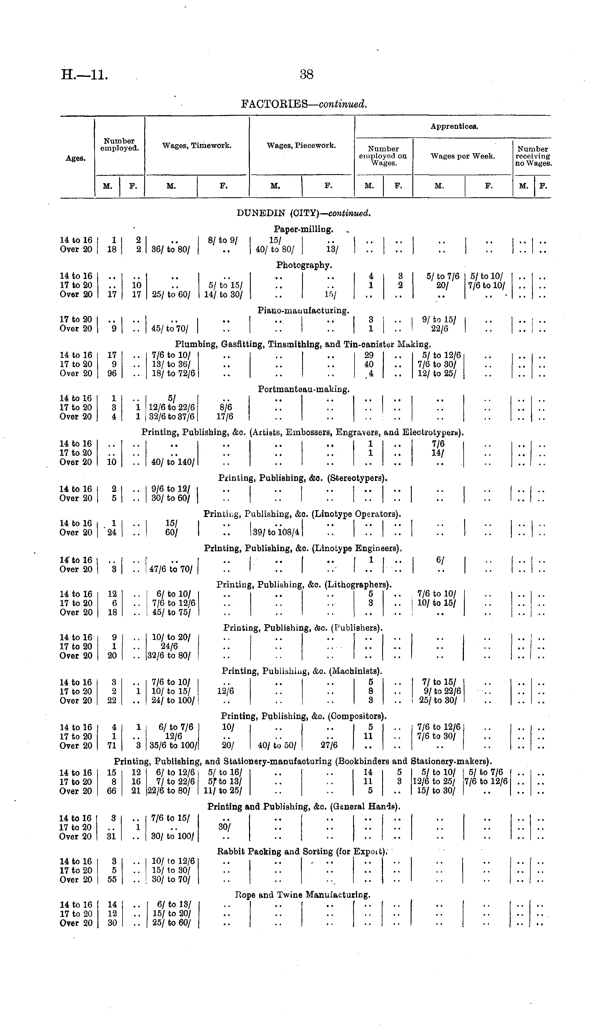 Apprentices. Number employed. Wages, Timework. Wages, Piecework. Ages. Number employed on Wages. Wages per Week. Number receiving no Wages. M. F. II. F. M. F. M. F. M. F. M. P. DUNEDIN (CITY)— continued. Paper-milling. 14 to 16 I 1 | 2 1 .. | 8/ to 9/ | 15/ I .. I .. I .. I .. I .. I .. I .. Over 20 | 18 | 2 I 36/ to 80/ | .. | 40/ to 80/ | 13/ I .. | .. | .. | .. I .. I .. Photography. 14 to 16 .. .. .. .. ... .. 4 3 5/to 7/6 5/to 10/ .. .. 17 to 20 .. 10 .. 5/ to 15/ .. .. 1 2 20/ 7/6 to 10/ .. Over 20 17 17 25/ to 60/ 14/ to 30/ .. 15/ .. .. .. ....... Piano-manufacturing. 17 to 20 I .. I .. I .. I .. I .. I .. I 3 | .. I 9/ to 15/ I .. | .. I .. Over 20 | 9 | .. I 45/ to 70/ | .. .. I .. 1 | .. I 22/6 I .. | .. I .. Plumbing, Gasfitting, Tinsmithing, and Tin-oanister Making. 14 to 16 17 .. 7/6 to 10/ .. .. .. 29 .. 5/ to 12/6 17 to 20 9 .. 13/ to 36/ .. .. .. 40 .. 7/0 to 30/ Over 20 96 .. 18/ to 72/6 .. .. .. 4 .. 12/ to 25/ Portmanteau-making. 14 to 16 1 I .. 5/ I .. .. .. .. I .. .. I 17 to 20 3 1 12/6 to 22/6 8/6 .. .. .. | .. .. Over 20 4 | 1 32/6 to 37/61 17/6 .. .. .. .. .. Printing, Publishing, &o. (Artists, Embossers, Engravers, and Electrotypers). 14 to 16 .... .. .. .. I .. 1 I .. 7/6 .. .. | .. 17 to 20 .. .. .. .. 1 .. 14/ .. Over 20 10 .. 40/ to 140/ .. .. I .. .. I .. .. .. .. I .. Printing, Publishing, &o. (Stereotypers). 14 to 16 I 2 | .. | 9/6 to 12/ | .. I .. I .. I .... I .. I .. I .. I .. Over 20 | 5 | .. | 30/ to 60/ I .. .. I .. | .. | .. | .. .. I .. | .. Printing, Publishing, &o. (Linotype Operators). 14 to 16 t 11 .. I 15/ I .. I .. .. | .. I .. I .. I .. I .. I .. Over 20 j 24 I .. | 60/ I .. 139/ to 108/41 .. | ..'[.. | .. I .. | .. | .. Printing, Publishing, &c. (Linotype Engineers). 14 to 16 1 .. I .. I .. I .. I .. I .. I 1 I .. I 6/ | .. I .. 1 .. Over 20 | 8 | .. 47/6 to 70/ | .. I .. I .. I .. | .. | .. | .. I .. I .. Printing, Publishing, &o. (Lithographers). 14 to 16 12 .. ! 6/ to 10/ .. .. .. 5 .. 7/6 to 10/ 17 to 20 6 .. j 7/6 to 12/6 .. .. .. 3 j 10/ to 15/ Over 20 18 .. 45/ to 75/ .. .. .. .. .. .. Printing, Publishing, He. (Publishers). 14 to 16 9 | .. | 10/ to 20/ .. .. .. .. .. .. .. .... 17 to 20 1 .. 24/6 .. .. .. .. .. .. .. .... Over 20 20 | .. |32/6 to 80/ .. .. .. .. .. .. .. .... Printing, Publishing, &o. (Machinists). 14 to 16 3 .. 7/6 to 10/ .. .. .. 5 .. I 7/ to 15/ 17 to 20 2 1 10/ to 15/ 12/6 .. .. 8 .. 9/ to 22/6 .. .. Over 20 22 .. 24/ to 100/ .. .. .. 3 .. I 25/ to 30/ .. .... Printing, Publishing, &c. (Compositors). 14 to 16 4 1 6/to 7/6 10/ .. .. 5 .. 7/6 to 12/6 17 to 20 1 .. 12/6 .. .. .. 11 7/6 to 30/ Over 20 71 3 35/6 to 100/ 20/ 40/ to 50/ 27/6 .. .. .. Printing, Publishing, and Stationery-manufaoturing (Bookbinders and Stationery-makers). 14 to 16 15 12 6/to 12/6 5/to 16/ .. .. 14 5 5/to 10/ 5/to 7/6 .. .. 17 to 20 8 16 7/to 22/6 5/to 13/ .. .. 11 3 12/6 to 25/ 7/6 to 12/6 .. .. Over 20 66 21 22/6 to 80/ 11/to 25/ .. .. 5 .. 15/to 30/ Printing and Publishing, &c. (General Hands). 14 to 16 3 .. 7/6 to 15/ .. .. .. .. I .. .. .. .. I .. 17 to 20 .. 1 .. 30/ .. .. .. j .. .. .. Over 20 31 .. 30/ to 100/ .. .. .. .. | .. .. .. .. | .. Rabbit Paoking and Sorting (for Expoit). 14 to 16 3 .. 10/ to 12/6 .. .. ... .. .. .. .. | .. .. 17 to 20 5 .. 15/ to 30/ .. .. .. .. .. .. .. .... Over 20 55 .. 30/ to 70/ .. .. .. .. .. .. .. | .. .. Hope and Twine Manufacturing. 14 to 16 14 .. 6/ to 13/ .. .. .. .. .. .. 17 to 20 12 .. 15/ to 20/ .. .. .. .. .. .. .. .... Over 20 30 .. 25/ to 60/ .. .. .. .. .. ..