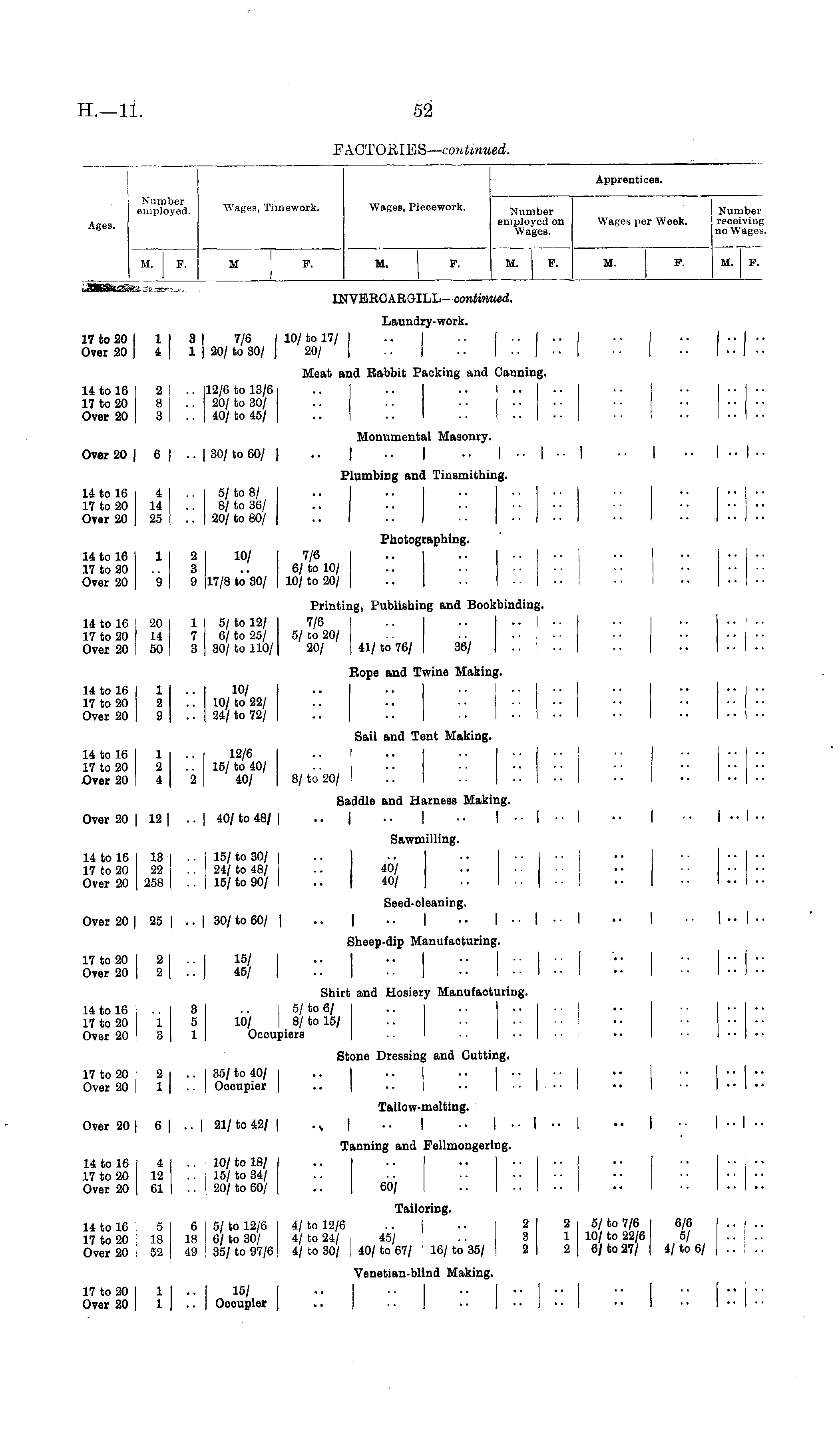 ipprenl ;ices. Number employed. Wages, Timework. Wages, Piecework. Number receiving no Wages. Ages. Number employed on Wages. per Week. M. P. F. M. F. M. P. M. P. M. F. __H__j_G~-r--t->_--INVERCARGILL- continued. Laundry-work. 17 to 20 I 1 I 3 I 7/6 I 10/ to 17/ I .. I • • I .. [ .. I .. I .. I • • | ■ ■ Over 20 I 4 I 1 | 20/ to 30/ | 20/ | .. | .. | .. | .. | .. | .. | .. | .. Meat and Rabbit Packing and Canning. 14 to 16 2 .. 12/6 to 13/6 .. .. .. • • • • ■ • 17 to 20 8 .. 20/ to 30/ .. .. • • ■ • • • • • • • .. .. Over 20 3 .. 40/ to 45/ .. .. .. ■ • ■ • Monumental Masonry. Over 20 | 6 | .. | 30/ to 60/ | .. | .. | • • I • • I ■ • I • • I • • I • • I • ■ Plumbing and Tinsrniohing. 14 to 16 4 .. 5/ to 8/ .. | .. • • • • •• 17 to 20 14 .. 8/ to 36/ .. .. . • • ■ • • • • Over 20 25 .. 20/ to 80/ .. I .. ■ • • • •• •• • • • ■ Photographing. 14 to 16 1 2 10/ 7/6 .. .. •• ■• 17 to 20 .. 3 .. 6/ to 10/ .. .. .. ■ • •• Over 20 9 9 17/8 to 30/ 10/ to 20/ .. .. • • • • • Printing, Publishing and Bookbinding. 14 to 16 20 1 5/ to 12/ 7/6 .. .. • • I • • • • 17 to 20 14 7 6/ to 25/ 5/ to 20/ .. • • • • • ■ Over 20 50 3 30/ to 110/ 20/ 41/ to 76/ 36/ .. I .. .. Rope and Twine Making. 14 to 16 1 10/ .. .. . • •■ •■ • • 17 to 20 2 .. 10/ to 22/ .. .. .• •• • • • • .... Over 20 9 .. 24/ to 72/ .. .. •. I •• • • • ■ • • .... Sail and Tent Making. 14 to 16 1 .. 12/6 .. I .. • • • • • • 17 to 20 2 .. 15/ to 40/ .. •• • • • • • • • • .... Over 20 4 3 40/ 8/ to 20/ ■ .. •. • ■ • • • • I Saddle and Harness Making. Over 30 | 12 | .. | 40/to 48/ | .. | .. | • • I •• I • ■ I • • I • • ,••!•• Sawmilling. 14 to 16 13 .. 15/ to 30/ .. • • • • • • ■ • • • ■ • .. . • 17 to 20 22 24/ to 48/ .. 40/ .. .. Over 20 258 .. 15/ to 90/ .. 40/ .. •. .. I Seed-cleaning. Over 20 | 25 | .. | 30/ to 60/ | | I I ■■ I •• I •• I I •• t •'■ Sheep-dip Manufacturing. 17 to 20 | 2 | .. | 15/ I .. ] • • I • • I • • I ■ • '• • • ■ I • ■ | • • Over 20 | 2 | .. I 45/ | .. | • • | • • !••!••! • • I • • I • • I ■ • Shirt and Hosiery Manufacturing. 14 to 16 ! .. 3 .. | 5/ to 6/ | .. .. • • • • I • • 17 to 20 1 5 10/ j 8/ to 15/ .. .. • • • ■ . • Over 20 I 3 1 Occupiers • • • • I • • .... Stone Dressing and Cutting. 17 to 20 | 2 | .. I 35/to 40/ I .. I • • •• I • • I • • •• • • I • ■ I •• Over 20 i 1 | . ■ | Occupier | .. | .. | • • I • • I • • I • • I ■ • !•■!•• Tallow-melting. Over 20 | 6 | .. | 21/to 42/ | . v | .. I •• I •• I •• I •• I •• !••!•• Tanning and Fellmongering. 14 to 16 4 1 .. 10/to 18/ I .. .. .. •• • • • • •■ | • • •• 17 to 20 12 .. | 15/ to 34/ .. . • • • • • •• •• • • • • i •• Over 20 61 I ..; 20/ to 60/ | .. 60/ I .. • • • • • • • • I • • I • • Tailoring. 14 to 16 ; 5 6 5/ to 12/6 I 4/ to 12/6 .. | .. 2 2 5/ to 7/6 6/6 .... 17 to 20 18 18 6/to 30/ ; 4/to 24/ 45/ .. 3 1 10/to 22/6 5/ .. .. Over 20 I 52 49 35/ to 97/61 4/ to 30/ ! 40/ to 67/ j 16/ to 35/ 2 2 6/ to 37/ 4/ to 6/ .. Venetian-blind Making. 17 to 20 | 11 .. | 15/ I .. • • •• - " I •" I '" " I "' I '' Over 20 | 1 | .. | Oooupier | .. ) ■ ■ | • • j • • I • • I • • I • • I • • I • •