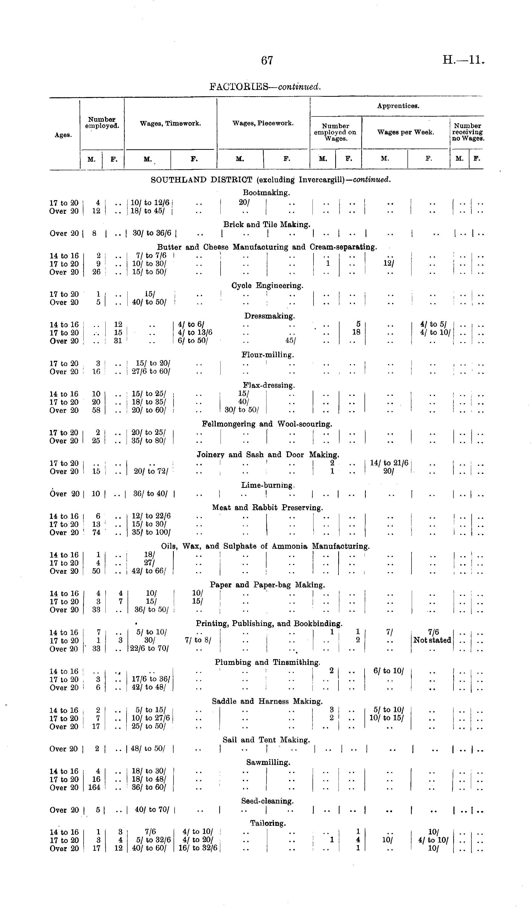 .pprent iices. Number employed. Wages, Timework. Wages, Piecework. Number employed on Wages. Number receiving no Wages. Ages. Wages per Week. M. F. M. P. tt. F. M. P. M. F. M. F. SOUTHLAND DISTRICT (excluding Invercargill)— continued. Bootmaking. 17 to 20 I 4 ! .. | 10/ to 12/61 .. | 20/ I .. .. I .. I .. I .. I .. I .. Over 20 I 12 | .. | 18/ to 45/ j .. .. .. .. I .. I .. .. | .. | .. Brick and Tile Making. Over 20 | 8 | .. | 30/ to 36/6 | .. | .. | .. | .. | .. | .. | .. I • • I • - Butter and Cheese Manufacturing and Cream-separating. 14 to 16 2 ,.. | 7/ to 7/6 l .. .. .. .. .. .. .. I .. .'. 17 to 20 9 ... 10/ to 30/ .. .. .. 1 .. 12/ .. . .. .. Over 20 26 .. i 15/ to 50/ .. .. .. .. .. .. .. I .. .. Cycle Engineering. 17 to 20 1 I .. 15/ .. .. .. | .. I .. I .. .. .. | .. Over 20 5 | .. | 40/ to 50/ .. .. .. .. I .. .. Dressmaking. 14 to 16 .. | 12 .. 4/ to 6/ .. .. .. 5 .. 4/ to 5/ .... 17 to 20 .. 15 .. 4/to 13/6 .. .. .. 18 .. 4/tol0/j .. .. Over 20 .. 31 .. 6/ to 50/ .. 45/ .. .. .. .. | .. .. Flour-milling. 17 to 20 3 .. 15/ to 20/ .. I .. .. .. .. .. Over 20 16 .. 27/6 to 60/ .. .. .. .. .. : .. Flax-dressing. 14 to 16 10 .. 15/ to 25/ : .. 15/ .. .. .. .. .. .... 17 to 20 20 .. i 18/ to 35/ i .. 40/ .. .. .. .. .. .... Over 20 58 .. 20/ to 60/ .. ! 30/ to 50/ I .. .. .. .. .. | .. Fellmongering and Wool-scouring. 17 to 20 I 2 j .. | 20/ to 25/ j .. .. .. [ .. .. I .. j .. I .. I .. Over 20 I 25 I .. | 35/ to 80/ .. I .. .. .. I .. .. I .. I .. I .. Joinery and Sash and Door Making. 17 to 20 I .. ; .. I .. .. I .. .. | 2 .. I 14/ to 21/61 .. I .. I .. Over 20 ! 15 , .. | 20/ to 72/ .. .. .. 1 .. I 20/ .. !..[.. Lime-burning, Over 20 | 10 | .. | 36/ to 40/ | .. | .. | .. | .. | .. | .. | .. | .. | .. Meat and Rabbit Preserving. 14 to 16 j 6 .. 12/ to 22/6 .. .. I .. I .. .. .. j .. I .. .. 17 to 20 13 .. 15/ to 30/ .. .. .. .. .. .. .. .. .. Over 20 74 .. 35/ to 100/ .. .. I .. .. .. .. | .. I .. .. Oils, Wax, and Sulphate of Ammonia Manufacturing. 14 to 16 1 | .. I 18/ .. .. .. .. .. .. 17 to 20 4 .. 27/ .. .. .. .. .. .. .. .. .. Over 20 50 I ..; 42/ to 66/ .. .. .. .. .. | .. .. Paper and Paper-bag Making. 14 to 16 I 4 4 10/ 10/ .. .. I .. .. .. 17 to 20 3 7 15/ 15/ .. .. | .. .. .. Over 20 | 33 .. 86/ to 50/ I .. .. .. .. .. .. • Printing, Publishing, and Bookbinding. 14 to 16 I 7 .. 5/ to 10/ .. j .. .. 1 1 I 7/ 7/6 .... 17 to 20 1 3 30/ 7/ to 8/ i .. .. .. 2 .. Not stated .. Over 20 I' 33 .. 22/6 to 70/ .. .. .. .... .. Plumbing and Tinsmithing. 14 to 16 .. ., .. .. .. 2 1.. 6/ to 10/ I 17 to 20 3 .. i 17/6 to 36/ .. .. .. .... .. Over 20 6 .. 42/ to 48/ .. .. .. .. | .. .. .. .... Saddle and Harness Making. 14 to 16 2 .. 5/ to 15/ I .. . I .. .. | 3 , .. 5/ to 10/ 17 to 20 7 .. 10/ to 27/6! .. .. .. 2 ] .. 10/ to 15/ Over 20 17 .. 25/ to 50/ .. .. .. .. | .. .. Sail and Tent Making. Over 20 | 2 | .. | 48/ to 50/ | .. | .. | .. | .. | .. | .. | .. | .. | .. Sawmilling. 14 to 16 4 1 .. I 18/ to 30/ .. .. .. .. I .. .. .. | .. .. 17 to 20 16 ..! 18/ to 48/ .. .. .. . - .. .. .. .... Over 20 164 !.. 86/ to 60/ .. .. .. .. I .. .. .. | .. .. Seed-cleaning. Over 20 | 5| ..| 40/to 70/ | .. | .. | .. | .. | .. | .. | .. |..|.. Tailoring. 14 to 16 | 1 3 | 7/6 | 4/ to 10/ .. .. .. I 1 .. | 10/ .... 17 to 20 | 3 4 | 5/ to 32/61 4/ to 20/ .. .. 1 | 4 10/ 4/ to 10/ .... Over 20 ! 17 12 | 40/ to 60/ j 16/ to 32/6 .. .. .. 1 .. ! 10/ ....