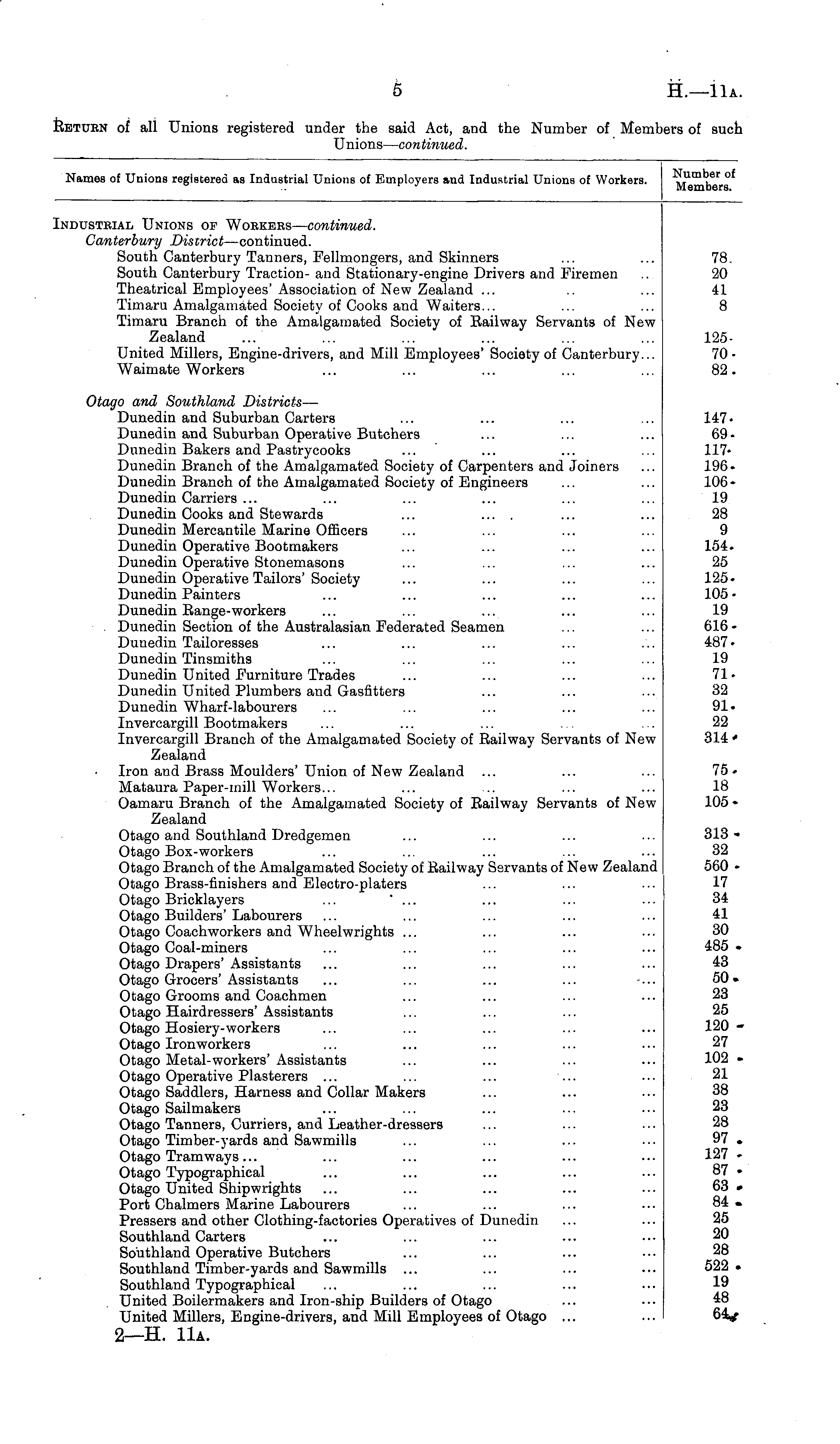 Names of Unions registered as Industrial Unions of Employers and Industrial Unions of Workers. Number of Members. .ndustrial Unions of Workers— continued. Canterbury District —continued. South Canterbury Tanners, Fellmongers, and Skinners South Canterbury Traction- and Stationary-engine Drivers and Firemen Theatrical Employees' Association of New Zealand ... Timaru Amalgamated Society of Cooks and Waiters... Timaru Branch of the Amalgamated Society of Railway Servants of New Zealand United Millers, Engine-drivers, and Mill Employees' Society of Canterbury... Waimate Workers 78. 20 41 8 7082. Otago and Southland Districts — Dunedin and Suburban Carters Dunedin and Suburban Operative Butchers Dunedin Bakers and Pastrycooks Dunedin Branch of the Amalgamated Society of Carpenters and Joiners Dunedin Branch of the Amalgamated Society of Engineers Dunedin Carriers ... Dunedin Cooks and Stewards ... .... Dunedin Mercantile Marine Officers Dunedin Operative Bootmakers Dunedin Operative Stonemasons Dunedin Operative Tailors' Society Dunedin Painters Dunedin Range-workers Dunedin Section of the Australasian Federated Seamen Dunedin Tailoresses Dunedin Tinsmiths Dunedin United Furniture Trades Dunedin United Plumbers and Gasfitters Dunedin Wharf-labourers Invercargill Bootmakers Invercargill Branch of the Amalgamated Society of Railway Servants of New Zealand Iron and Brass Moulders' Union of New Zealand Mataura Paper-mill Workers... Oamaru Branch of the Amalgamated Society of Railway Servants of New Zealand Otago and Southland Dredgemen Otago Box-workers Otago Branch of the Amalgamated Society of Railway Servants of New Zealand Otago Brass-finishers and Electro-platers Otago Bricklayers ... "... Otago Builders' Labourers Otago Coachworkers and Wheelwrights ... Otago Coal-miners Otago Drapers' Assistants Otago Grocers' Assistants Otago Grooms and Coachmen Otago Hairdressers'Assistants Otago Hosiery-workers Otago Ironworkers Otago Metal-workers' Assistants Otago Operative Plasterers ... Otago Saddlers, Harness and Collar Makers Otago Sailmakers Otago Tanners, Curriers, and Leather-dressers Otago Timber-yards and Sawmills Otago Tramways ... Otago Typographical Otago United Shipwrights Port Chalmers Marine Labourers Pressers and other Clothing-factories Operatives of Dunedin Southland Carters Southland Operative Butchers Southland Timber-yards and Sawmills Southland Typographical United Boilermakers and Iron-ship Builders of Otago United Millers, Engine-drivers, and Mill Employees of Otago ... 147. 117196. 10619 28 9 154. 25 125. 10519 616487. 19 7132 91. 22 314' 75. 18 31332 560 - 17 34 41 30 485 . 43 50. 23 25 120 - 27 102 - 21 38 23 28 97 . 127 - 87 • 63 - 84 . 25 20 28 522 . 19 48 64