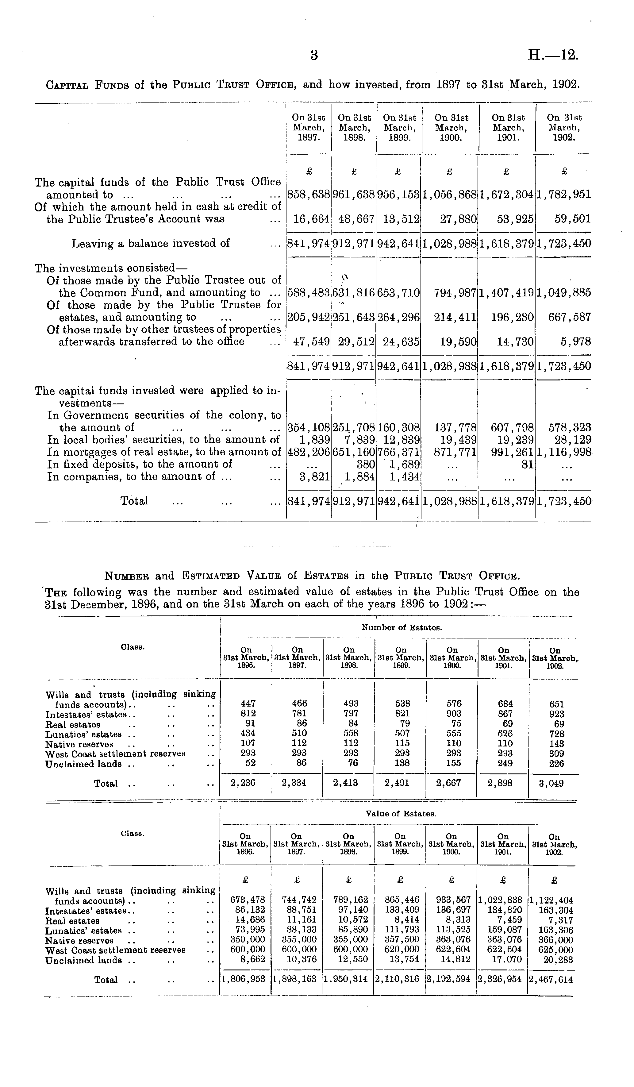 Nui mber of Esta ,08. Class. On On 31st March, 31st March, 1896. 1897. On 31st March, 1898. On 31st March, 1899. On 31st March, 1900. On 31st March, 1901. On 31st March, 1902. Wills and trusts (including sinking funds accounts).. Intestates' estates.. Real estates Lunatics' estates Native reserves West Coast settlement reserves Unclaimed lands 447 466 812 781 91 86 434 510 107 112 293 293 52 86 493 797 84 558 112 293 76 538 821 79 507 115 293 138 576 903 75 555 110 293 155 684 867 69 626 110 293 249 651 923 69 728 143 309 226 Total .. 2,236 2,334 2,413 2,491 2,667 2,898 3,049 hif! of Estaa ;es. Class. On 31st March, 1896. On 31st March, 1897. On 31st March, 1898. On 31st March, 1899. On 31st March, 1900. On 31st March, 1901. On 31st March, 1902. £ £ £ £ £ £ £ Wills and trusts (including sinking funds accounts) Intestates'estates.. Real estates Lunatics' estates Native reserves West Coast settlement reserves Unclaimed lands 673,478 86,132 14,686 73,995 350,000 600,000 8,662 744,742 88,751 11,161 88,133 355,000 600,000 10,376 789,162 97,140 10,572 85,890 355,000 600,000 12,550 865,446 133,409 8,414 111,793 357,500 620,000 13,754 933,567 136,697 8,313 113,525 363,076 622,604 14,812 1,022,838 134,820 7,459 159,087 363,076 622,604 17.070 1,122,404 163,304 7,317 163,306 366,000 625,000 20,283 2,467,614 Total .. 1,806,953 1,898,163 1,950,314 2,110,316 2,192,594 2,326,954