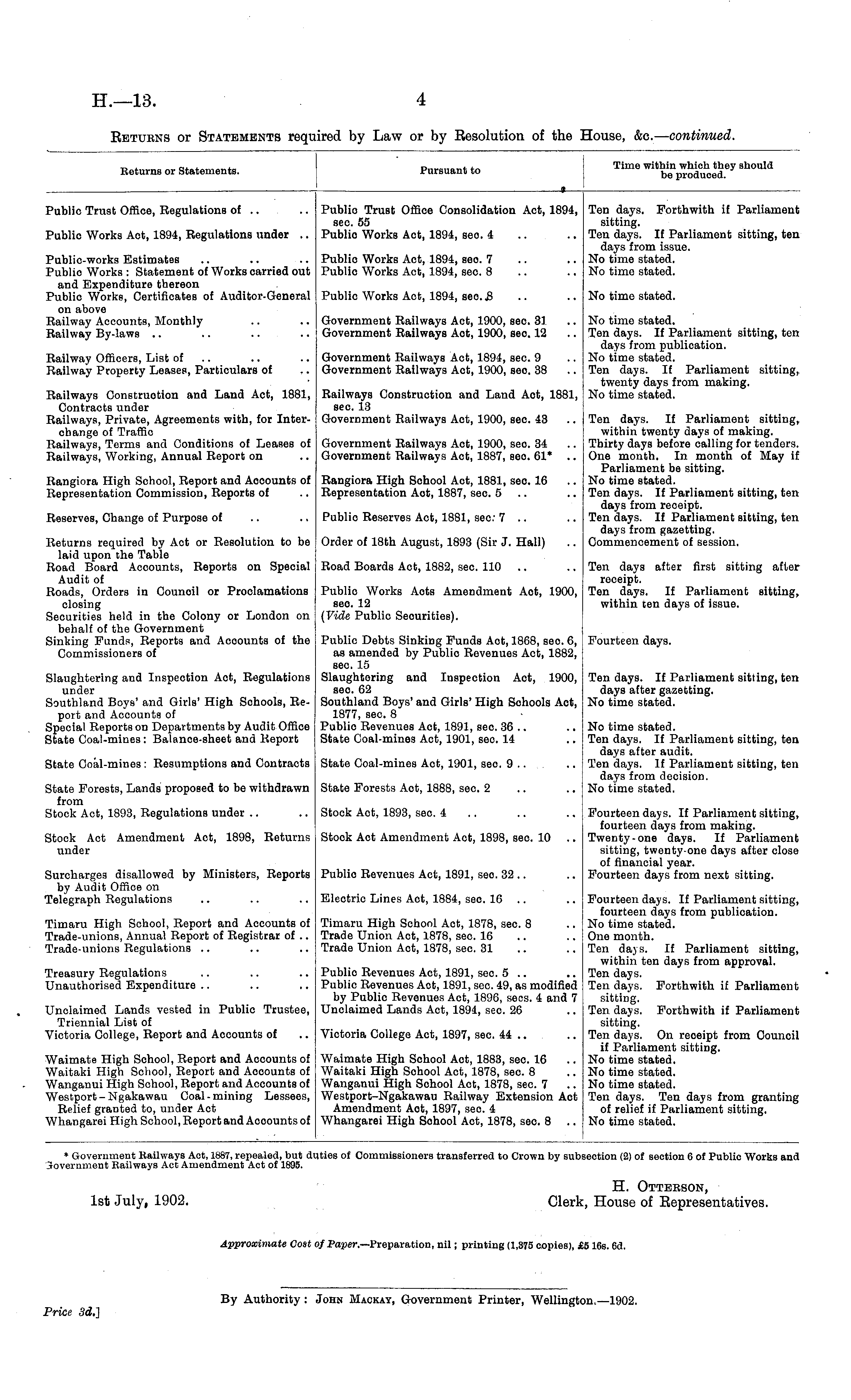 Returns or Statements. Pursuant to Time within which they should be produced. Public Trust Office, Regulations of .. Publio Trust Office Consolidation Act, 1894, sec. 55 Publio Works Aot, 1894, sec. 4 Ten days. Forthwith if Parliament sitting. Ten days. If Parliament sitting, ten days from issue. No time stated. No time stated. Public Works Act, 1894, Regulations under .. Public-works Estimates Publio Works : Statement of Works carried out and Expenditure thereon Public Works, Certificates of Auditor-General on above Railway Accounts, Monthly Railway By-laws Public Works Aot, 1894, seo. 7 Publio Works Act, 1894, sec. 8 Public Works Aot, 1894, sec. 3 No time stated. Government Railways Act, 1900, sec. 31 Government Railways Aot, 1900, seo. 12 No time stated. Ten days. If Parliament sitting, ten days from publication. No time stated. Ten days. If Parliament sitting, twenty days from making. No time stated. Railway Officers, List of Railway Property Leases, Particulars of Government Railways Act, 1894, sec. 9 Government Railways Aot, 1900, seo. 38 Railways Construction and Land Act, 1881, Contracts under Railways, Private, Agreements with, for Interchange of Traffic Railways, Terms and Conditions of Leases of Railways, Working, Annual Report on Railways Construction and Land Aot, 1881, seo. 13 Government Railways Aot, 1900, seo. 43 Ten days. If Parliament sitting, within twenty days of making. Thirty days before calling for tenders. One month. In month of May if Parliament be sitting. No time stated. Ten days. If Parliament sitting, ten days from receipt. Ten days. If Parliament sitting, ten days from gazetting. Commencement of session. Government Railways Aot, 1900, seo. 34 Government Railways Act, 1887, sec. 61* .. Rangiora High School, Report and Accounts of Representation Commission, Reports of Rangiora High School Act, 1881, seo. 16 Representation Act, 1887, sec. 5 .. Reserves, Change of Purpose of Public Reserves Act, 1881, sec 7 .. Returns required by Act or Resolution to be laid upon the Table Road Board Accounts, Reports on Special Audit of Roads, Orders in Council or Proclamations closing Securities held in the Colony or London on behalf of the Government Sinking Funds, Reports and Accounts of the Commissioners of Order of 18th August, 1893 (Sir J. Hall) Road Boards Act, 1882, sec. 110 .. Public Works Aots Amendment Aot, 1900, seo. 12 (Vide Public Securities). Ten days after first sitting after receipt. Ten days. If Parliament sitting, within ten days of issue. Public Debts Sinking Funds Aot, 1868, seo. 6, as amended by Public Revenues Act, 1882, sec. 15 Slaughtering and Inspection Aot, 1900, seo. 62 Southland Boys' and Girls' High Schools Aot, 1877, sec. 8 Public Revenues Act, 1891, seo. 36 .. State Coal-mines Act, 1901, seo. 14 Fourteen days. Slaughtering and Inspection Act, Regulations under Southland Boys' and Girls' High Schools, Report and Accounts of Special Reports on Departments by Audit Office State Coal-mines: Balance-sheet and Report Ten days. If Parliament sitting, ten days after gazetting. No time stated. State Coal-mines : Resumptions and Contracts State Coal-mines Act, 1901, seo. 9 .. No time stated. Ten days. If Parliament sitting, ten days after audit. Ten days. If Parliament sitting, ten days from decision. No time stated. State Forests, Lands proposed to be withdrawn from Stock Act, 1893, Regulations under State Forests Aot, 1888, seo. 2 Stock Act, 1893, sec. 4 .. Fourteen days. If Parliament sitting, fourteen days from making. Twenty-one days. If Parliament sitting, twenty-one days after close of financial year. Fourteen days from next sitting. Stock Act Amendment Act, 1898, Returns under Stock Act Amendment Act, 1898, seo. 10 Surcharges disallowed by Ministers, Reports by Audit Office on Telegraph Regulations Publio Revenues Act, 1891, seo. 32 .. Timaru High School, Report and Accounts of Trade-unions, Annual Report of Registrar of .. Trade-unions Regulations Treasury Regulations Unauthorised Expenditure Unclaimed Lands vested in Public Trustee, Triennial List of Victoria College, Report and Accounts of Electric Lines Act, 1884, seo. 16 .. Timaru High School Act, 1878, sec. 8 Trade Union Act, 1878, sec. 16 Trade Union Act, 1878, sec. 31 Public Revenues Aot, 1891, sec. 5 .. Public Revenues Act, 1891, sec. 49, as modified by Public Revenues Act, 1896, sees. 4 and 7 Unclaimed Lands Act, 1894, sec. 26 Fourteen days. If Parliament sitting, fourteen days from publication. No time stated. One month. Ten days. If Parliament sitting, within ten days from approval. Ten days. Ten days. Forthwith if Parliament sitting. Ten days. Forthwith if Parliament sitting. Ten days. On receipt from Counoil if Parliament sitting. No time stated. No time stated. No time stated. Ten days. Ten days from granting of relief if Parliament sitting. No time stated. Victoria College Act, 1897, sec. 44 .. Waimate High School, Report and Accounts of Waitaki High School, Report and Accounts of Wanganui High School, Report and Accounts of Westport -Ngakawau Coal-mining Lessees, Relief granted to, under Act Whangarei High School, Report and Acoounts of Waimate High School Act, 1883, sec. 16 Waitaki High School Act, 1878, sec. 8 Wanganui High School Aot, 1878, sec. 7 Westport-Ngakawau Railway Extension Act Amendment Aot, 1897, see. 4 Whangarei High Sohool Act, 1878, sec. 8 ..