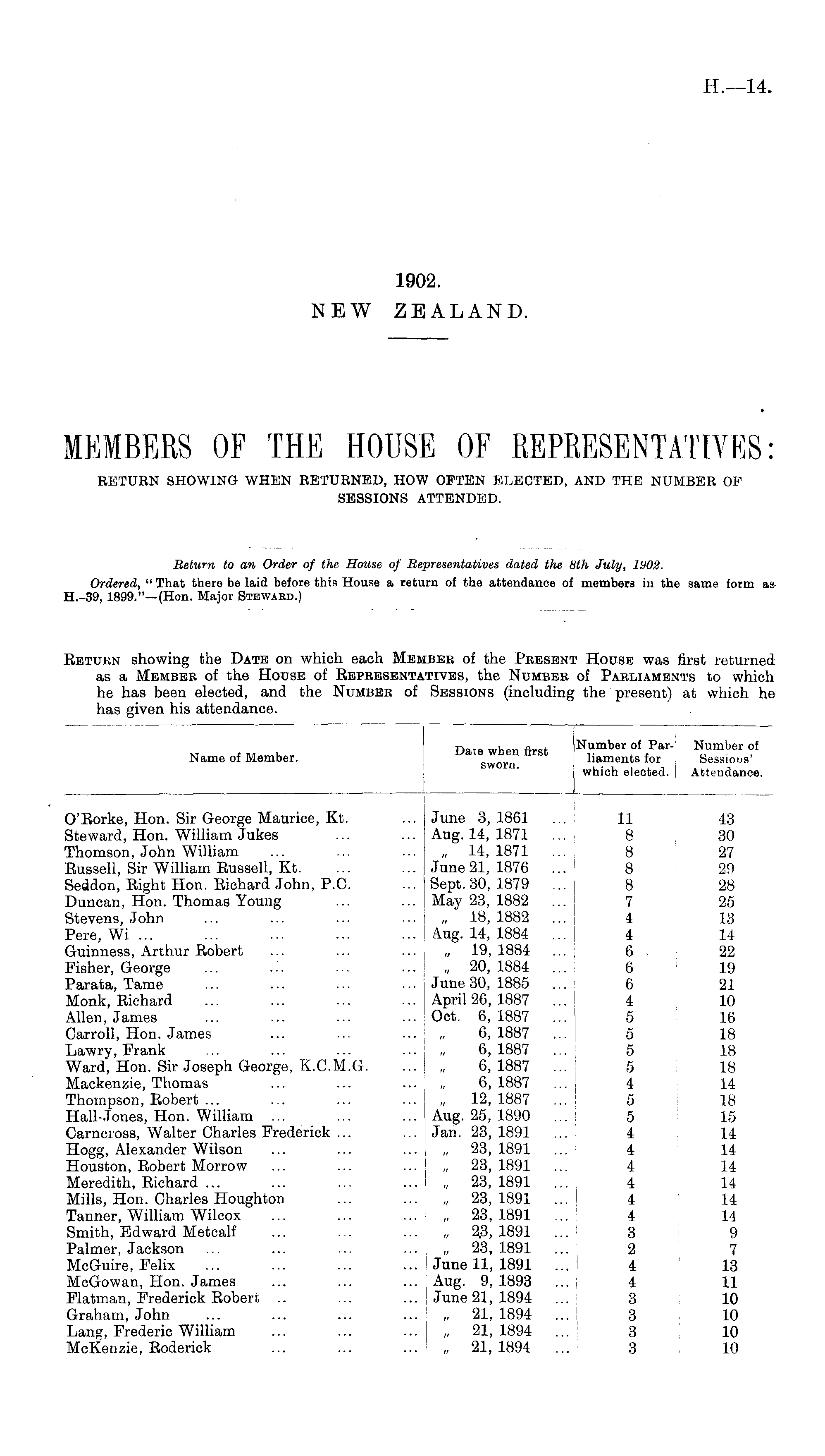 Name of Member. Dale when first sworn. Number of Par- Number of liaments for Sessions' which elected. Attendance. O'Eorke, Hon. Sir George Maurice, Kt. Steward, Hon. "William Jukes Thomson, John William Eussell, Sir William Eussell, Kt. Seddon, Eight Hon. Eichard John, P.O. Duncan, Hon. Thomas Young Stevens, John Pere, Wi ... Guinness, Arthur Eobert Fisher, George Parata, Tame Monk, Eichard Allen, James Carroll, Hon. James Lawry, Prank Ward, Hon. Sir Joseph George, K.C.M.G. Mackenzie, Thomas Thompson, Eobert ... Hall-Jones, Hon. William Carncross, Walter Charles Frederick ... Hogg, Alexander Wilson Houston, Eobert Morrow Meredith, Eichard ... Mills, Hon. Charles Houghton Tanner, William Wilcox Smith, Edward Metcalf Palmer, Jackson ... ... .... McGuire, Felix McGowan, Hon. James Flatman, Frederick Eobert .. Graham, John Lang, Frederic William McKenzie, Eoderick June 3, 1861 Aug. 14, 1871 „ 14, 1871 June 21, 1876 Sept. 30, 1879 May 23, 1882 „ 18, 1882 Aug. 14, 1884 „ 19, 1884 „ 20, 1884 June 30, 1885 April 26, 1887 Oct. 6, 1887 6, 1887 6, 1887 6, 1887 6, 1887 „ 12, 1887 Aug. 25, 1890 Jan. 23, 1891 „ 23, 1891 „ 23, 1891 „ 23, 1891 „ 23, 1891 „ 23, 1891 „ 2,3, 1891 „ 23, 1891 June 11, 1891 Aug. 9, 1893 June 21, 1894 „ 21, 1894 „ 21, 1894 „ 21, 1894 ... ... •'■I 11 8 8 8 8 7 4 4 6 6 6 4 5 5 5 5 4 5 5 4 4 4 4 4 4 3 2 4 4 3 3 3 3 43 30 27 20 28 25 13 14 22 19 21 10 16 18 18 18 14 18 15 14 14 14 14 14 14 9 7 13 11 10 10 10 10