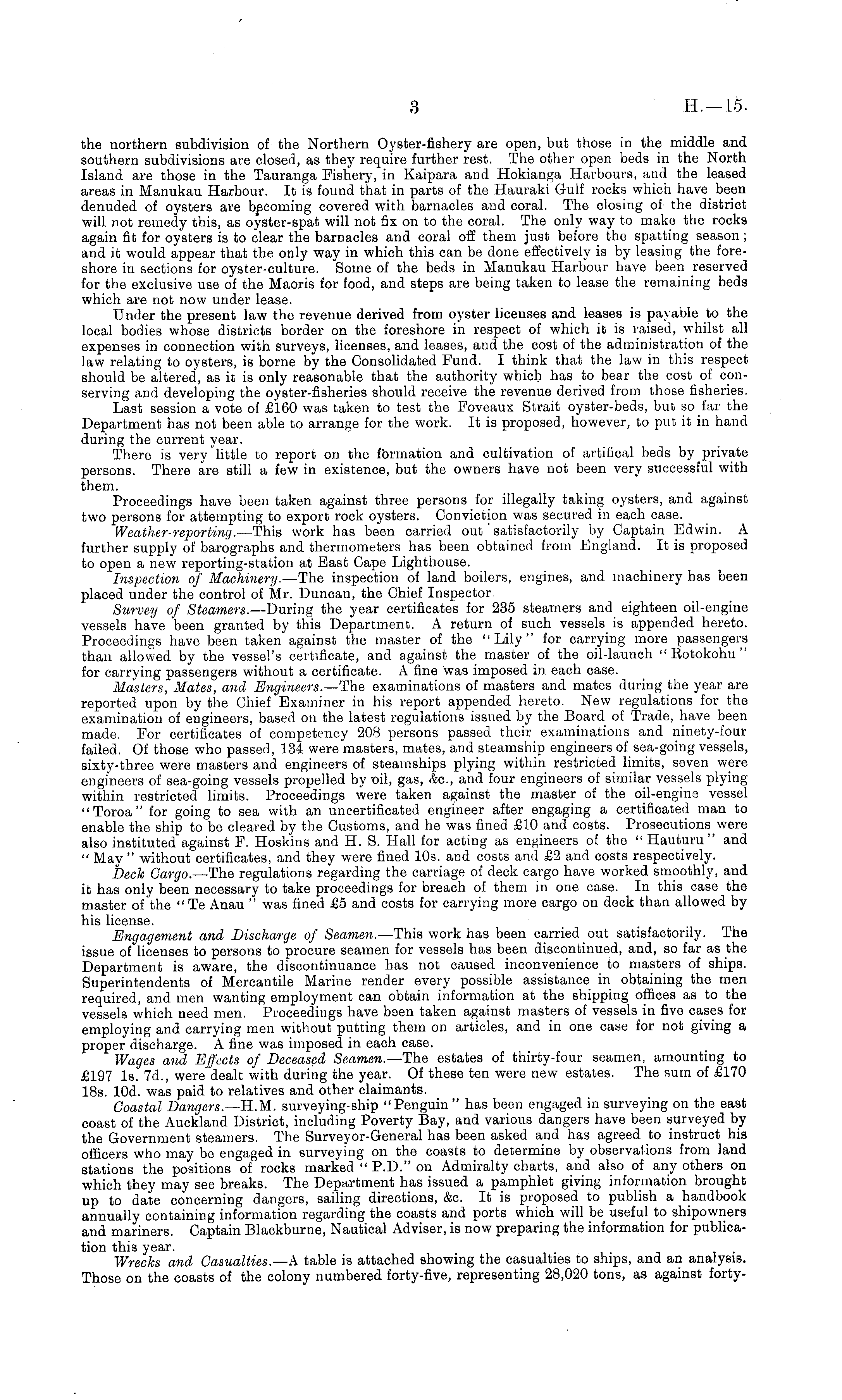 the northern subdivision of the Northern Oyster-fishery are open, but those in the middle and southern subdivisions are closed, as they require further rest. The other open beds in the North Island are those in the Tauranga Fishery, in Kaipara and Hokianga Harbours, and the leased areas in Manukau Harbour. It is found that in parts of the Hauraki Gulf rocks which have been denuded of oysters are becoming covered with barnacles and coral. The closing of the district will not remedy this, as oyster-spat will not fix on to the coral. The only way to make the rocks again fit for oysters is to clear the barnacles and coral off them just before the spatting season; and it would appear that the only way in which this can be done effectively is by leasing the foreshore in sections for oyster-culture. Some of the beds in Manukau Harbour have been reserved for the exclusive use of the Maoris for food, and steps are being taken to lease the remaining beds which are not now under lease. Under the present law the revenue derived from oyster licenses and leases is payable to the local bodies whose districts border on the foreshore in respect of which it is raised, whilst all expenses in connection with surveys, licenses, and leases, and the cost of the administration of the law relating to oysters, is borne by the Consolidated Fund. I think that the law in this respect should be altered, as ie is only reasonable that the authority which has to bear the cost of conserving and developing the oyster-fisheries should receive the revenue derived from those fisheries. Last session a vote of £160 was taken to test the Foveaux Strait oyster-beds, but so far the Department has not been able to arrange for the work. It is proposed, however, to put it in hand during the current year. There is very "little to report on the formation and cultivation of artifical beds by private persons. There are still a few in existence, but the owners have not been very successful with them. Proceedings have been taken against three persons for illegally taking oysters, and against two persons for attempting to export rock oysters. Conviction was secured in each case. Weather-reporting. —This work has been carried out' satisfactorily by Captain Edwin. A further supply of barographs and thermometers has been obtained from England. It is proposed to open a new reporting-station at East Cape Lighthouse. Inspection of Machinery. —The inspection of land boilers, engines, and machinery has been placed under the control of Mr. Duncan, the Chief Inspector. Survey of Steamers. —During the year certificates for 235 steamers and eighteen oil-engine vessels have been granted by this Department. A return of such vessels is appended hereto. Proceedings have been taken against the master of the "Lily" for carrying more passengers than allowed by the vessel's certificate, and against the master of the oil-launch " Rotokohu " for carrying passengers without a certificate. A fine was imposed in each case. Masters, Mates, and Engineers.—The examinations of masters and mates during the year are reported upon by the Chief Examiner in his report appended hereto. New regulations for the examination of engineers, based on the latest regulations issued by the Board of Trade, have been made. For certificates of competency 208 persons passed their examinations and ninety-four failed. Of those who passed, 134 were masters, mates, and steamship engineers of sea-going vessels, sixty-three were masters and engineers of steamships plying within restricted limits, seven were engineers of sea-going vessels propelled by oil, gas, &c, and four engineers of similar vessels plying within restricted limits. Proceedings were taken against the master of the oil-engine vessel "Toroa" for going to sea with an uncertificated engineer after engaging a certificated man to enable the ship to be cleared by the Customs, and he was fined £10 and costs. Prosecutions were also instituted against F. Hoskins and H. S. Hall for acting as engineers of the " Hauturu " and " May " without certificates, and they were fined 10s. and costs and £2 and costs respectively. Deck Cargo. —The regulations regarding the carriage of deck cargo have worked smoothly, and it has only been necessary to take proceedings for breach of them in one case. In this case the master of the "Te Anau " was fined £5 and costs for carrying more cargo on deck than allowed by his license. Engagement and Discharge of Seamen. —This work has been carried out satisfactorily. The issue of licenses to persons to procure seamen for vessels has been discontinued, and, so far as the Department is aware, the discontinuance has not caused inconvenience to masters of ships. Superintendents of Mercantile Marine render every possible assistance in obtaining the men required, and men wanting employment can obtain information at the shipping offices as to the vessels which need men. Proceedings have been taken against masters of vessels in five cases for employing and carrying men without putting them on articles, and in one case for not giving a proper discharge. A fine was imposed in each case. Wages and Effects of Deceased Seamen. —The estates of thirty-four seamen, amounting to £197 Is. 7d., were dealt with during the year. Of these ten were new estates. The sum of £170 18s. 10d. was paid to relatives and other claimants. Coastal Dangers.— H.M. surveying-ship "Penguin " has been engaged in surveying on the east coast of the Auckland District, including Poverty Bay, and various dangers have been surveyed by the Government steamers. The Surveyor-General has been asked and has agreed to instruct his officers who may be engaged in surveying on the coasts to determine by observations from land stations the positions of rocks marked " P.D." on Admiralty charts, and also of any others on which they may see breaks. The Department has issued a pamphlet giving information brought up to date concerning dangers, saili