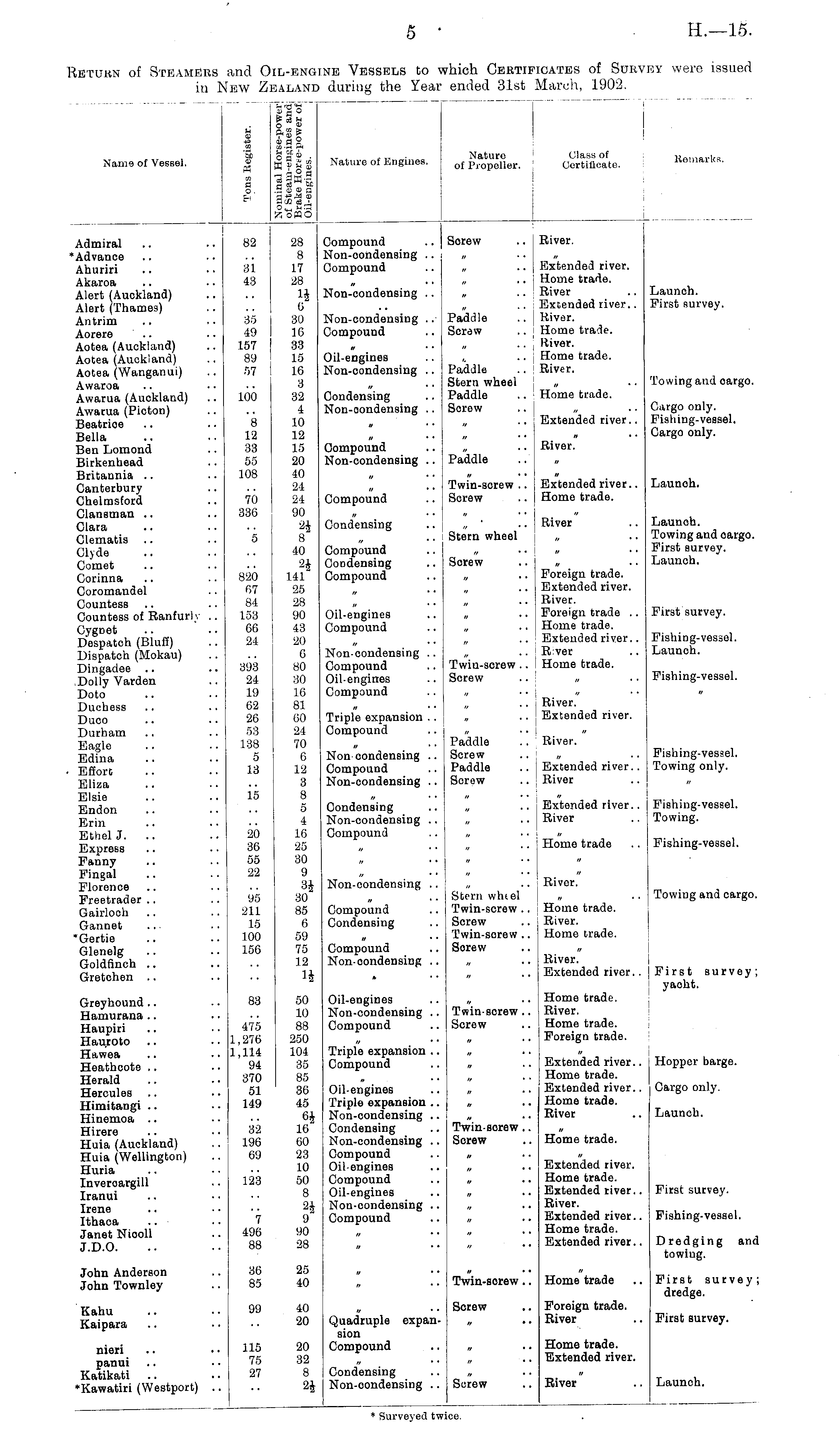 Return of Steamers and Oil-engine Vessels to which Certificates of Survey were issued in New Zealand during the Year ended 31st March, 1902.